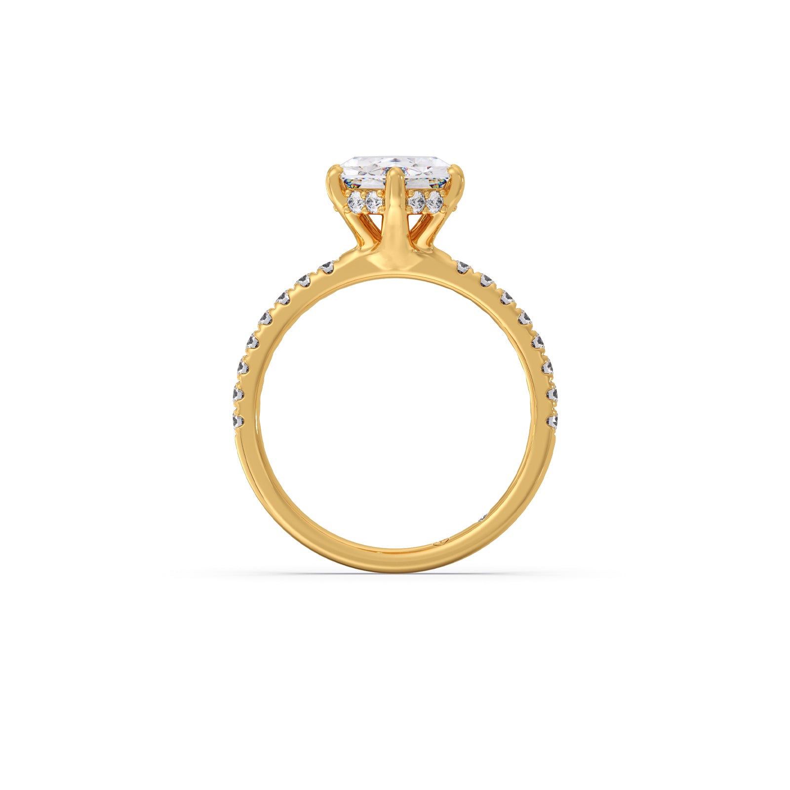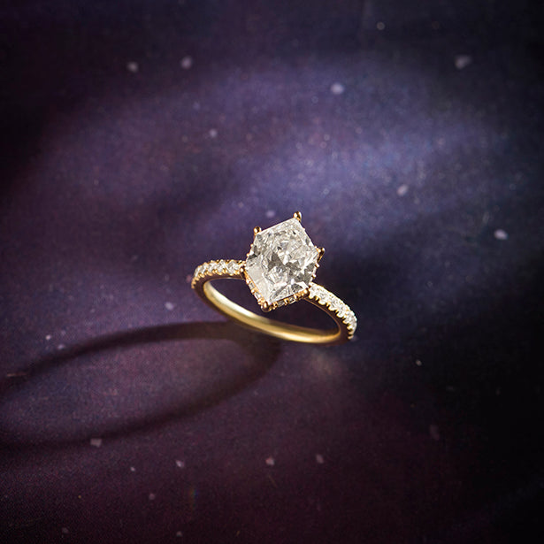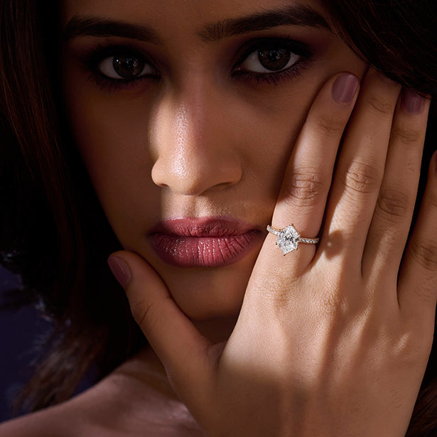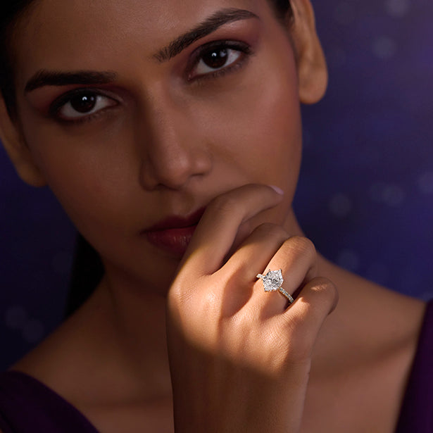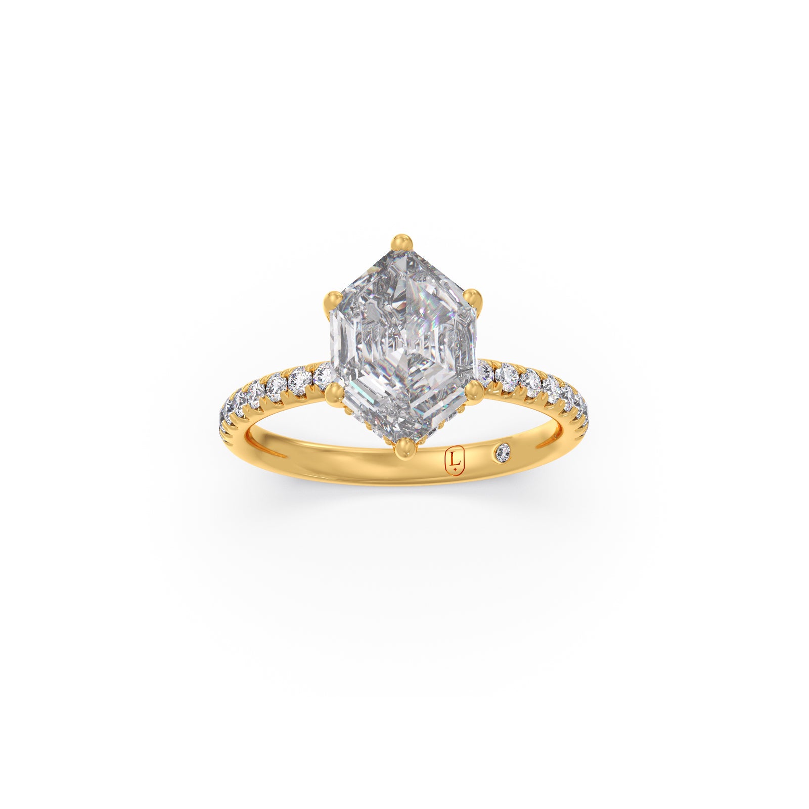 Crafted for the moment you choose forever. A 2.5 ct. Hexa solitaire radiates from a shank adorned with 28 round diamonds—each a reflection of the path you walked to love. One hidden diamond within, for the quiet strength that led you here.