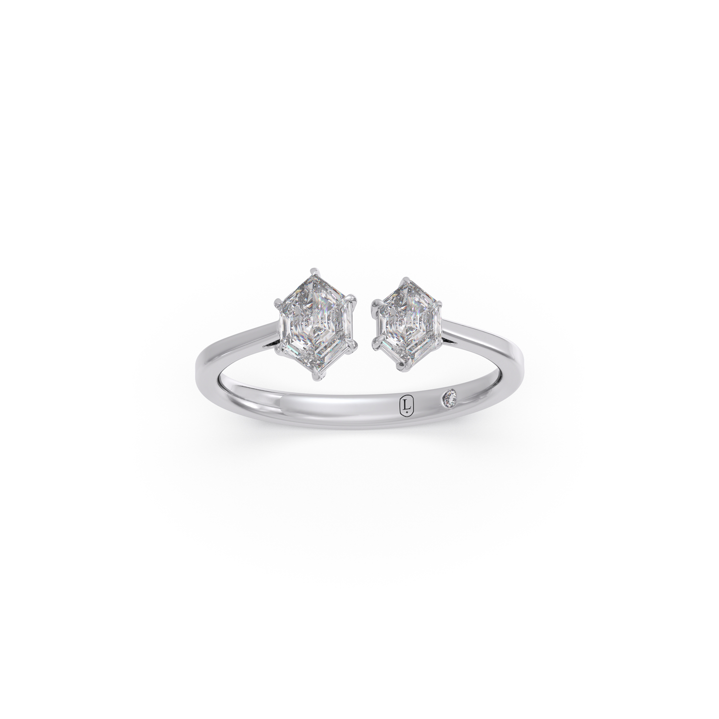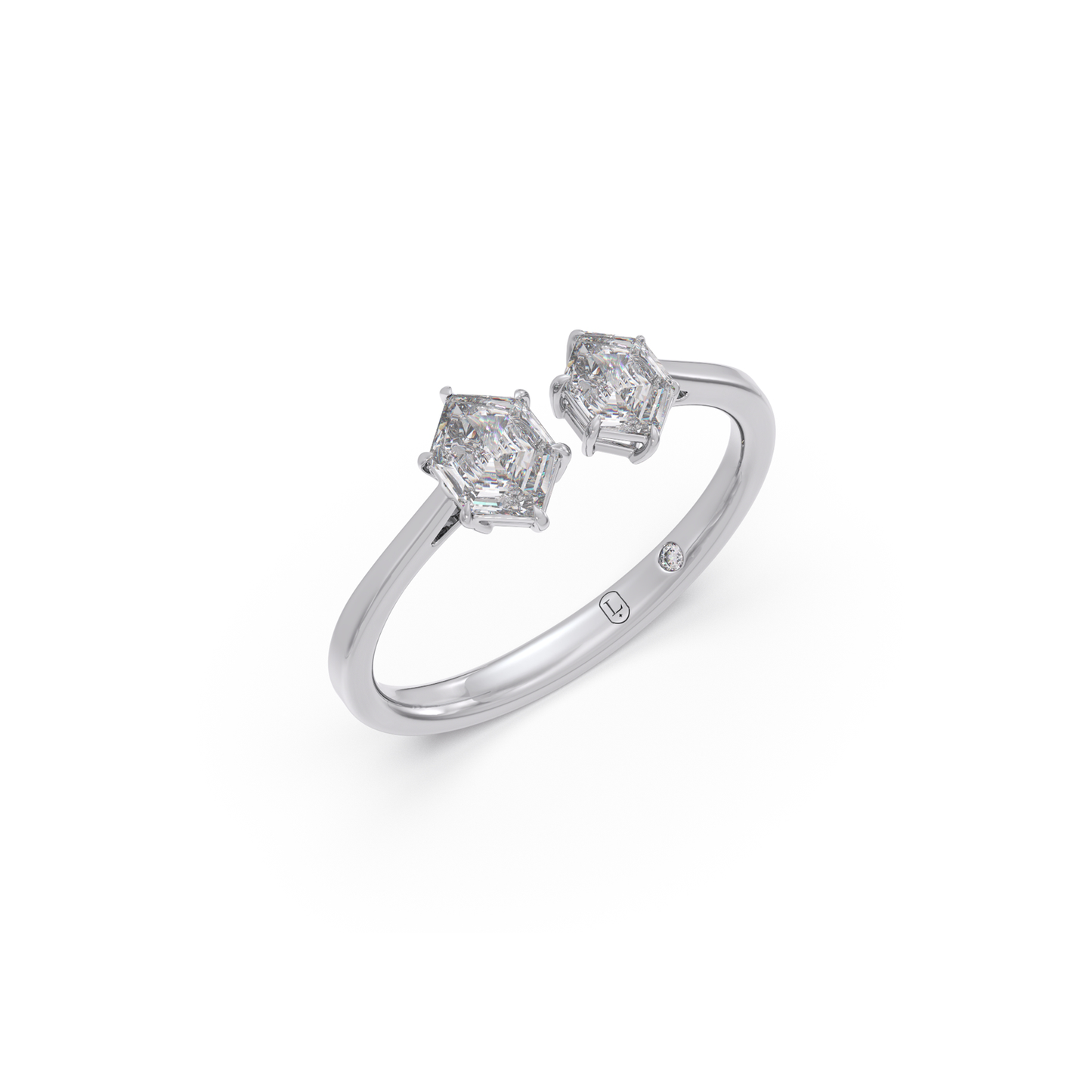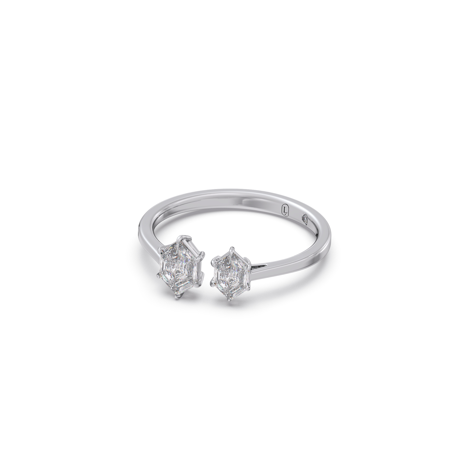 A reflection of life’s transformative journey, the Hexa Two-Stone Solitaire Ring features 0.45 ct. and 0.3 ct. Hexa Diamonds poised across an open gap, accented by a 0.008 ct. round diamond. Each facet symbolizes growth and resilience, celebrating strength and harmony through life’s ever‑changing phases.