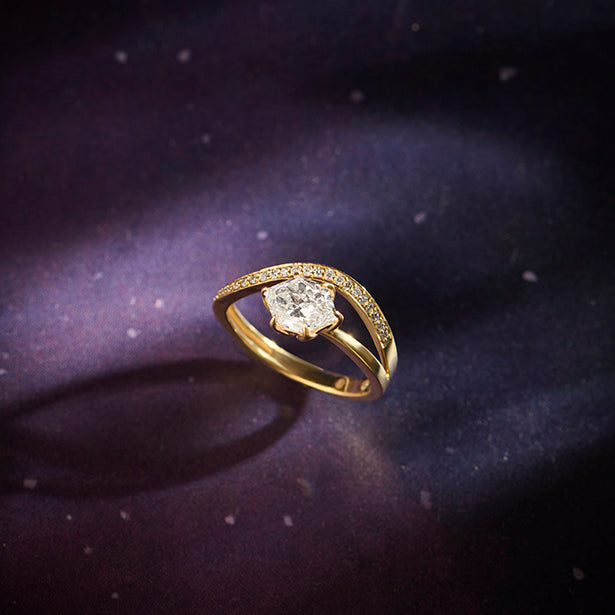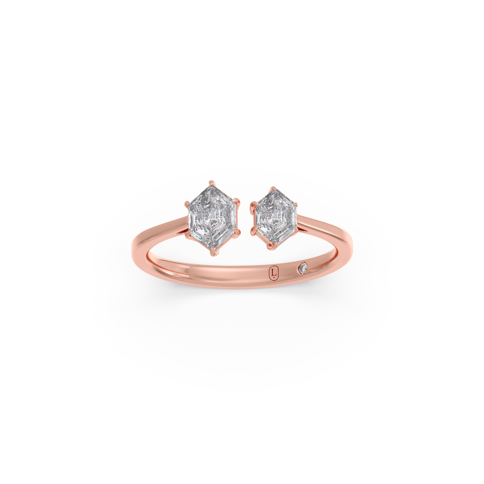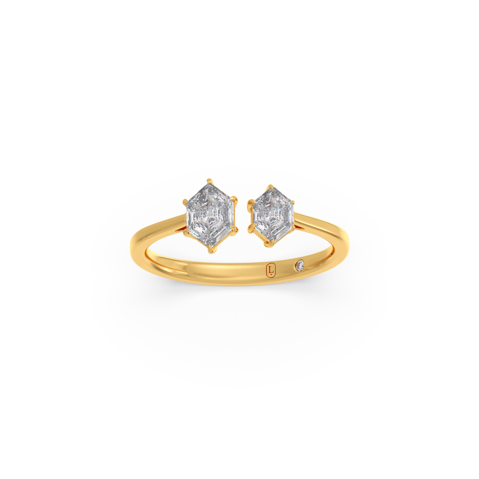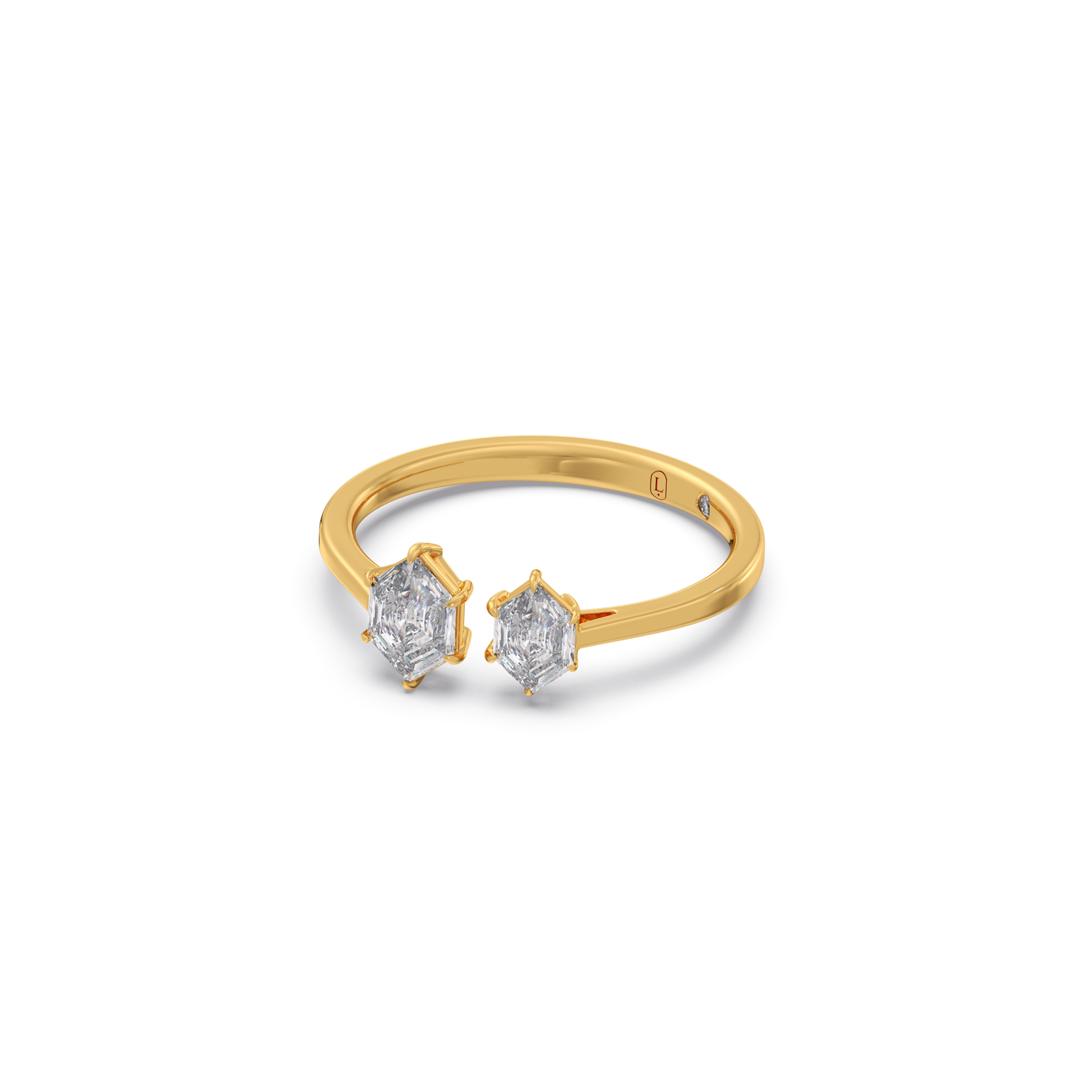 A reflection of life’s transformative journey, the Hexa Two-Stone Solitaire Ring features 0.45 ct. and 0.3 ct. Hexa Diamonds poised across an open gap, accented by a 0.008 ct. round diamond. Each facet symbolizes growth and resilience, celebrating strength and harmony through life’s ever‑changing phases.