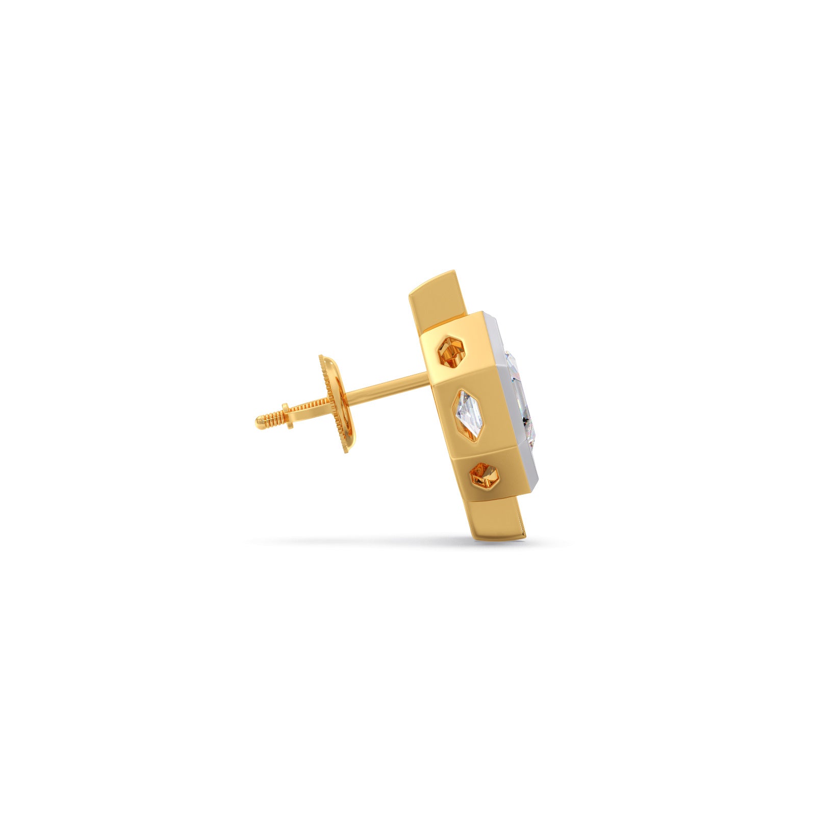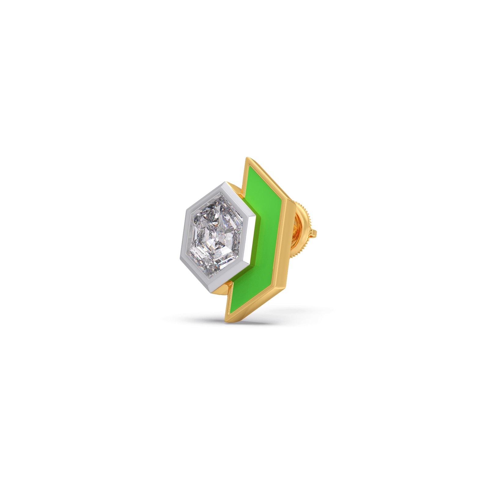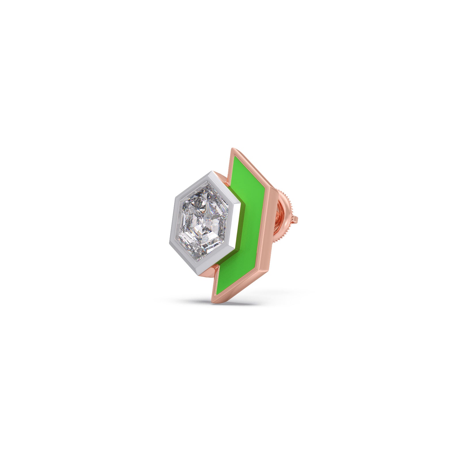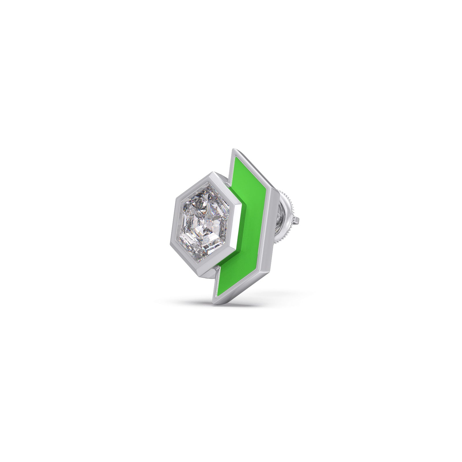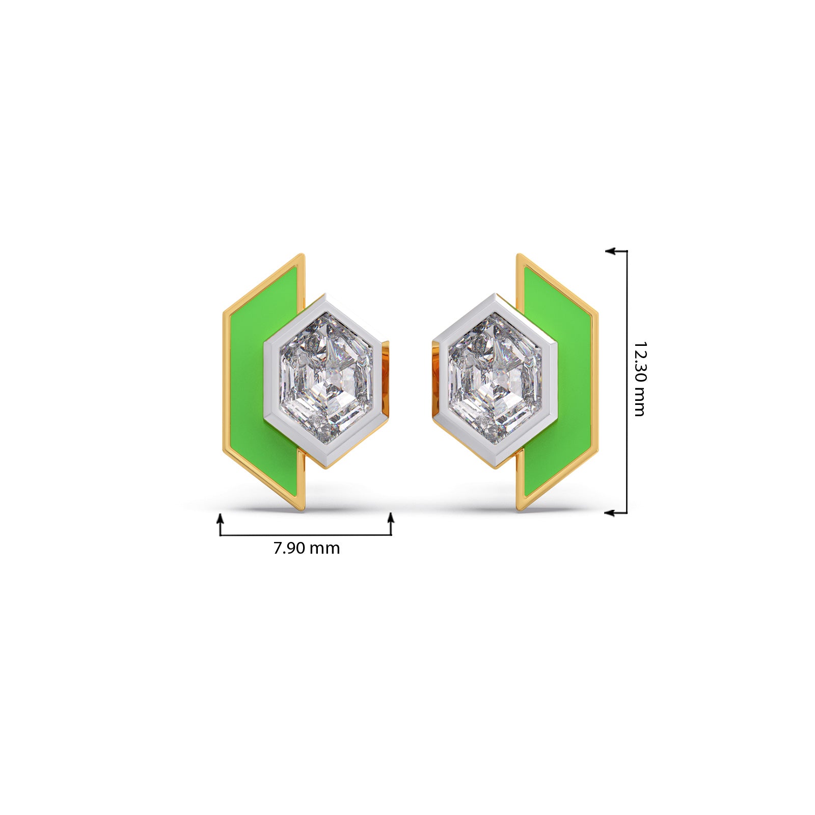 This elegant stud earrings features a sophisticated, half elongated hexagonal silhouette that blends modern geometric design with timeless luxury. A central 1ct Hexa-cut Solitaire diamonds are accent with vibrant green enamel frames. This earring makes it an ideal statement piece for both professional attire and evening wear.