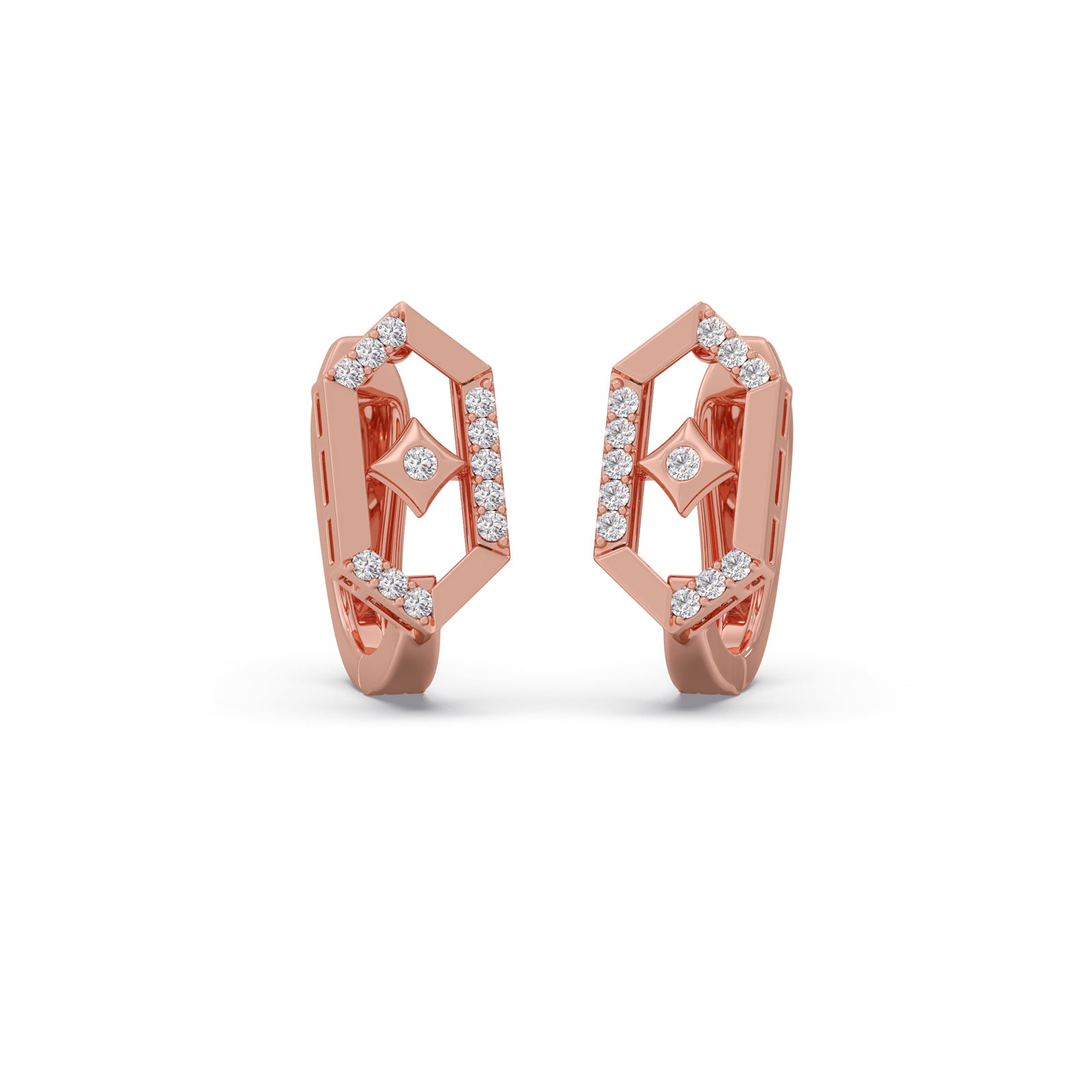 An intricate lattice hexagonal design adorned with shimmering round diamonds. This hoops blends architectural elegance with timeless sparkle, creating a refined statement that complements both everyday and occasion wear.