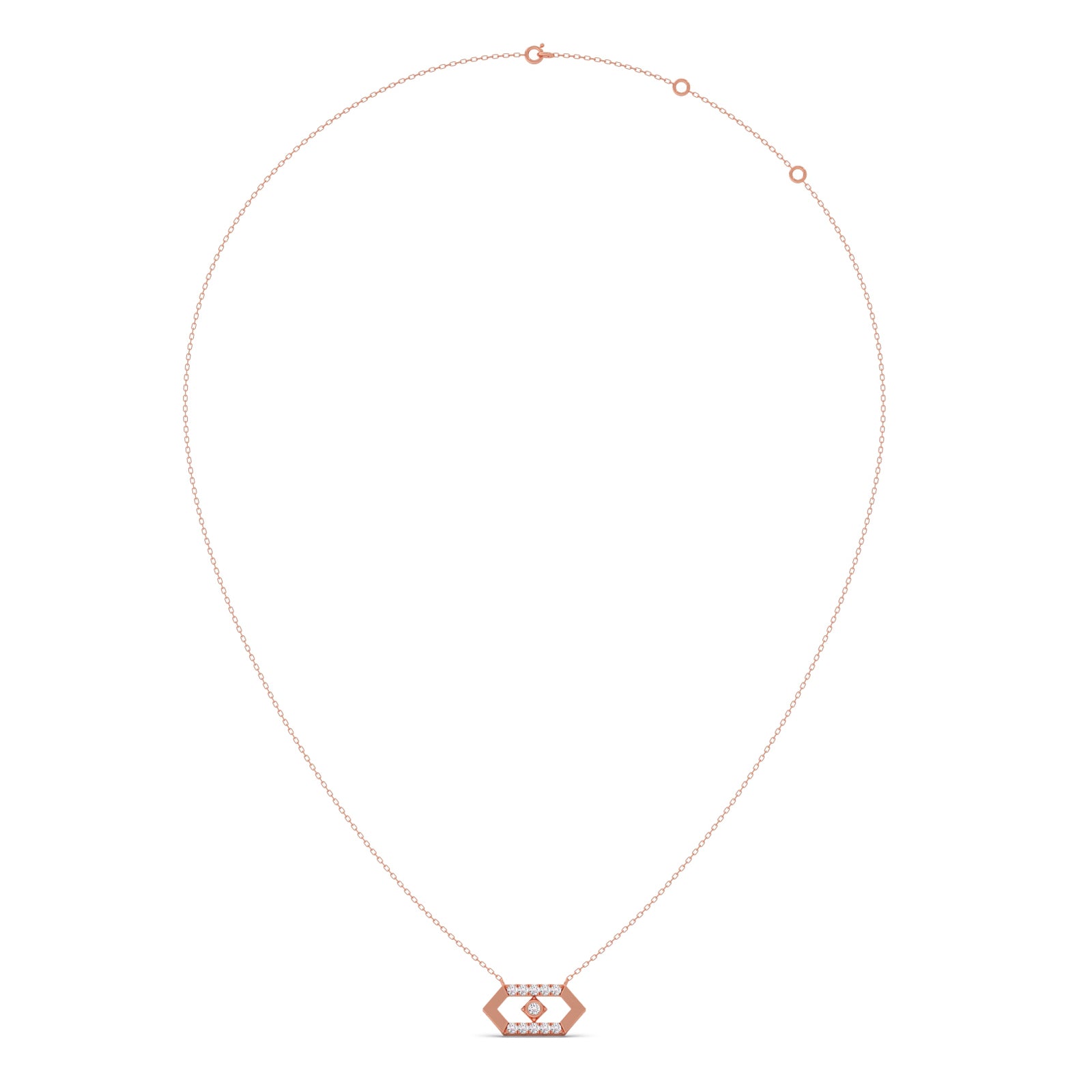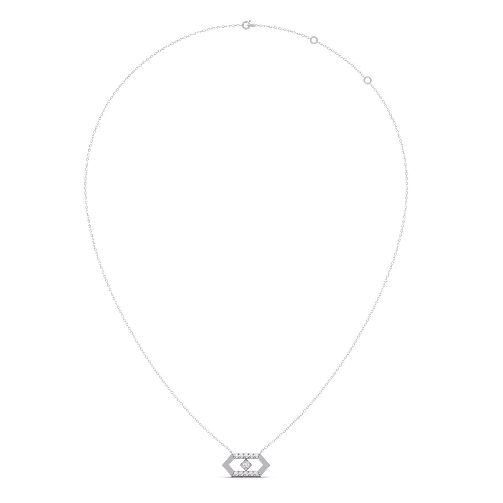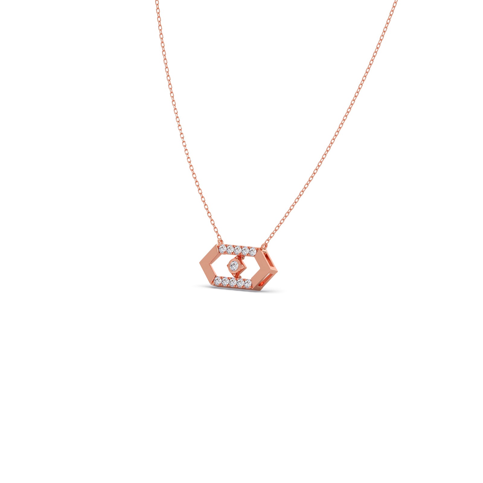 This Hexora-Moving Diamond Nexus Pendant features an elongated hexagonal shape. A single brilliant round-cut diamond is suspended in a "floating" style within a hexagonal frame, surrounded by shimmering round diamonds set in outer frame. These pendant have a bold, architectural profile that makes them suitable for both professional environments and evening wear.