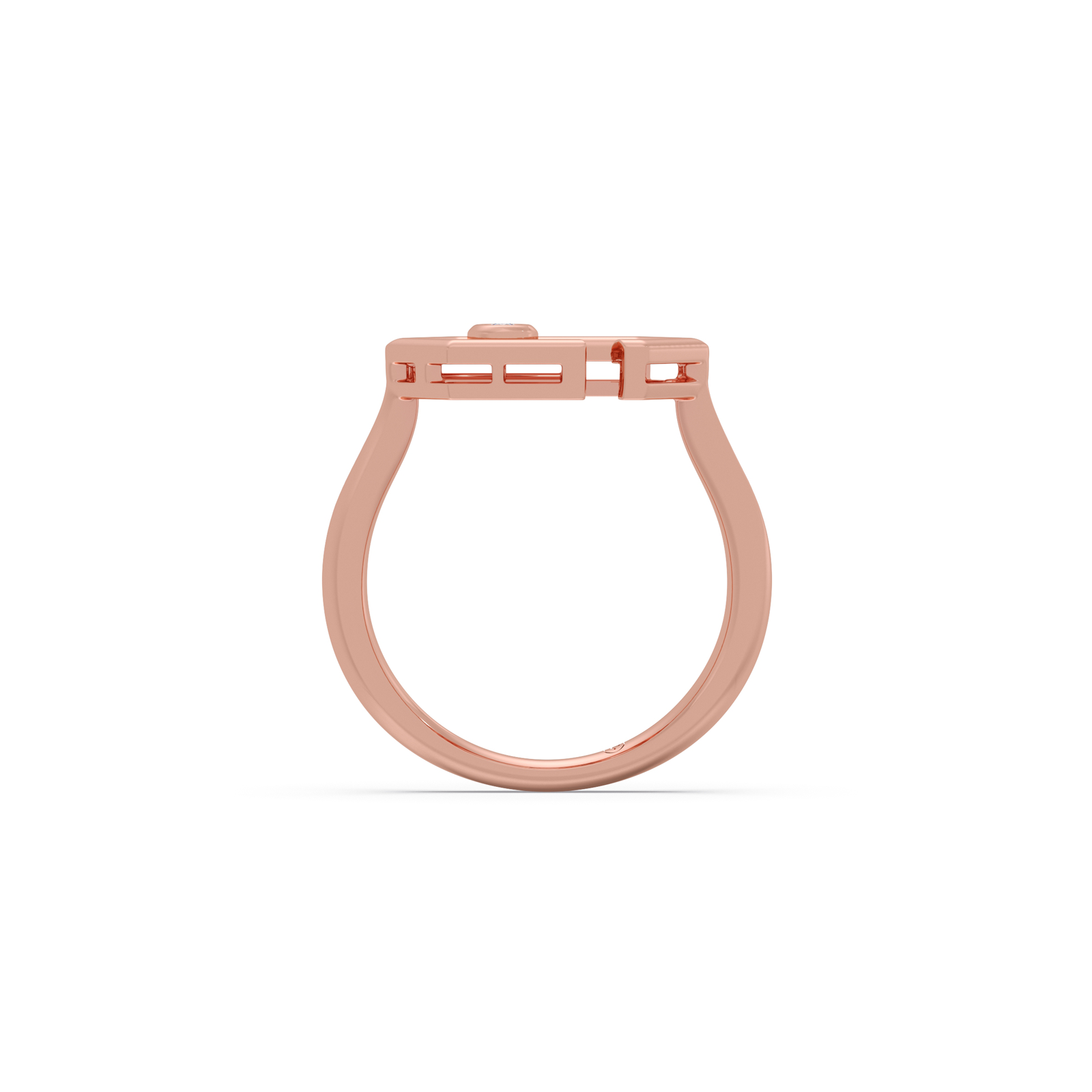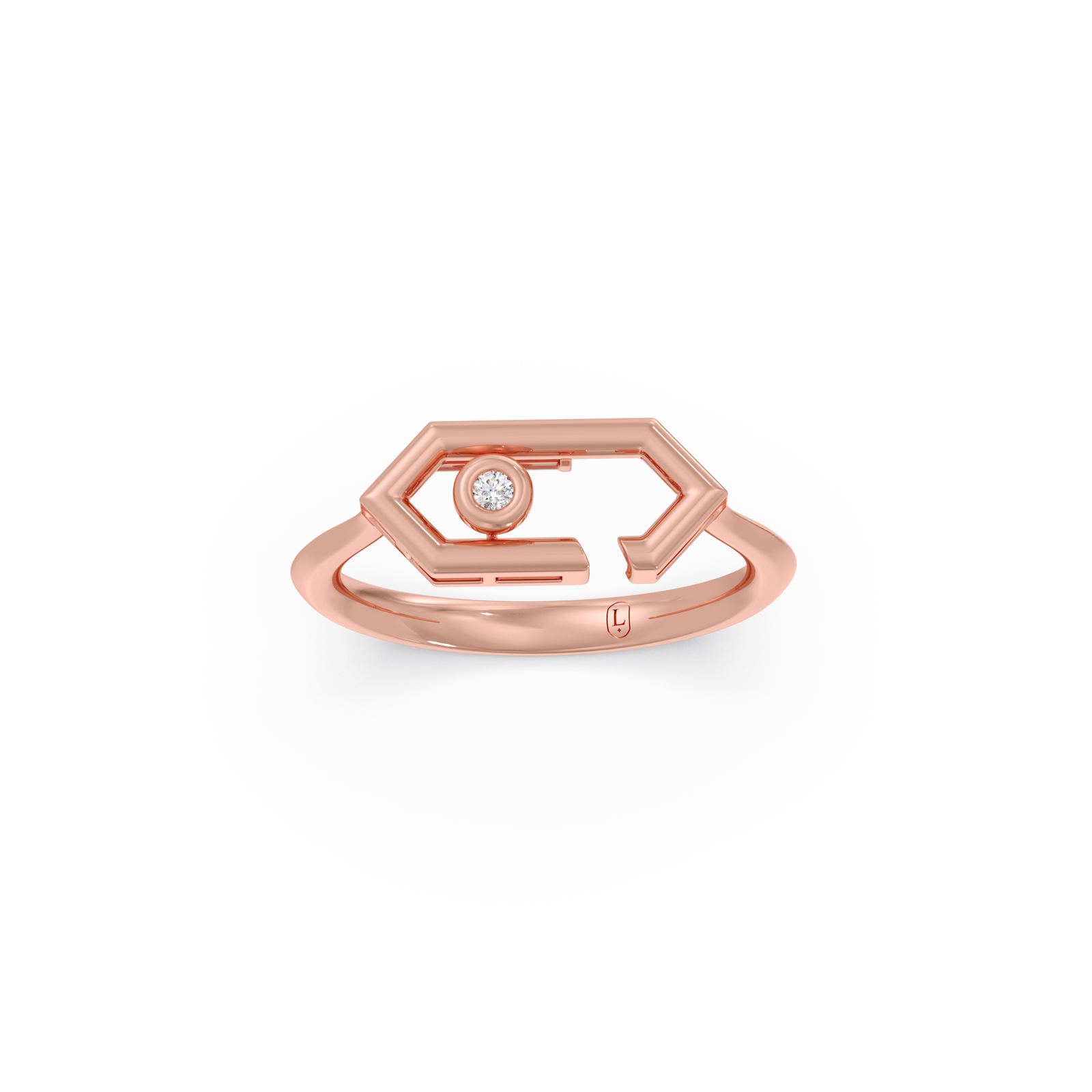 This Hexora-Moving Diamond Ring features an elongated hexagonal shape. A single brilliant round-cut diamond is suspended in a "floating" style within a hexagonal frame. These ring have a bold, architectural profile that makes them suitable for both professional environments and evening wear.