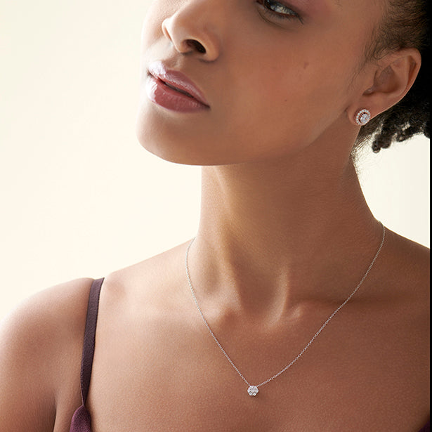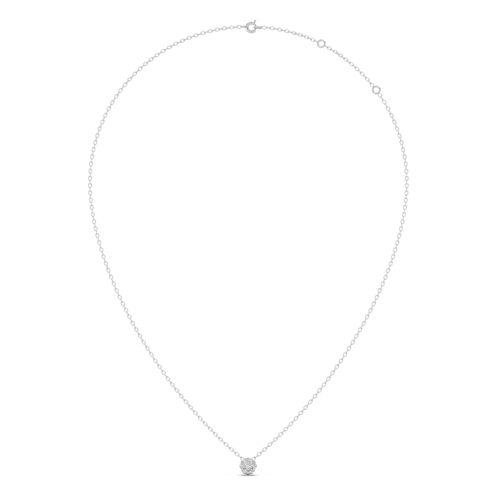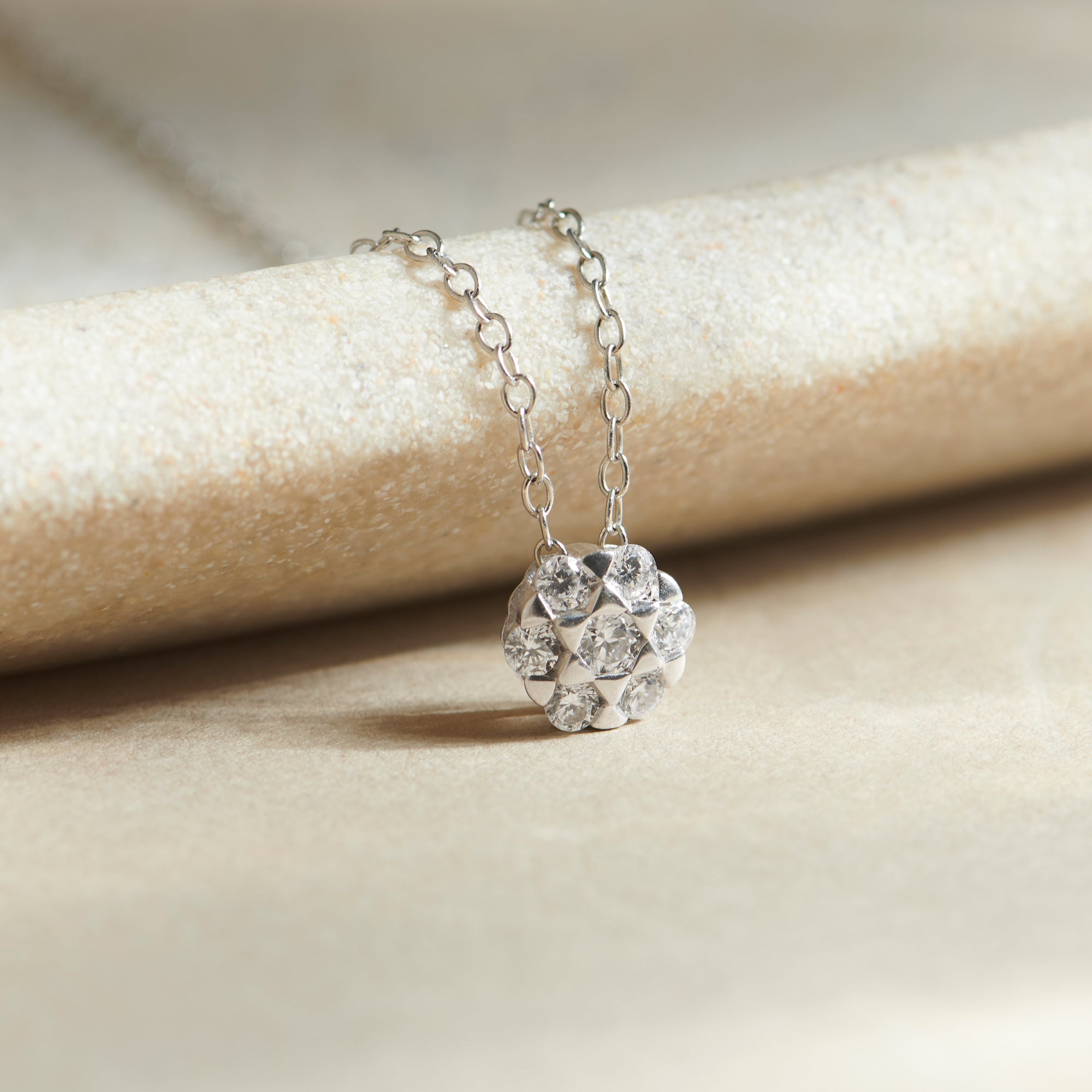 Intricate and luminous, this platinum pendant features a unique honeycomb design that blossoms into a radiant cluster of diamonds. Each precisely set stone catches the light, creating a captivating display of geometric beauty and floral elegance. Suspended from a delicate platinum chain, this pendant adds a touch of modern sophistication and natural charm to any neckline.