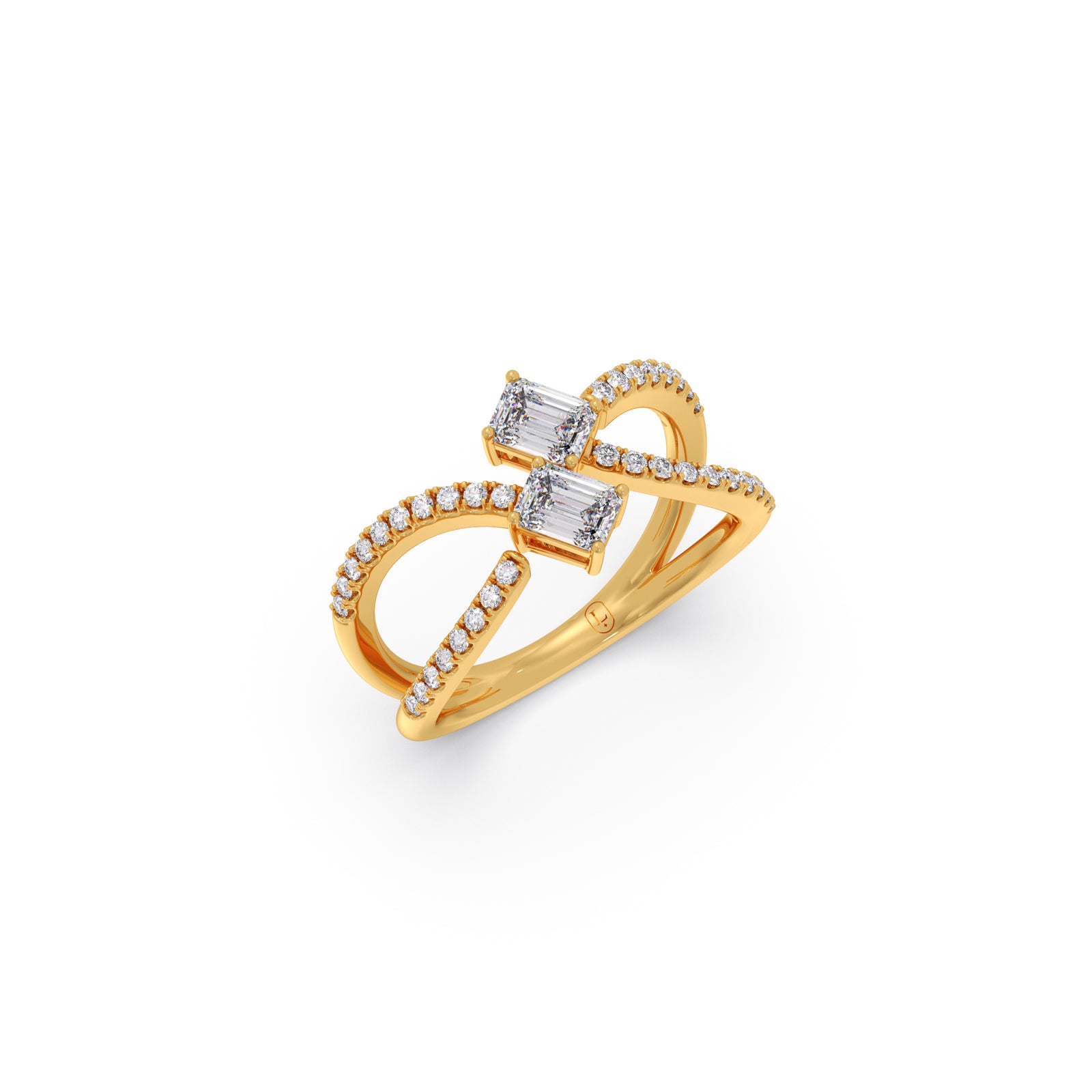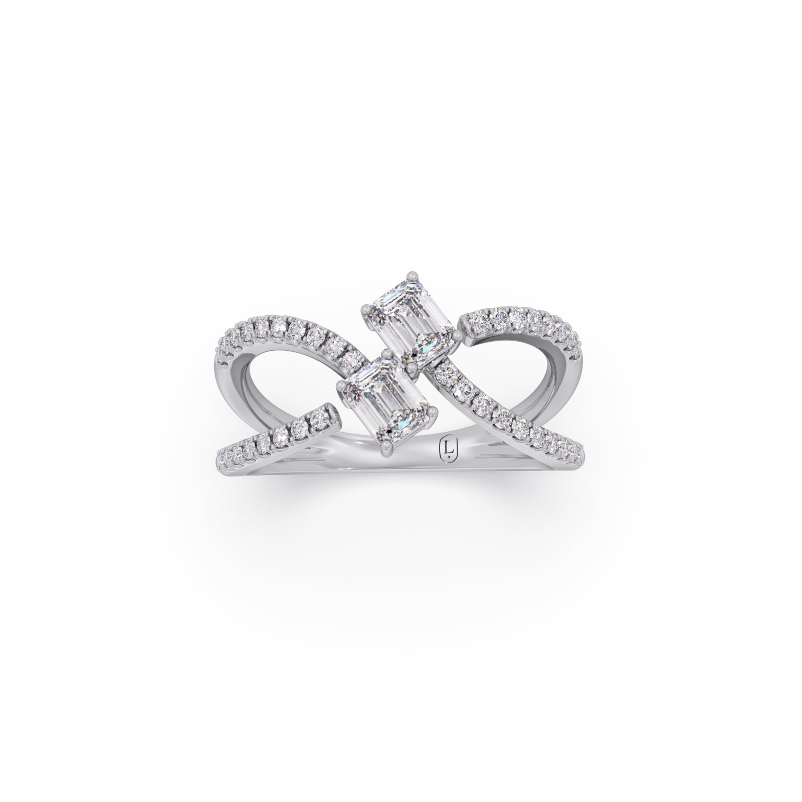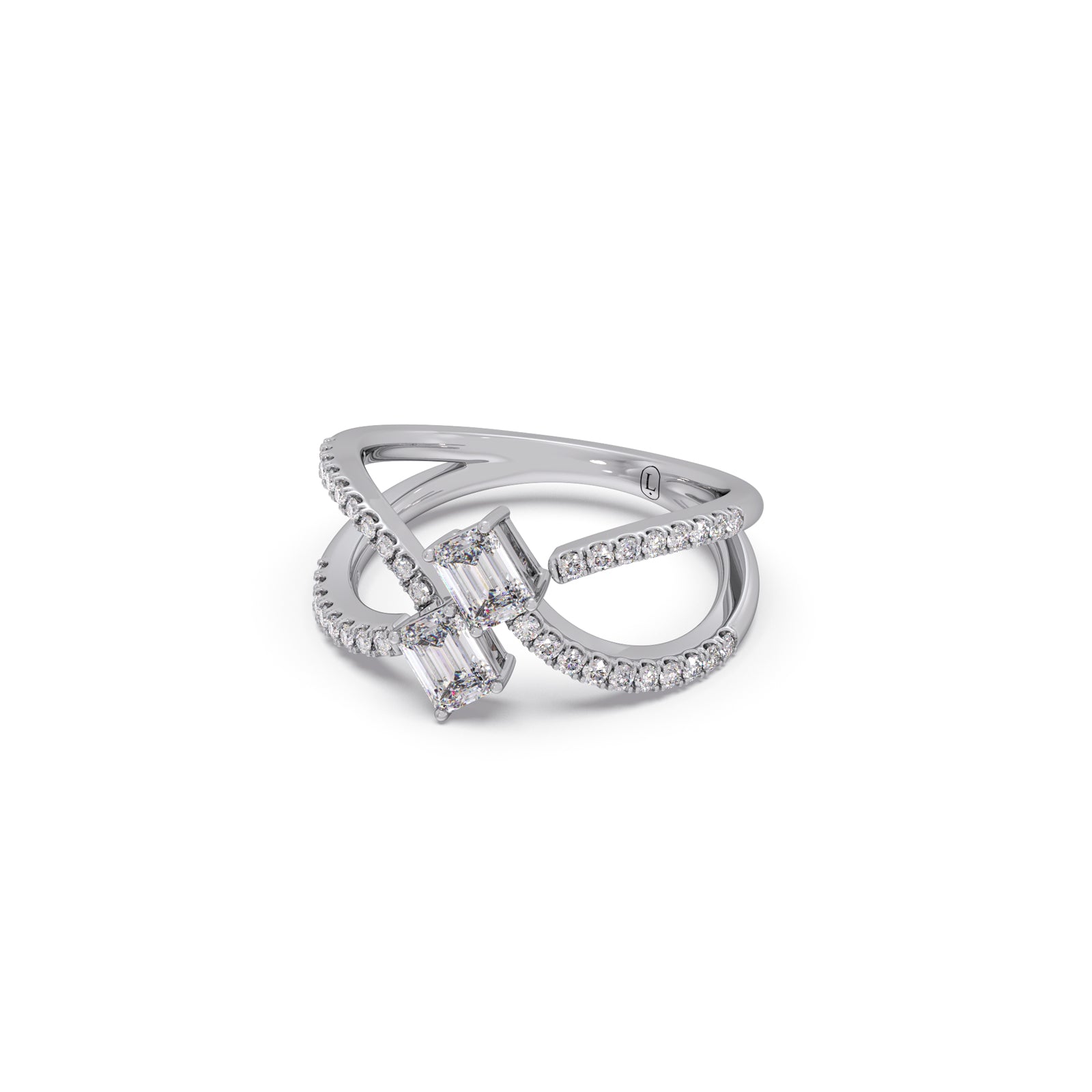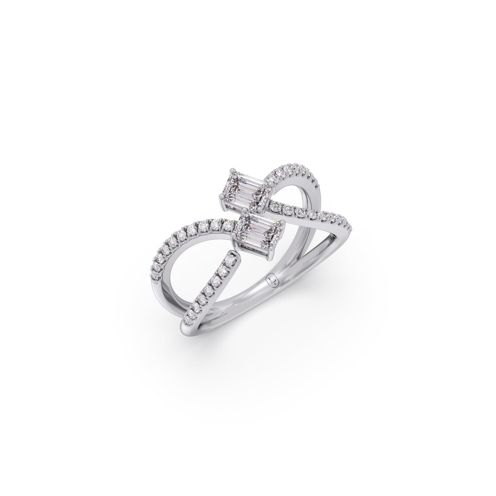 A modern casual ring featuring two striking emerald-cut solitaire diamonds, elegantly intertwined in a unique design. Accentuated with 36 round brilliant diamonds, this ring blends bold geometry with delicate sparkle, offering a distinctive statement of contemporary elegance and timeless charm.