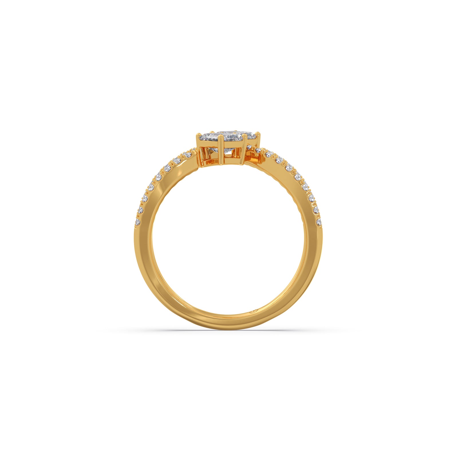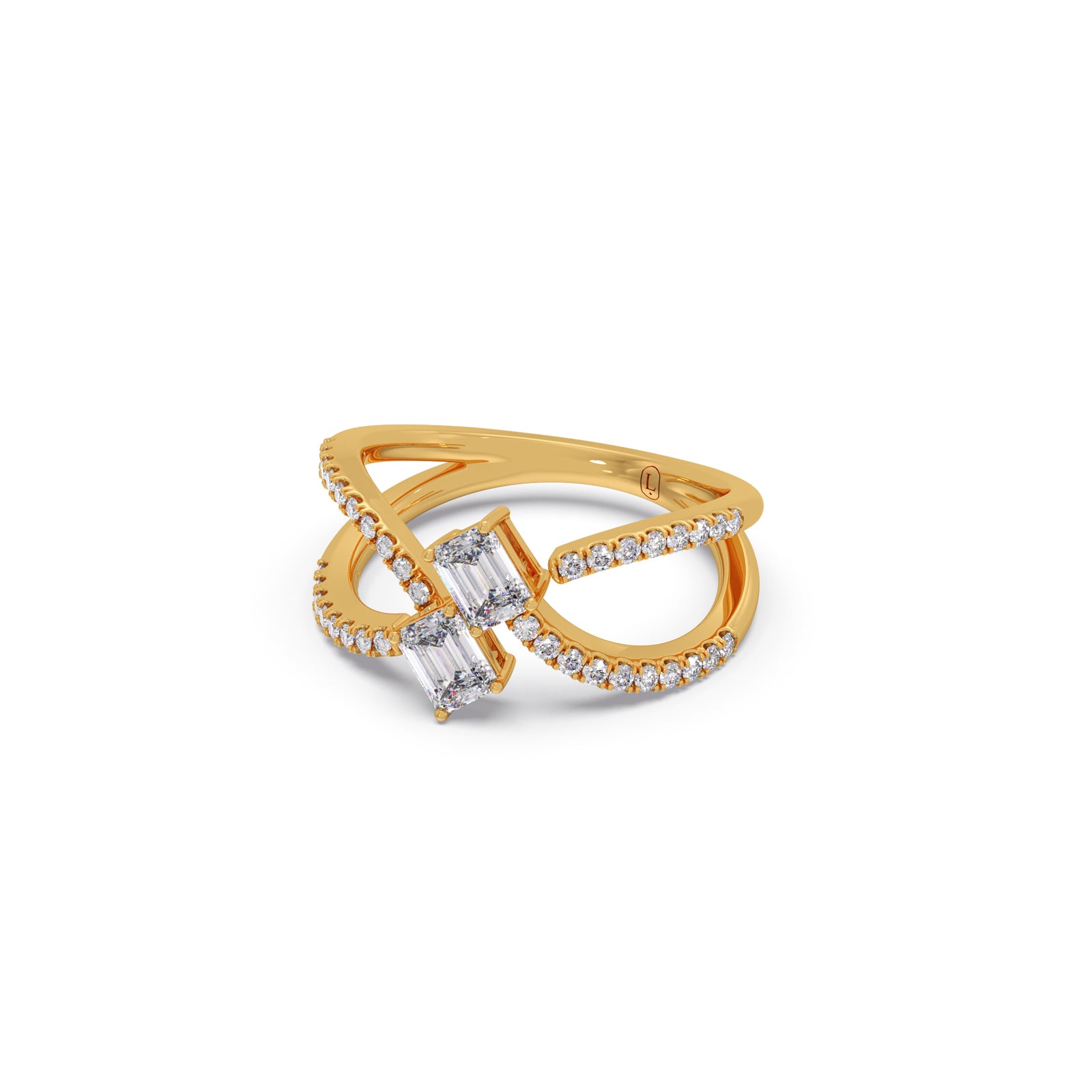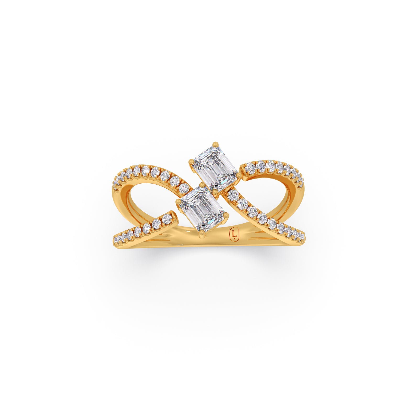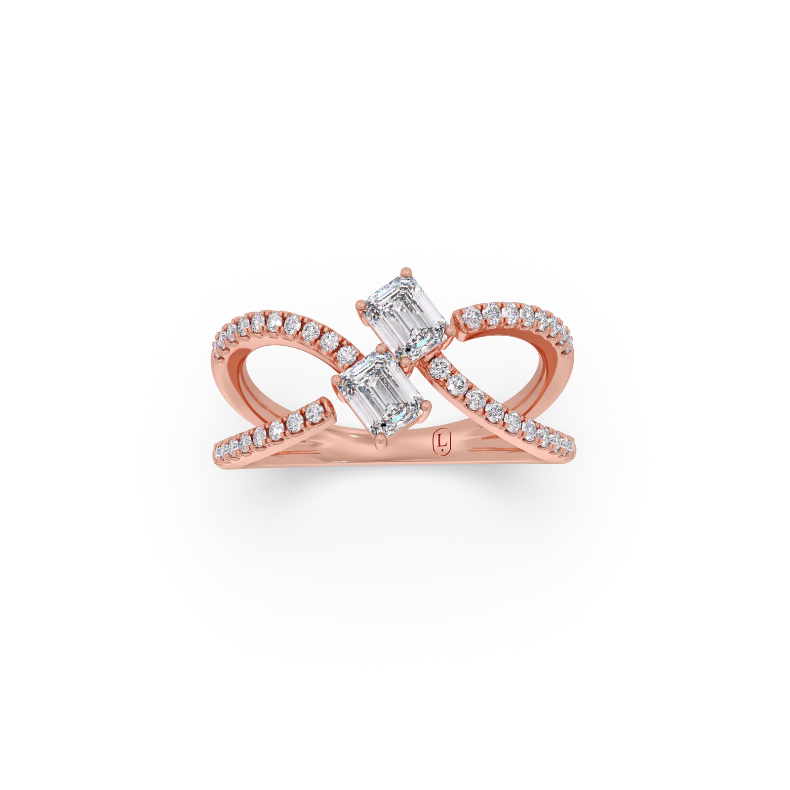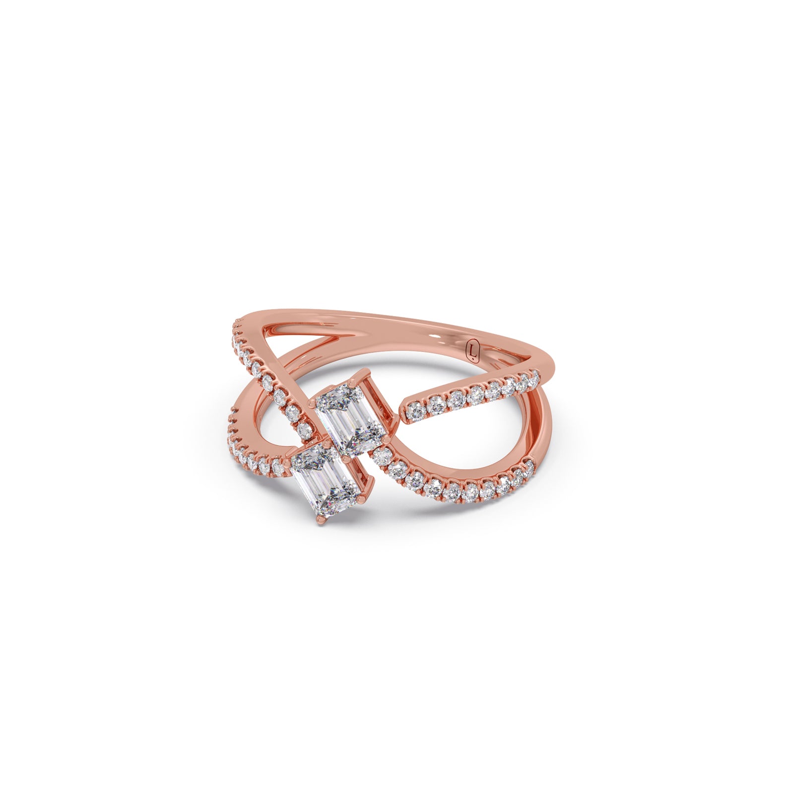 A modern casual ring featuring two striking emerald-cut solitaire diamonds, elegantly intertwined in a unique design. Accentuated with 36 round brilliant diamonds, this ring blends bold geometry with delicate sparkle, offering a distinctive statement of contemporary elegance and timeless charm.