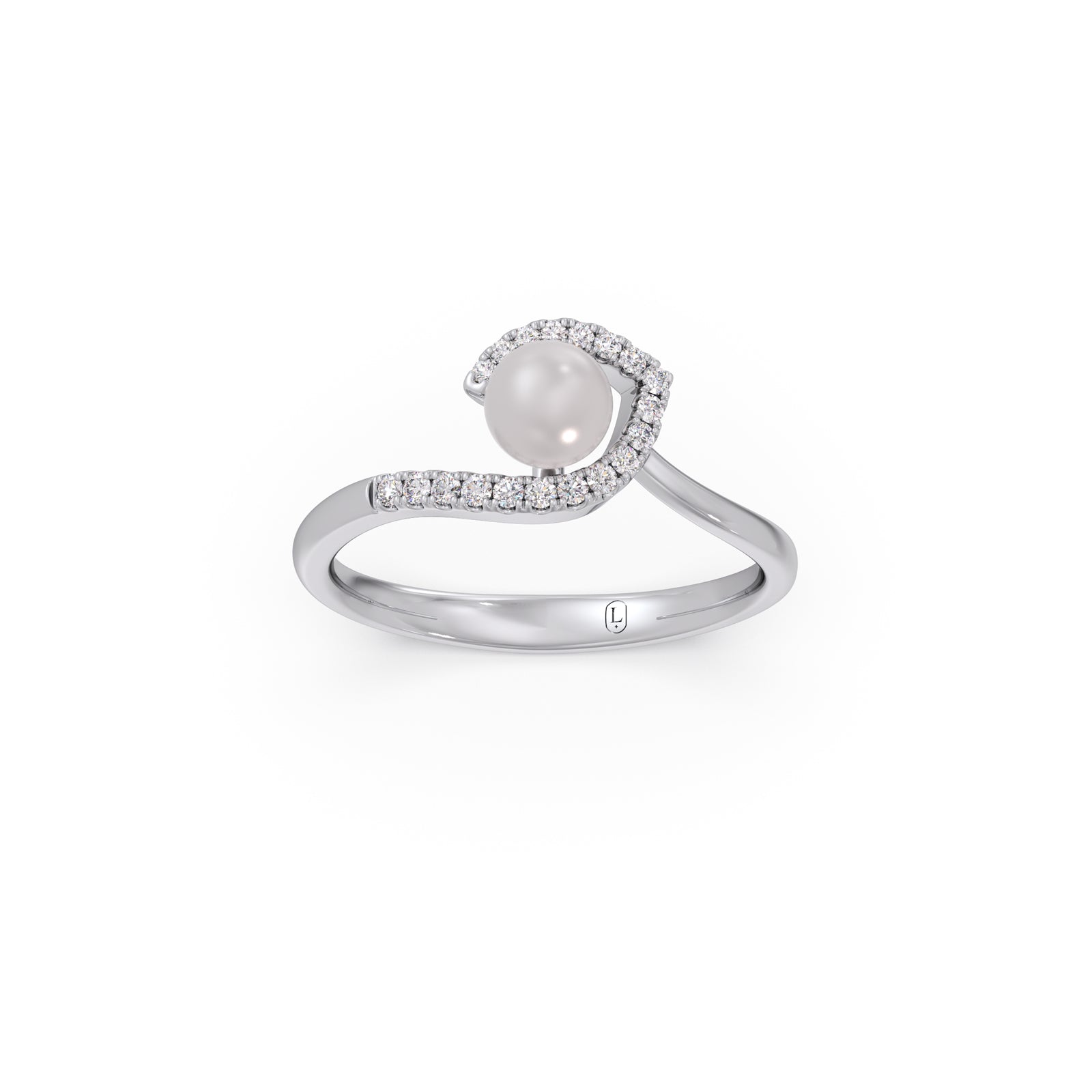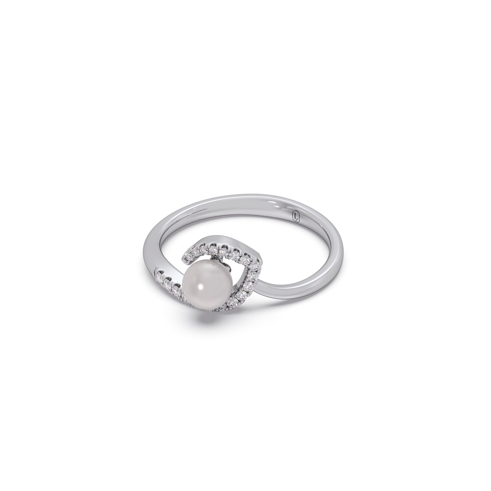 These contemporary ring features a fresh-water pearl, frame by classic round diamonds, creating a crescent-like path that cradles the pearl. This ring is a timeless piece, perfect for adding a touch of understated luxury to any ensemble.
