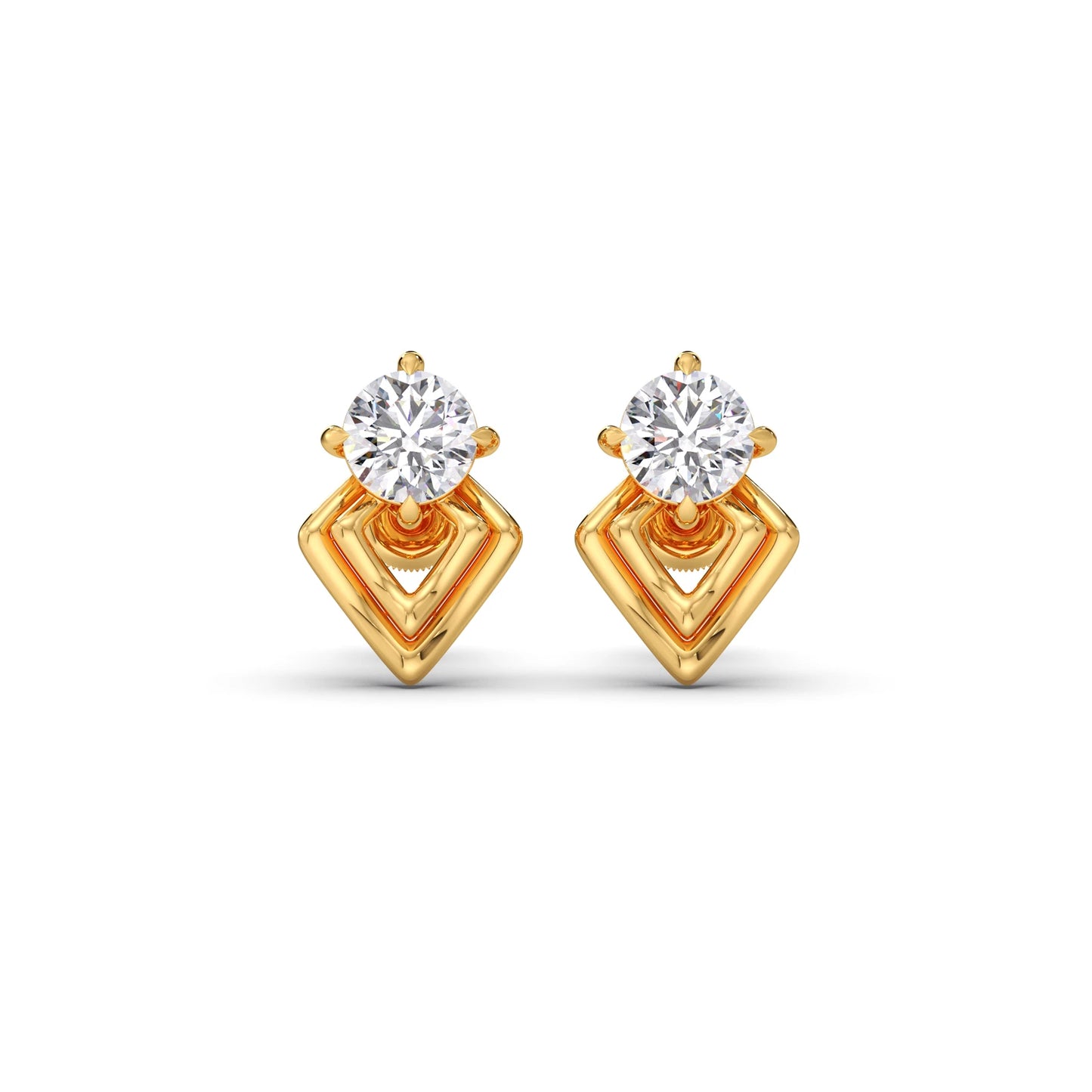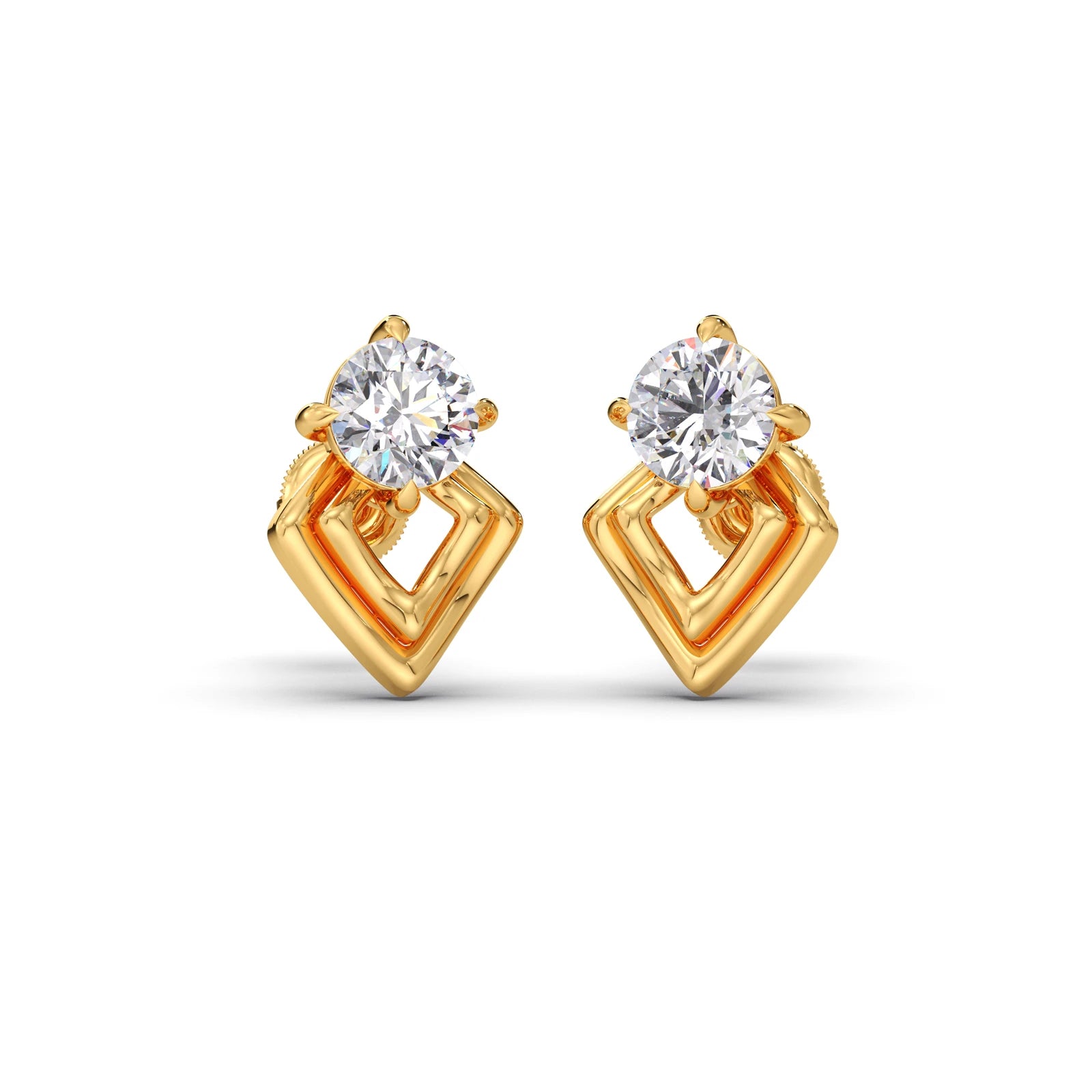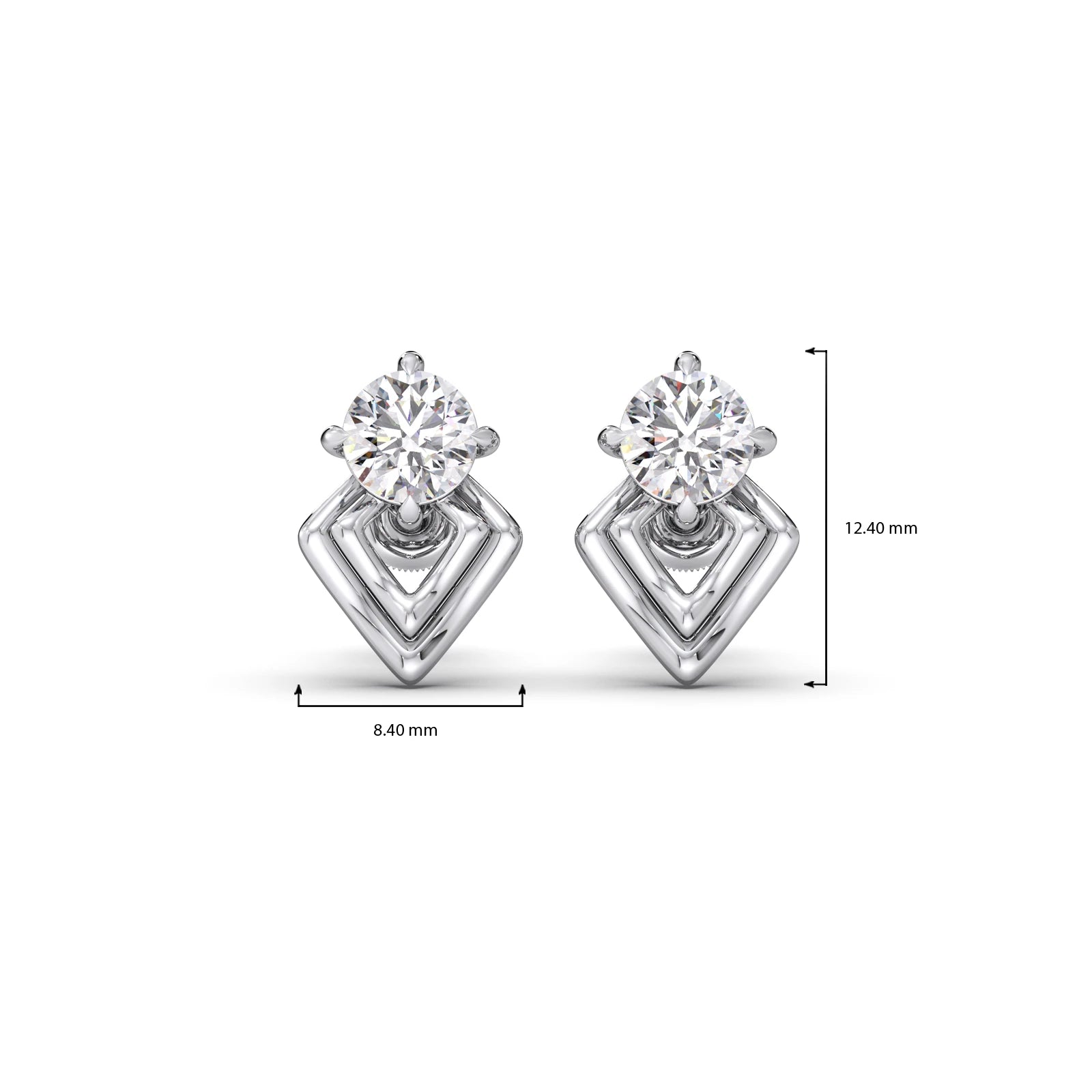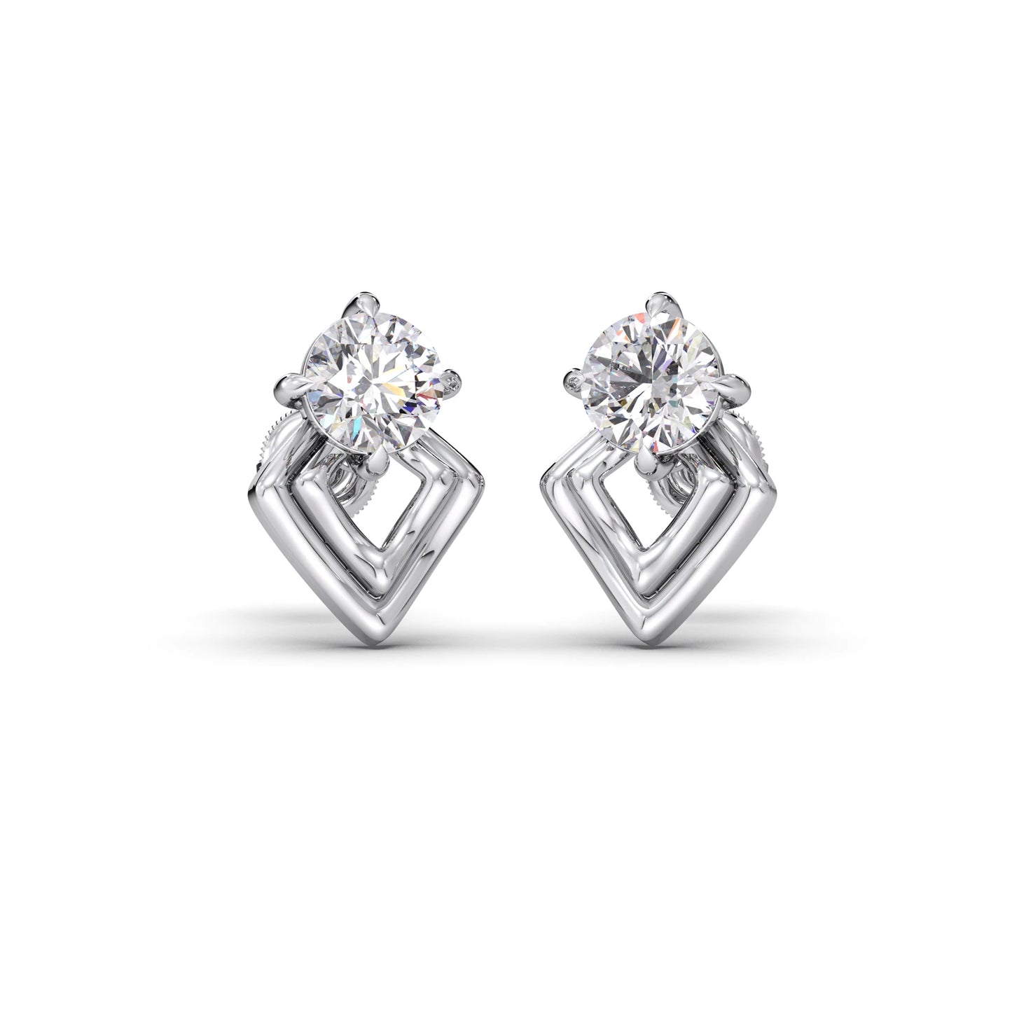 These modern stud earrings feature a sparkling round diamond held in a secure prong setting. An openwork kite-shaped frame elegantly surrounds the center stone, adding a unique geometric flair to this stylish and eye-catching design.