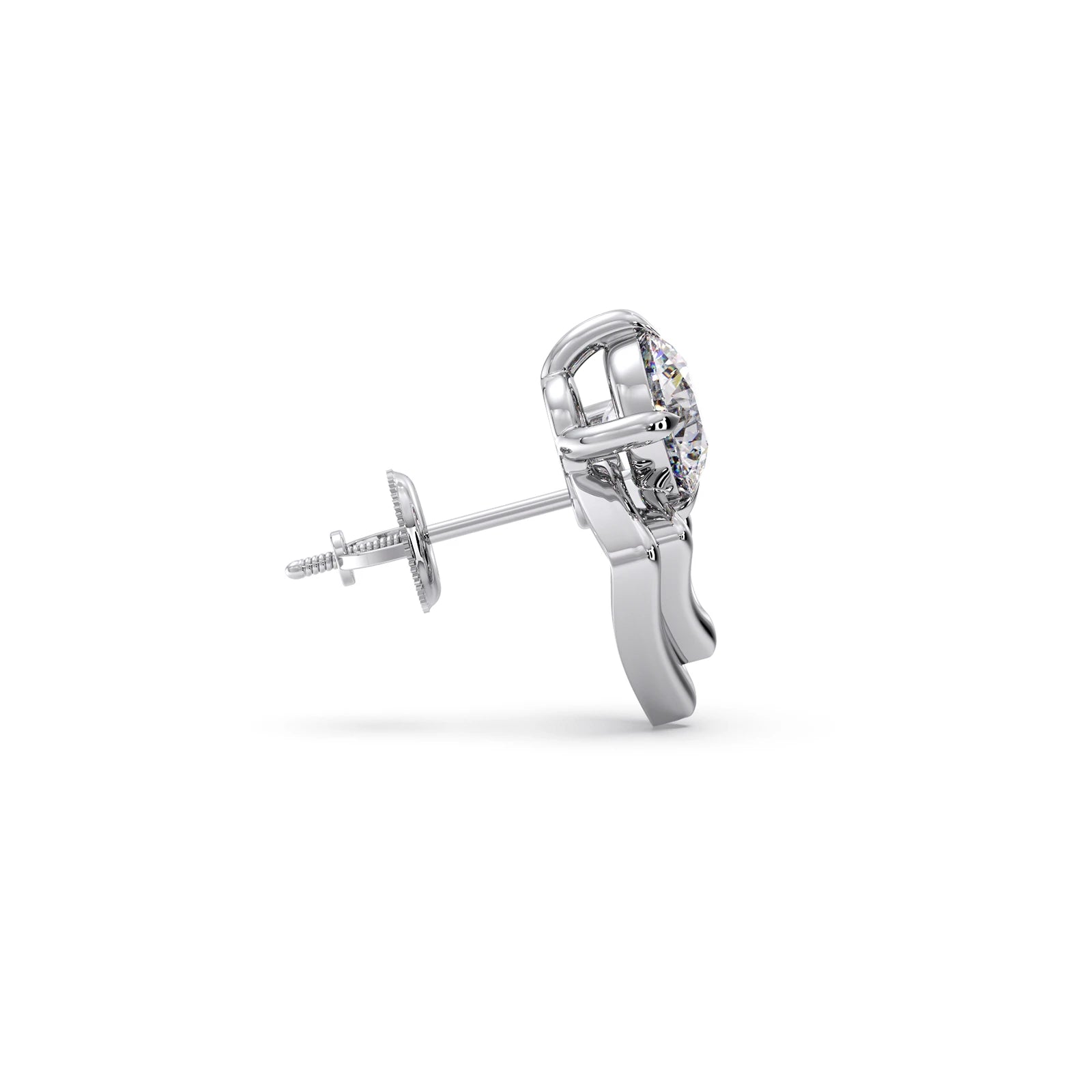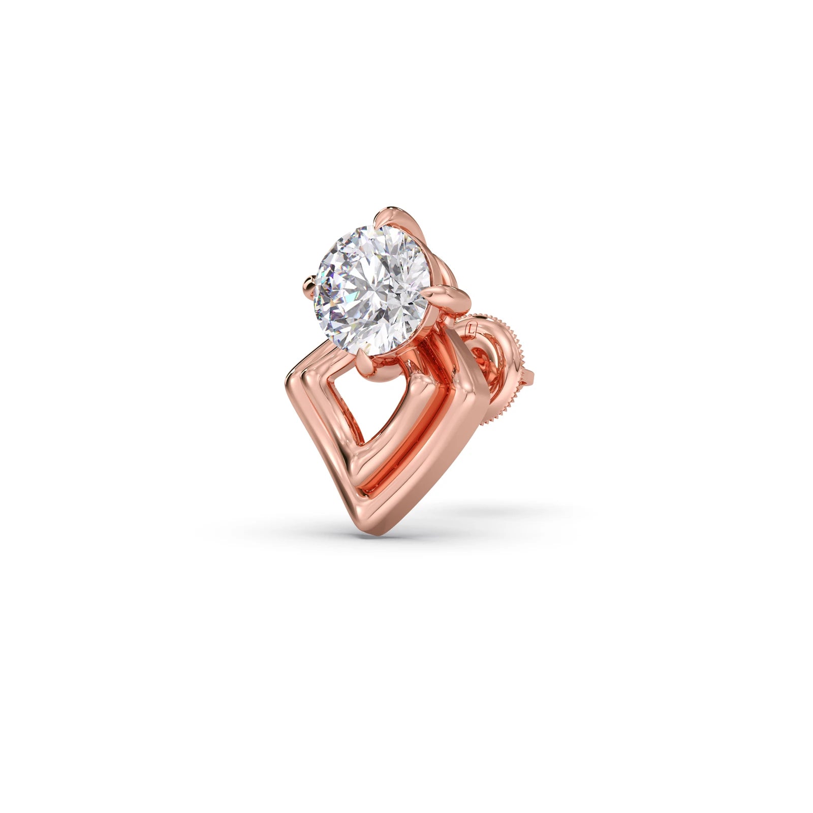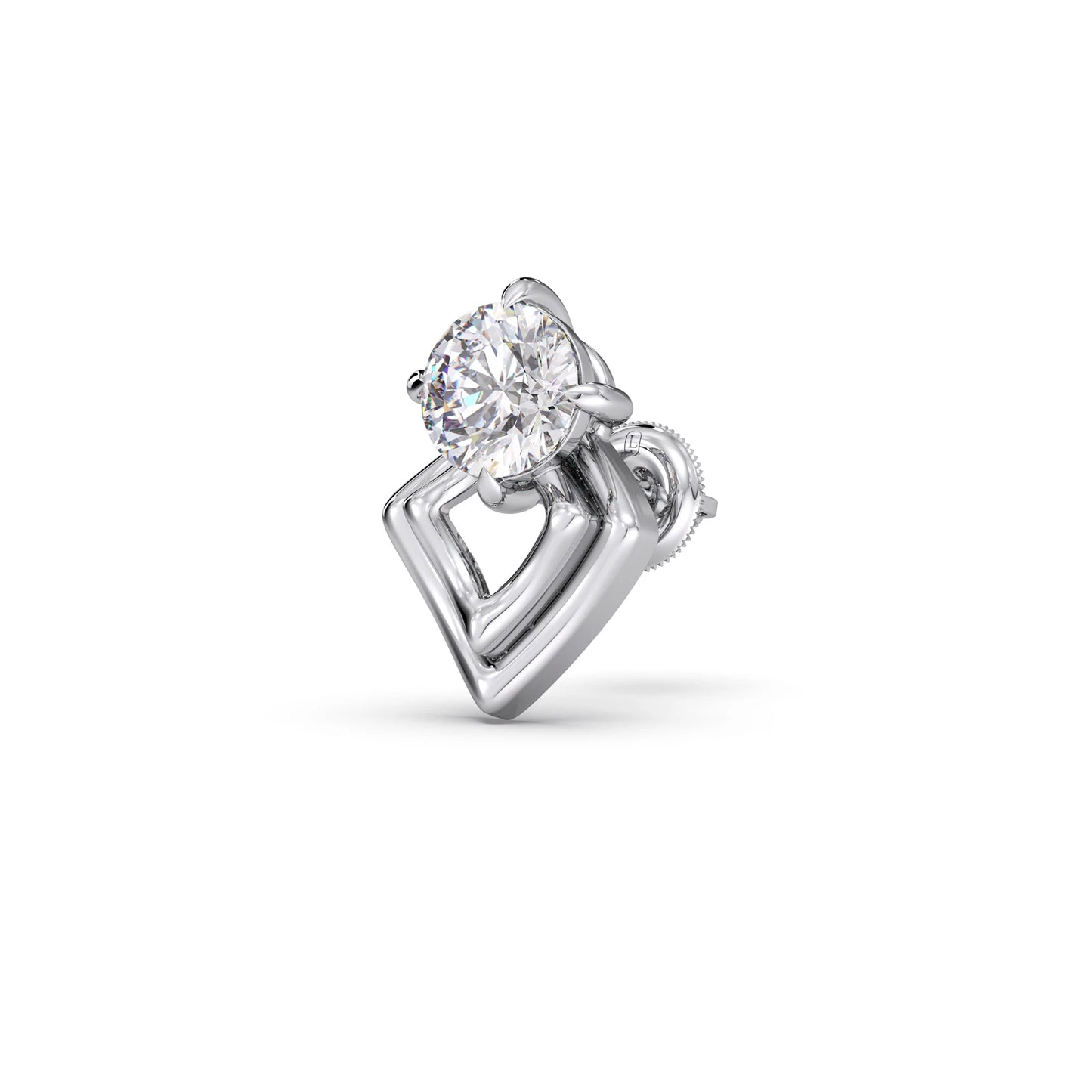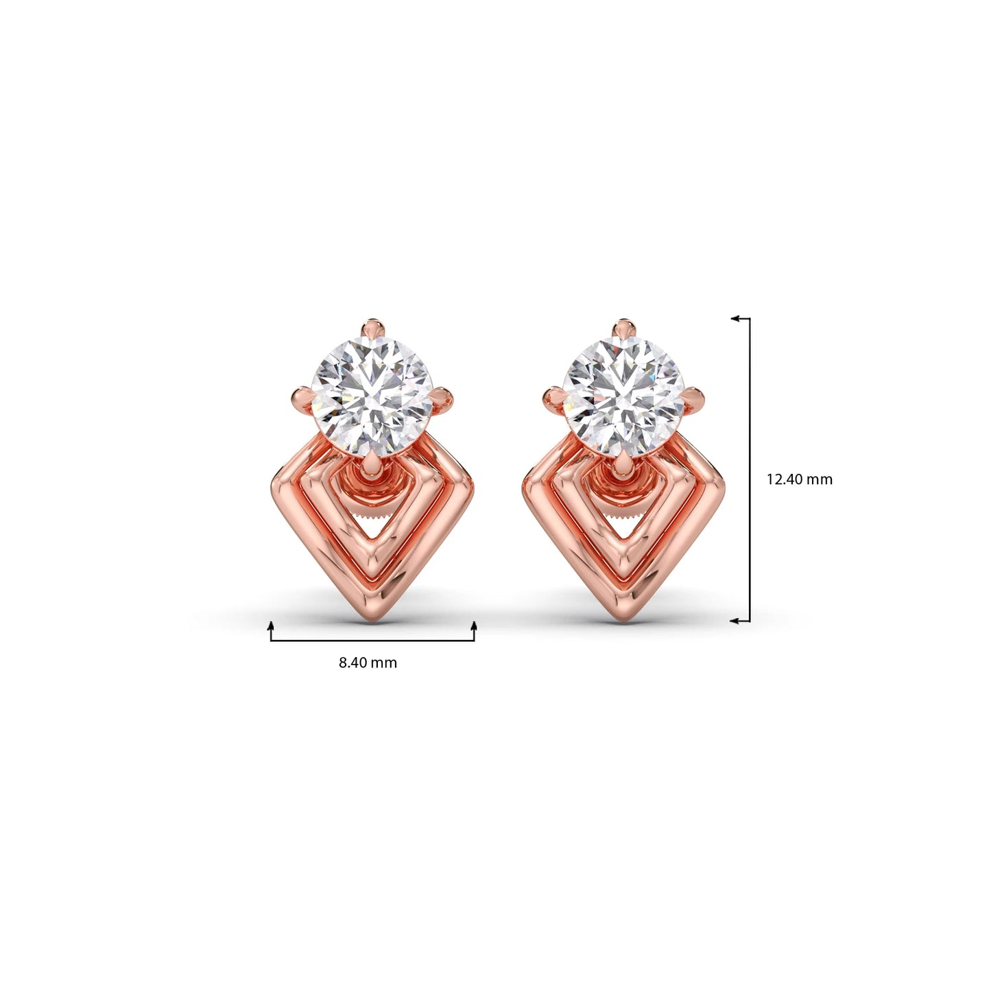 These modern stud earrings feature a sparkling round diamond held in a secure prong setting. An openwork kite-shaped frame elegantly surrounds the center stone, adding a unique geometric flair to this stylish and eye-catching design.