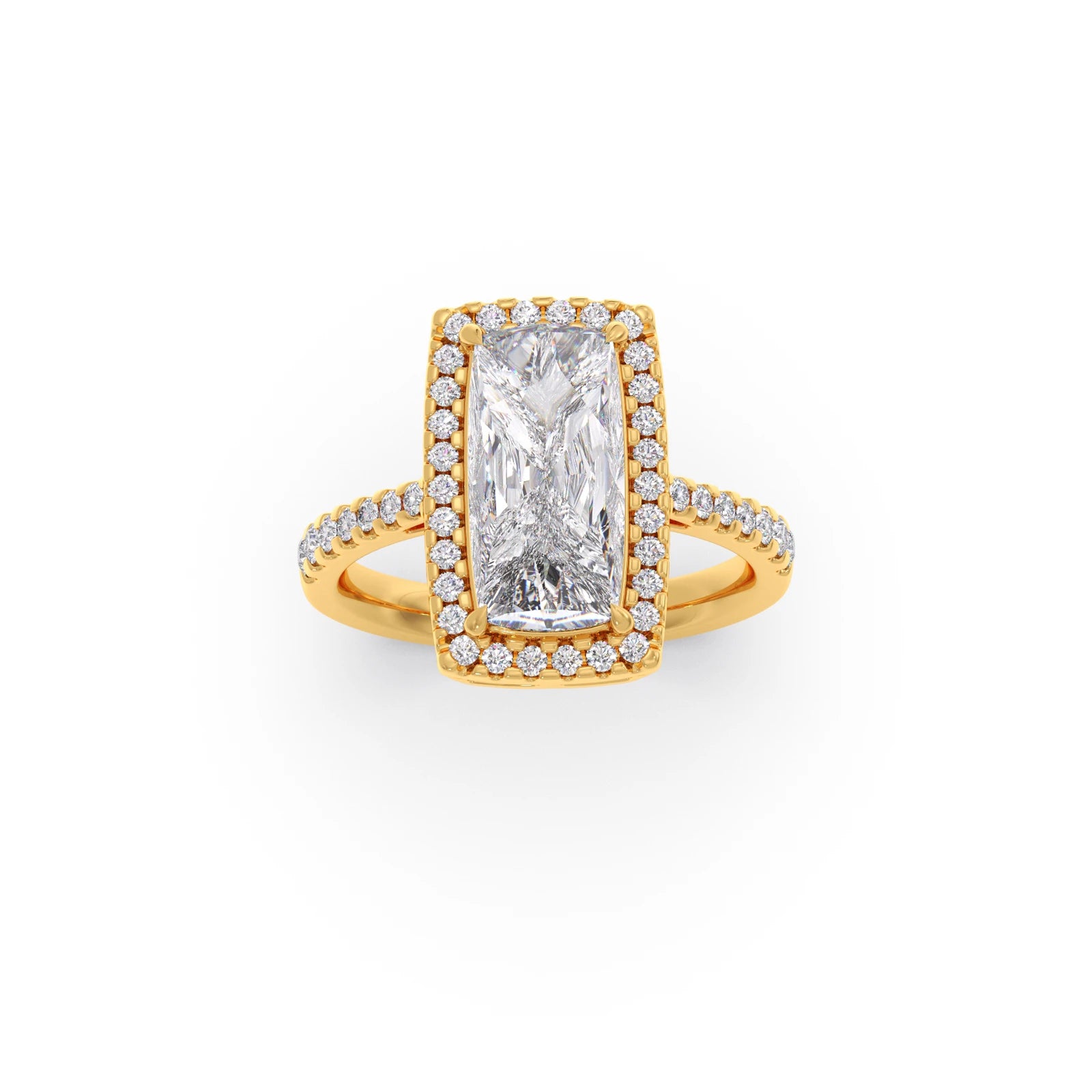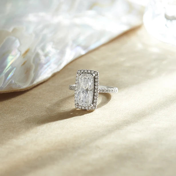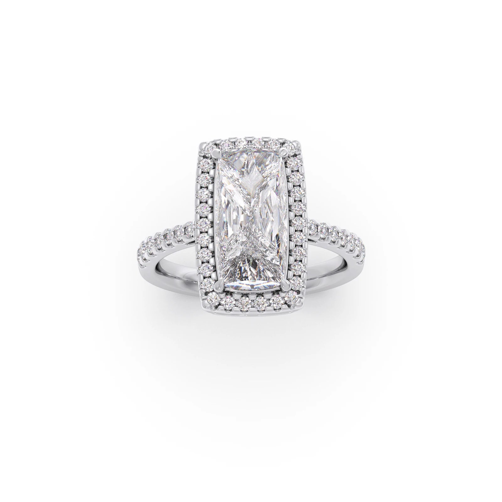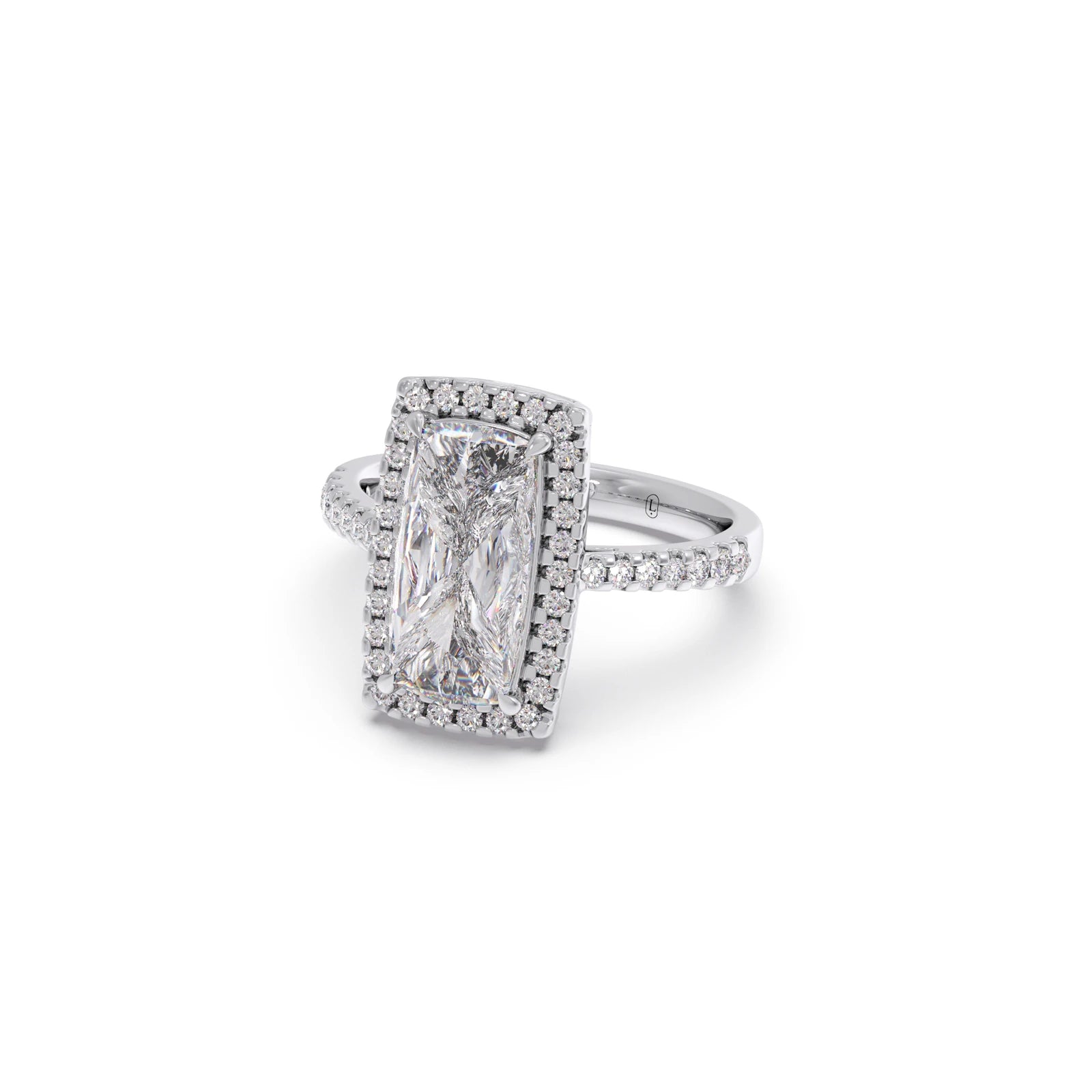 This elegant ring features a distinctive elongated cushion-cut diamond, framed by a dazzling halo of smaller diamonds. The unique shape offers a vintage-inspired charm with exceptional sparkle, creating a captivating and sophisticated statement piece.