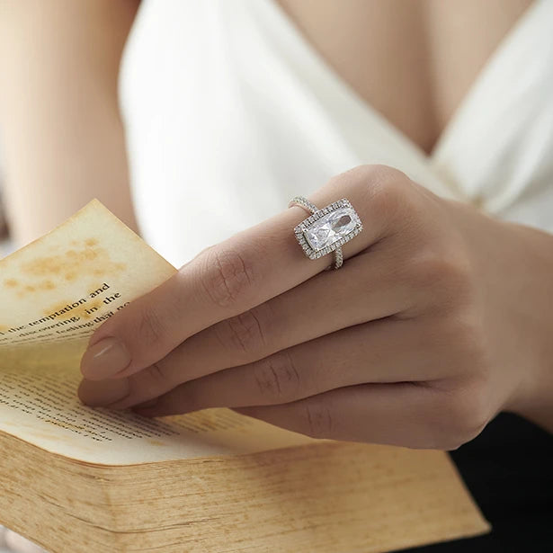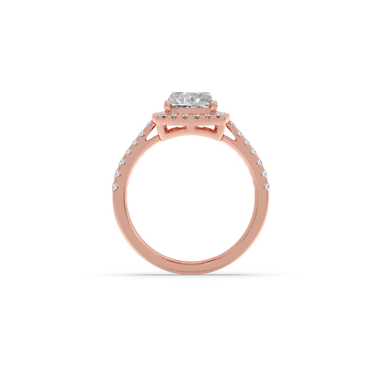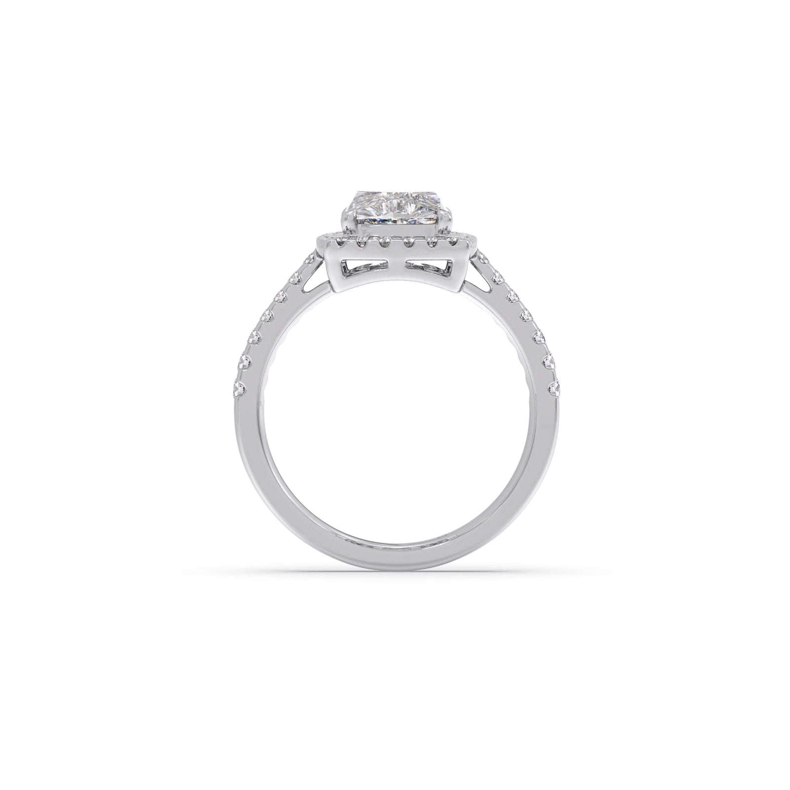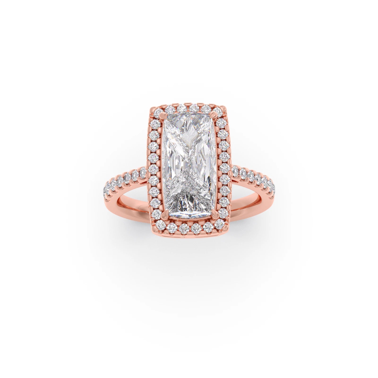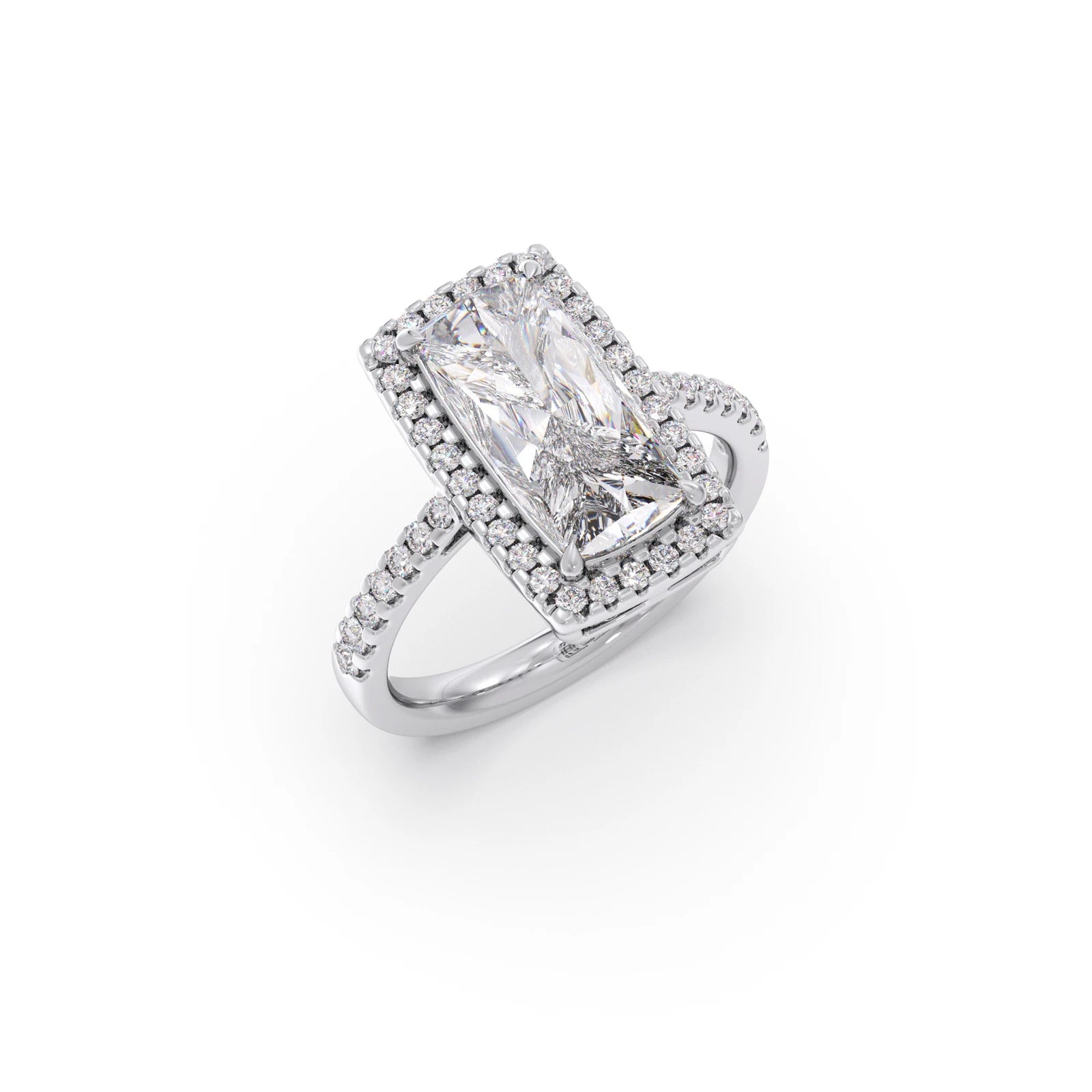 This elegant ring features a distinctive elongated cushion-cut diamond, framed by a dazzling halo of smaller diamonds. The unique shape offers a vintage-inspired charm with exceptional sparkle, creating a captivating and sophisticated statement piece.