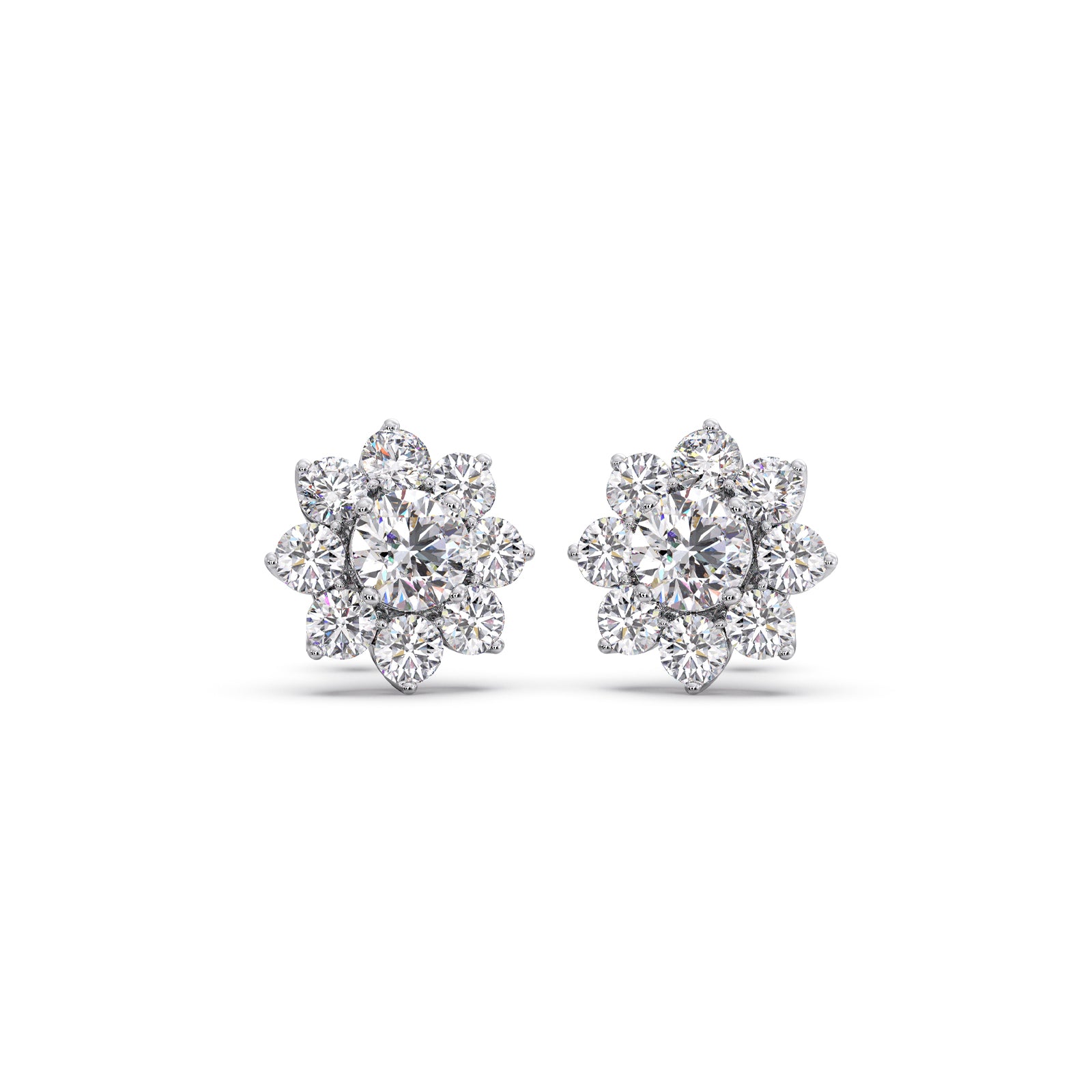 Adorn your ears with the serene beauty of our Lotus Petal Round Diamond Studs. These exquisite earrings feature 3.06ct center stone surrounded by 4.98ct brilliant round diamonds meticulously arranged to form delicate lotus petals, creating a captivating floral design. Perfect for adding a touch of sophisticated sparkle and timeless elegance to any ensemble, from daily wear to special occasions.