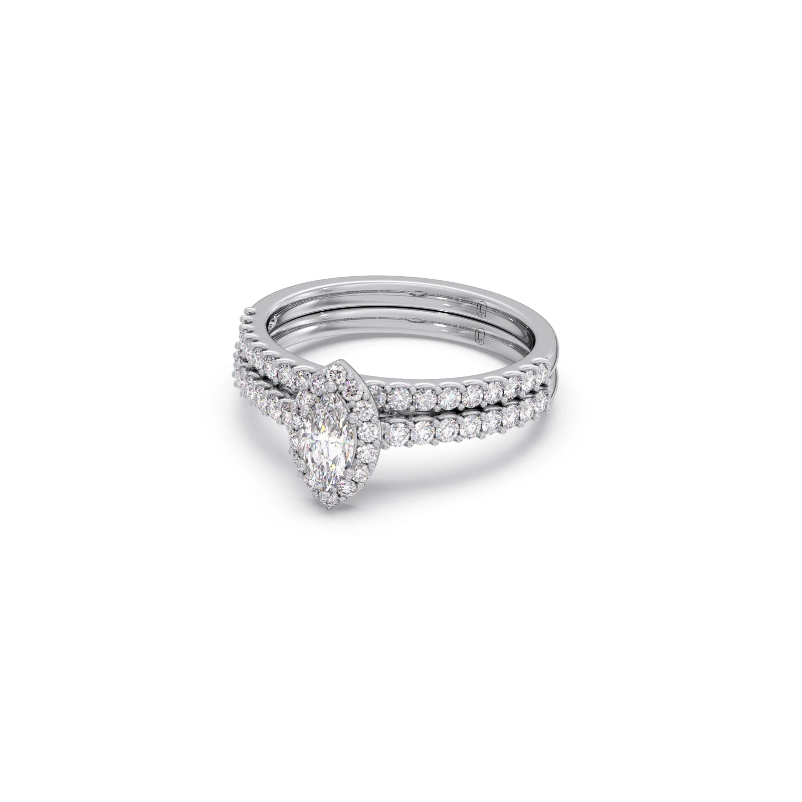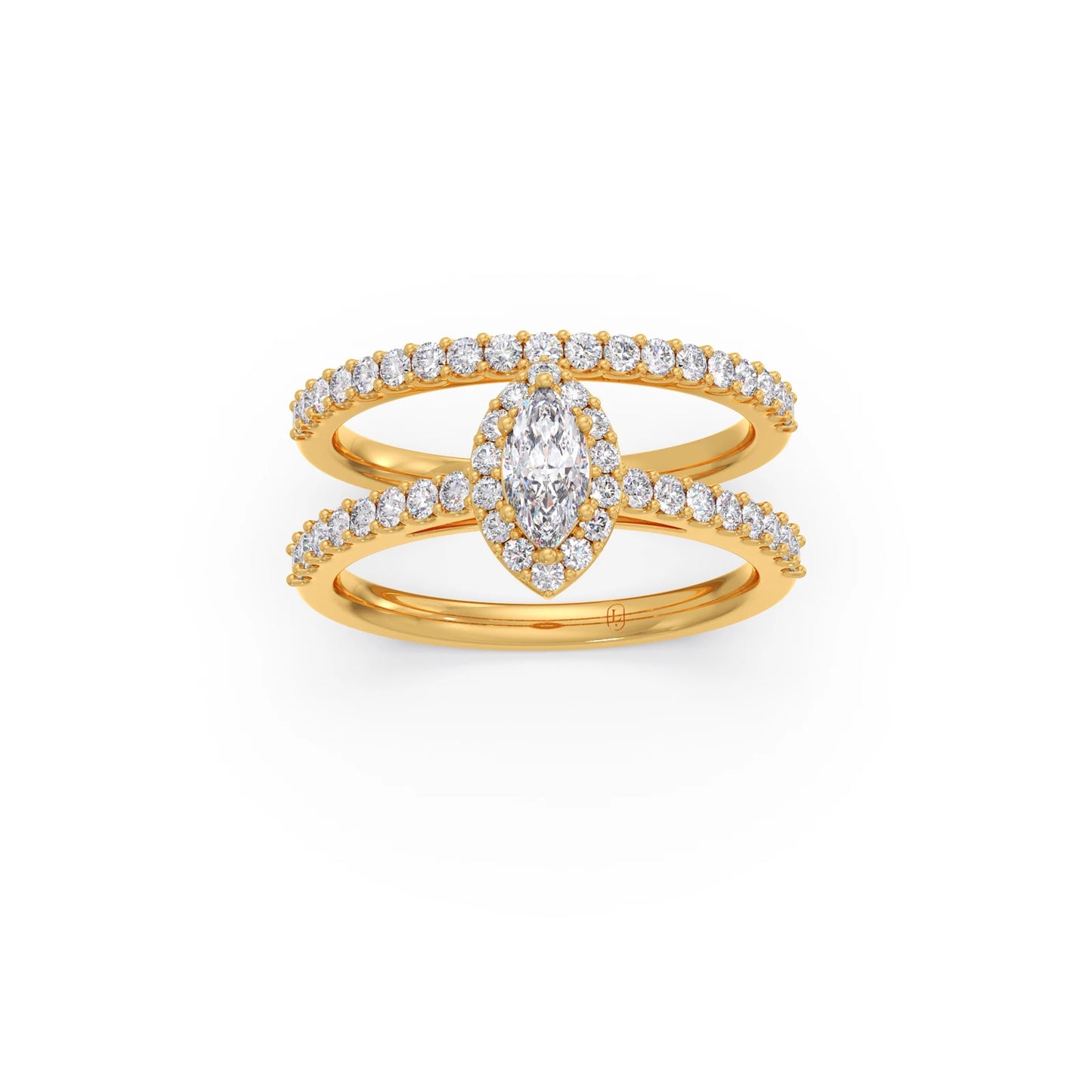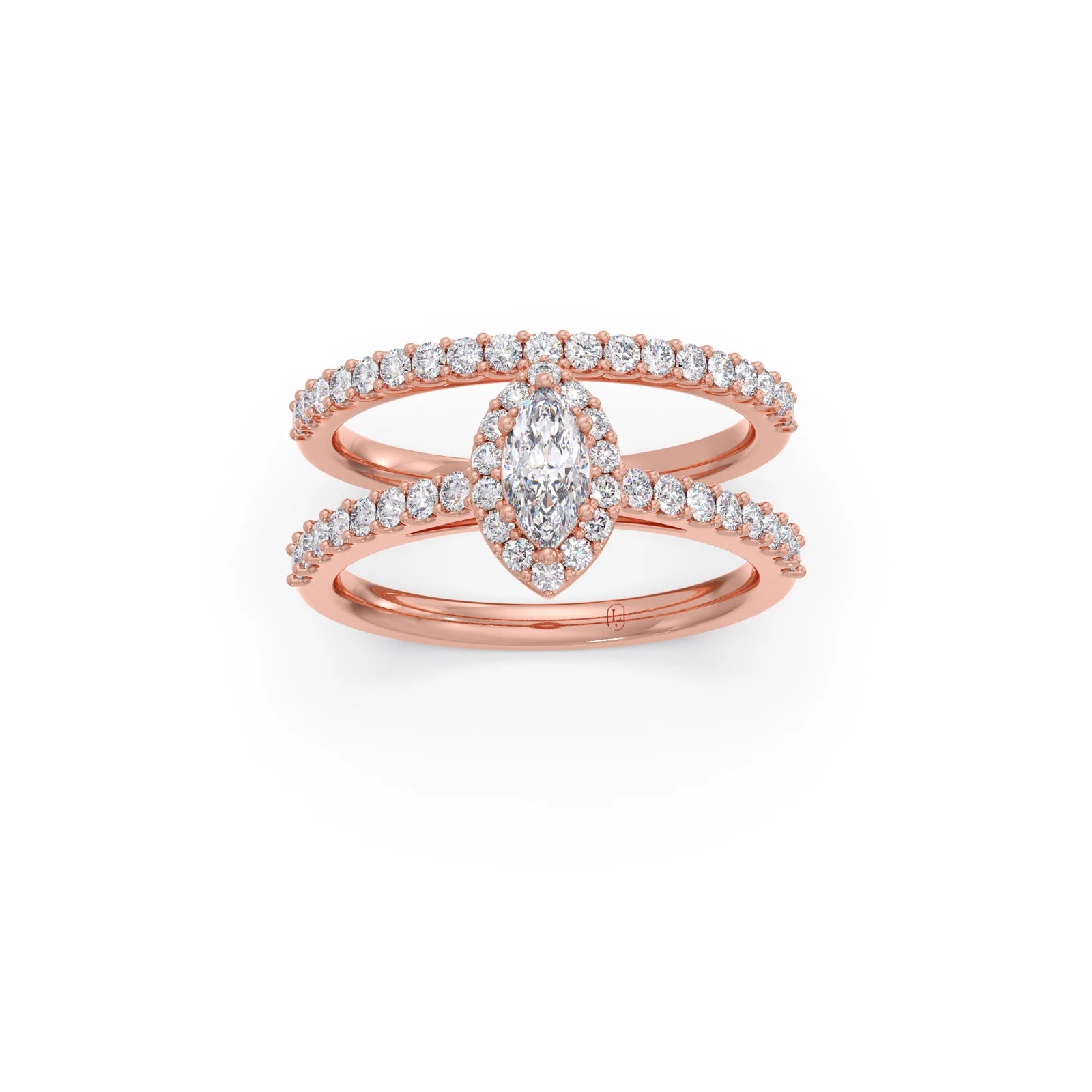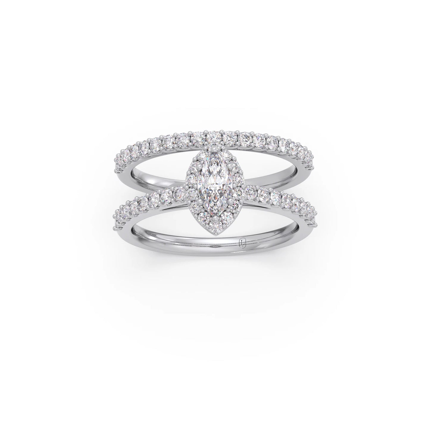 This uniquely stylish ring features a delicate pave setting of marquise and round-cut diamonds. Its stackable design allows for versatile wear, adding a touch of intricate sparkle and sophisticated flair to any finge
