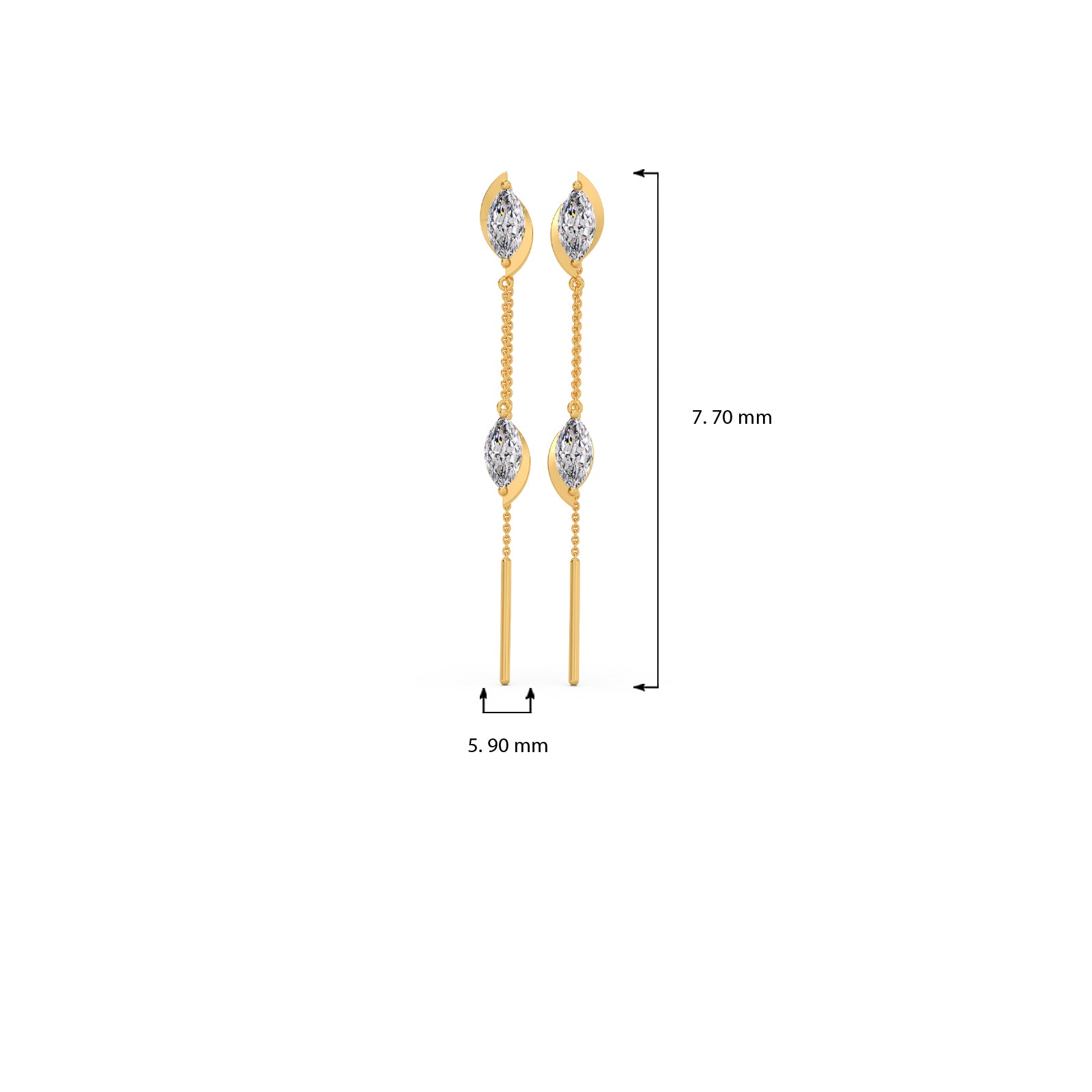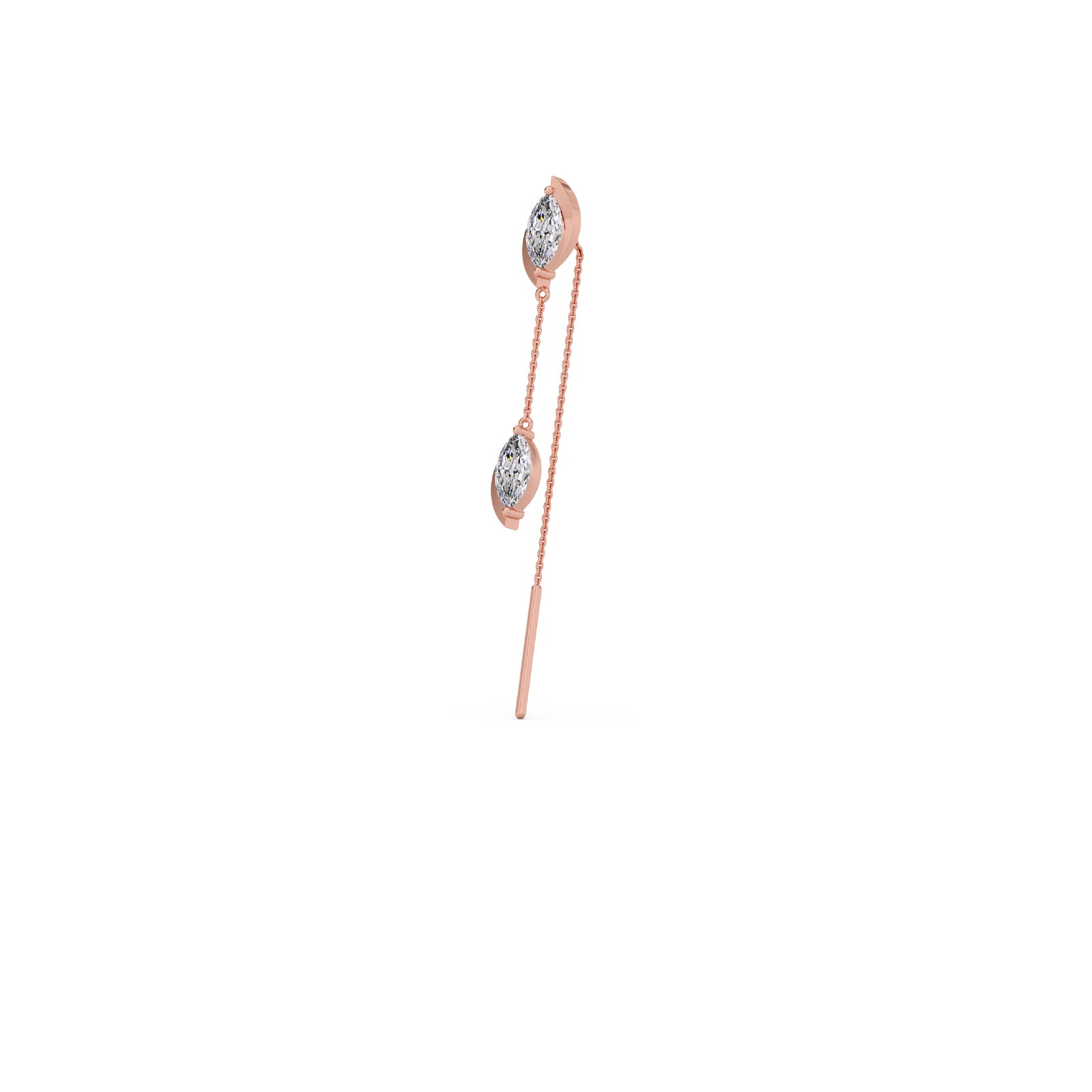 These elegant earrings feature a delicate chain that threads gracefully through the ear. Each earring showcases two sparkling marquise-cut diamonds, creating a sophisticated and eye-catching dangle. Perfect for adding a touch of refined glamour to any occasion