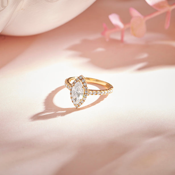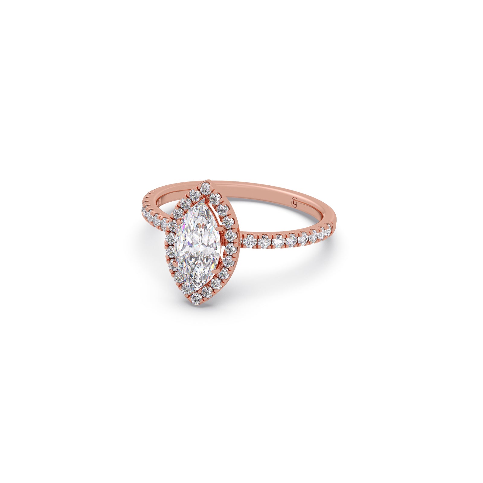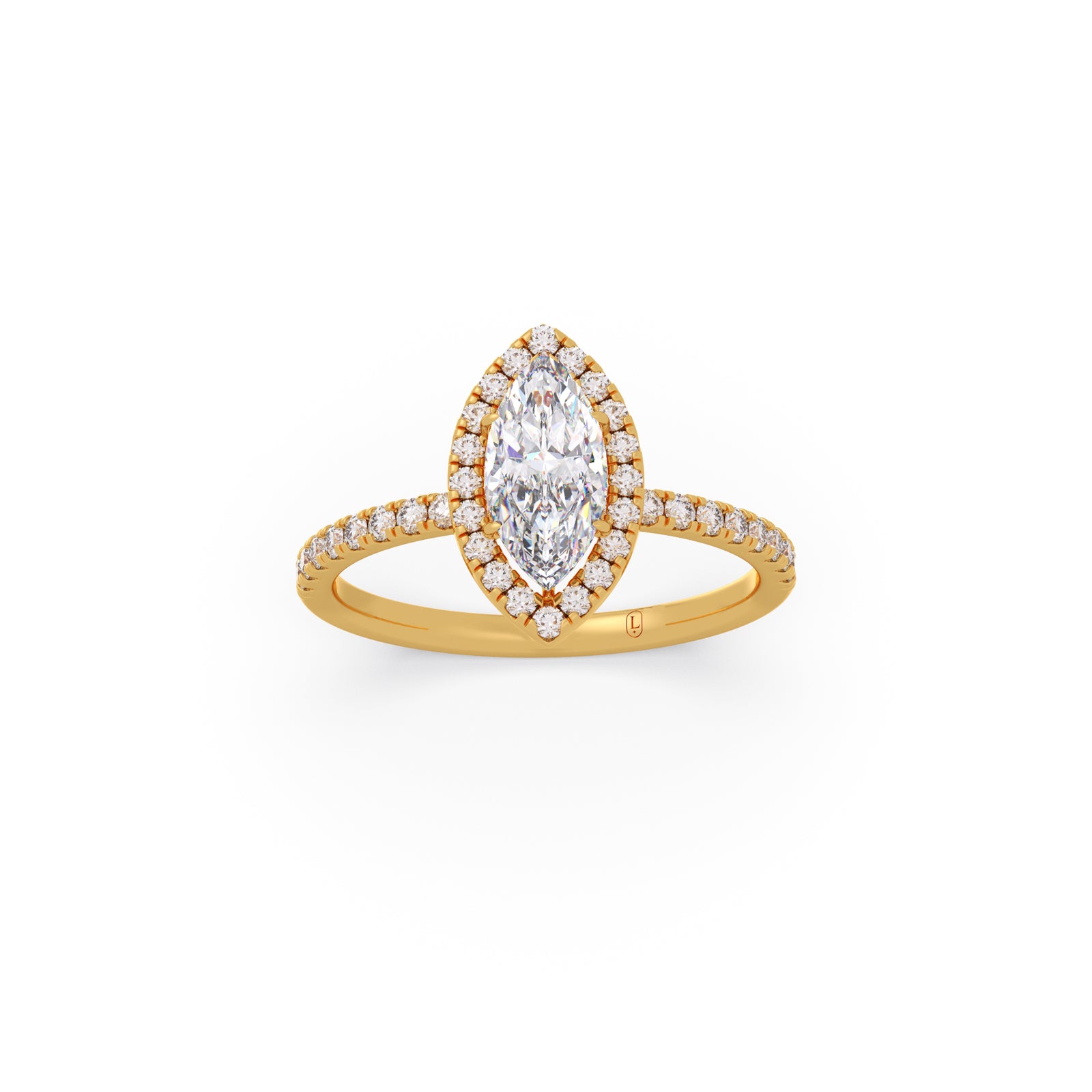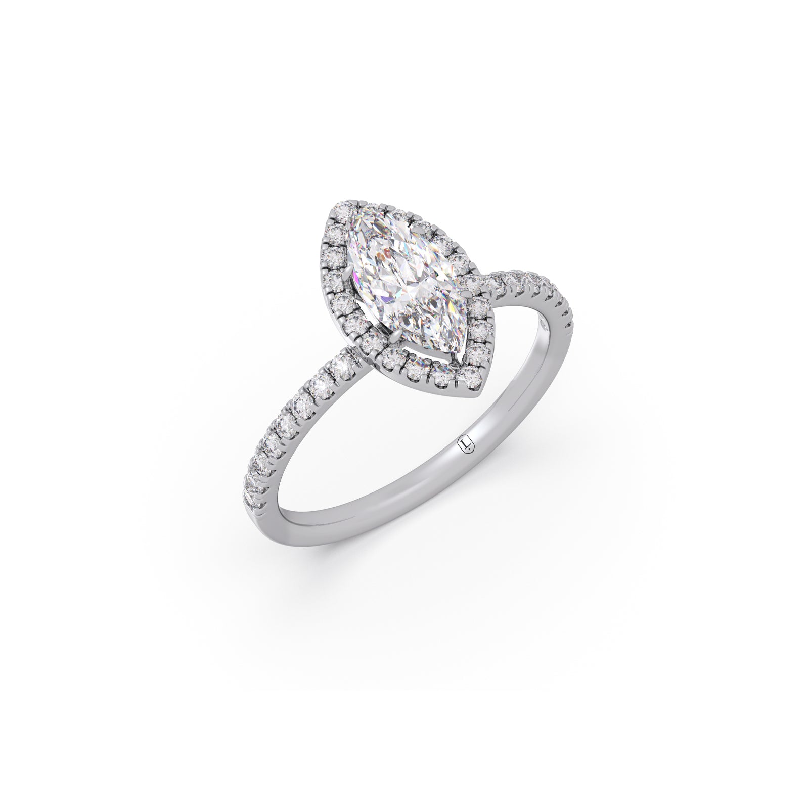 Elegant and timeless, our Marquise Cut Diamond Engagement Ring features a stunning Solitaire Marquise Diamond, symbolizing love and sophistication. The Halo Round Diamonds in it with Side-stones are adding a beauty to the ring.