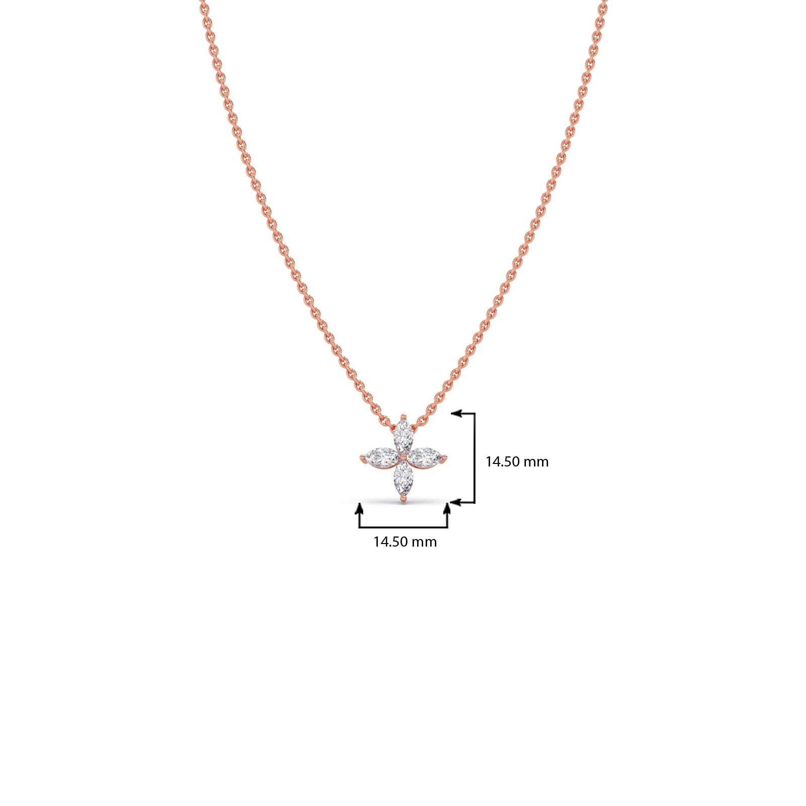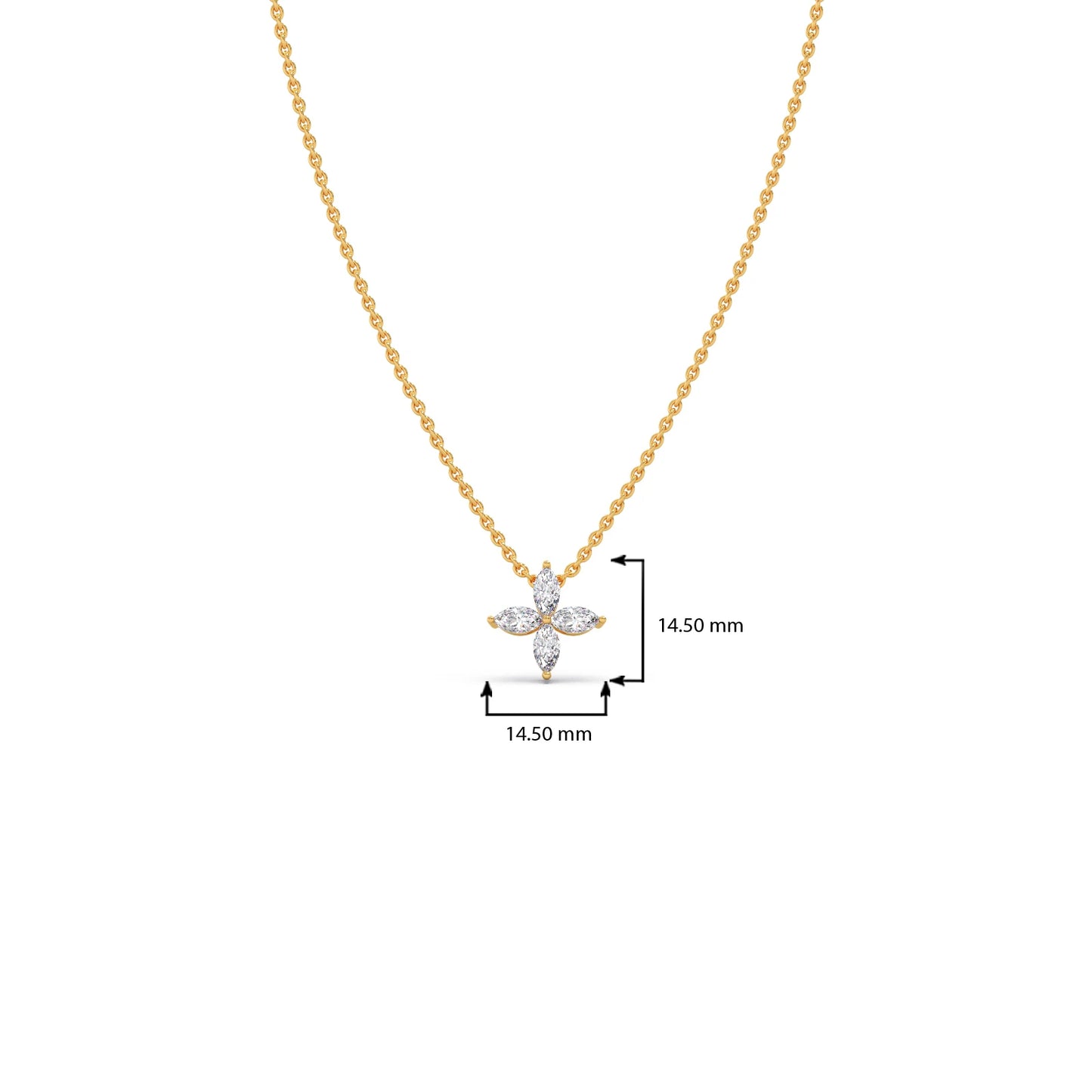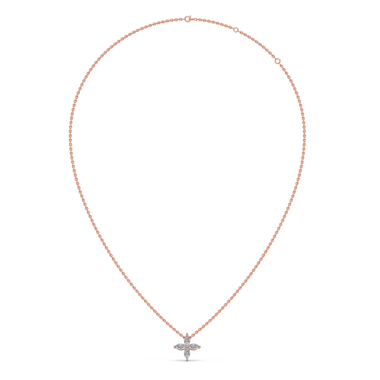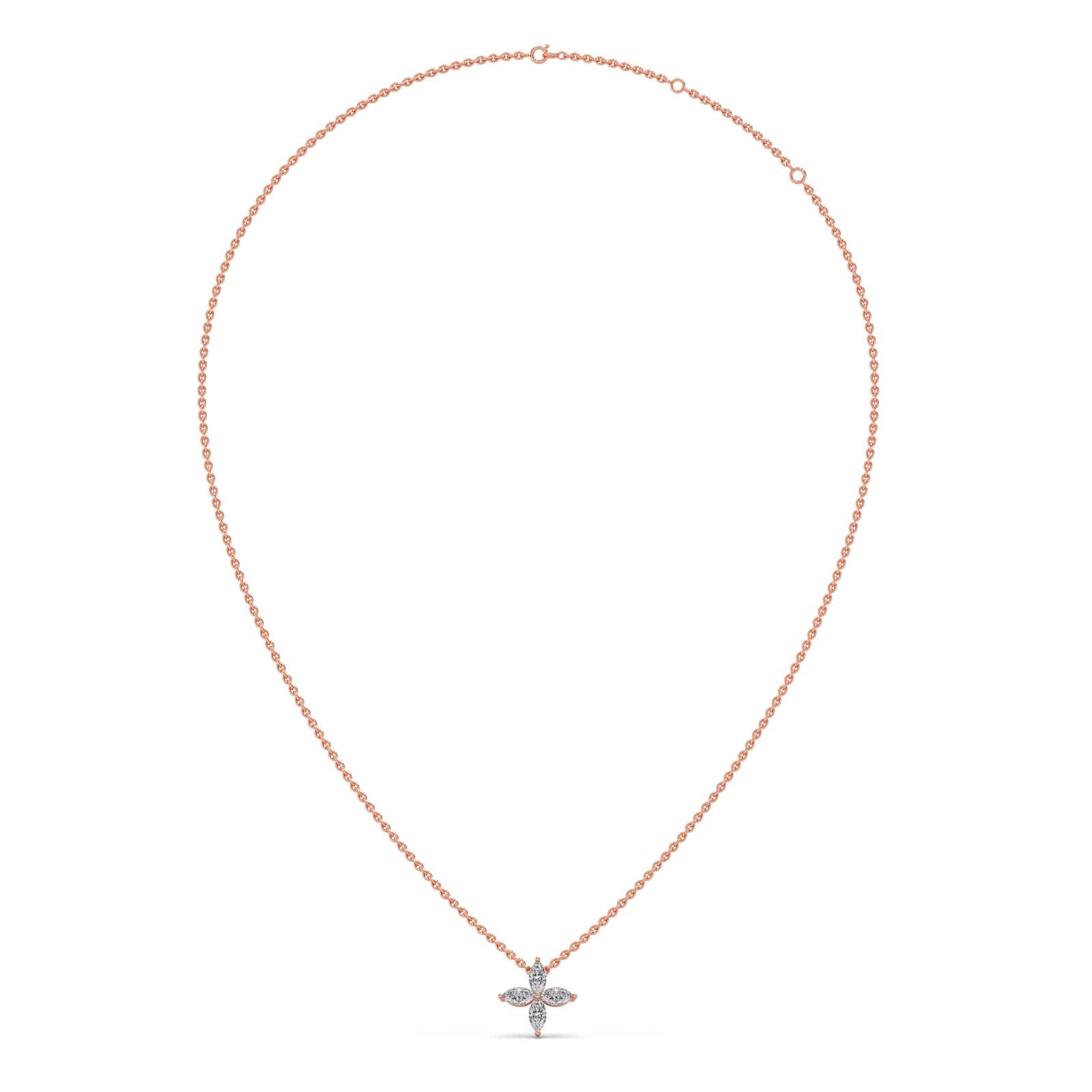 Discover unique radiance with our Marquise Diamond Floral Pendant Necklace. Individually set marquise-shaped diamonds meticulously form this distinctive cross, creating a breathtaking display of light. This striking pendant is a testament to both contemporary design and enduring symbolism, adding a brilliant and meaningful statement to any look.