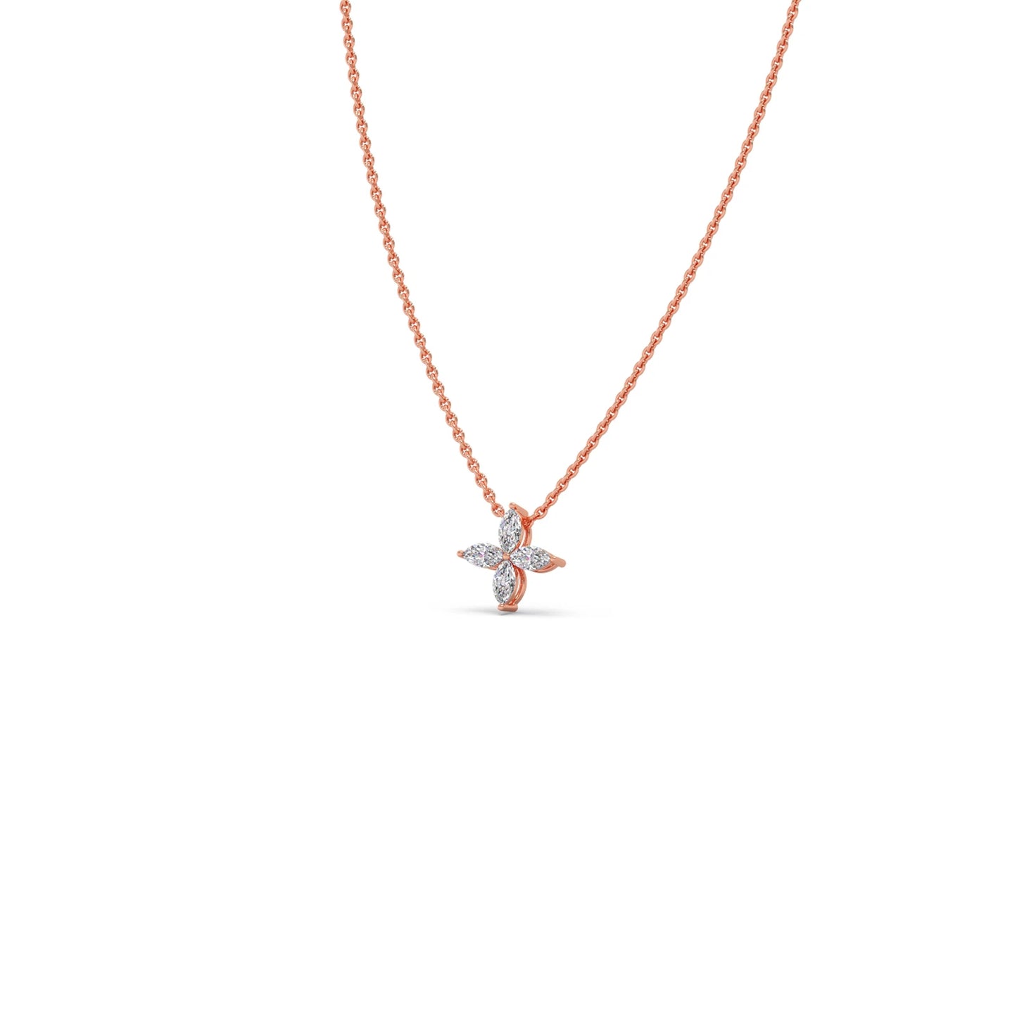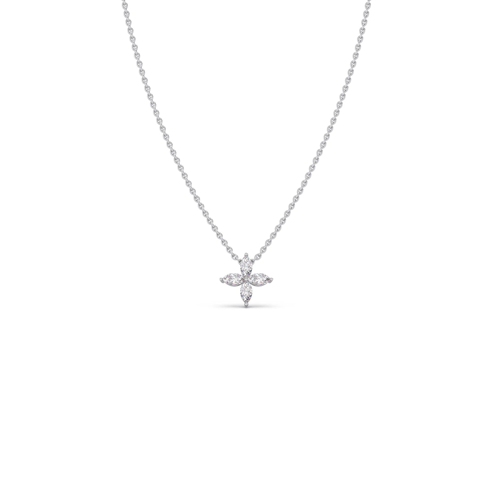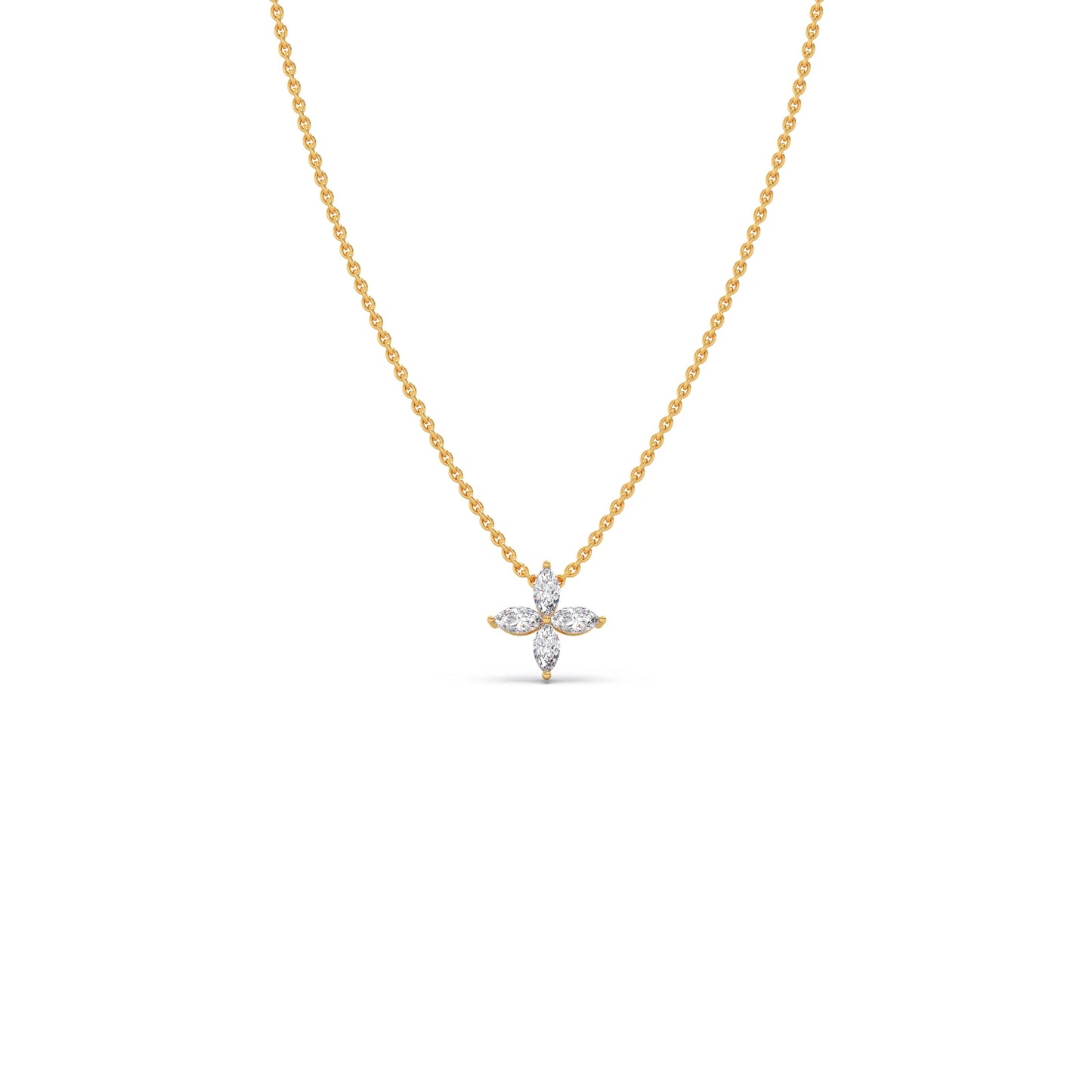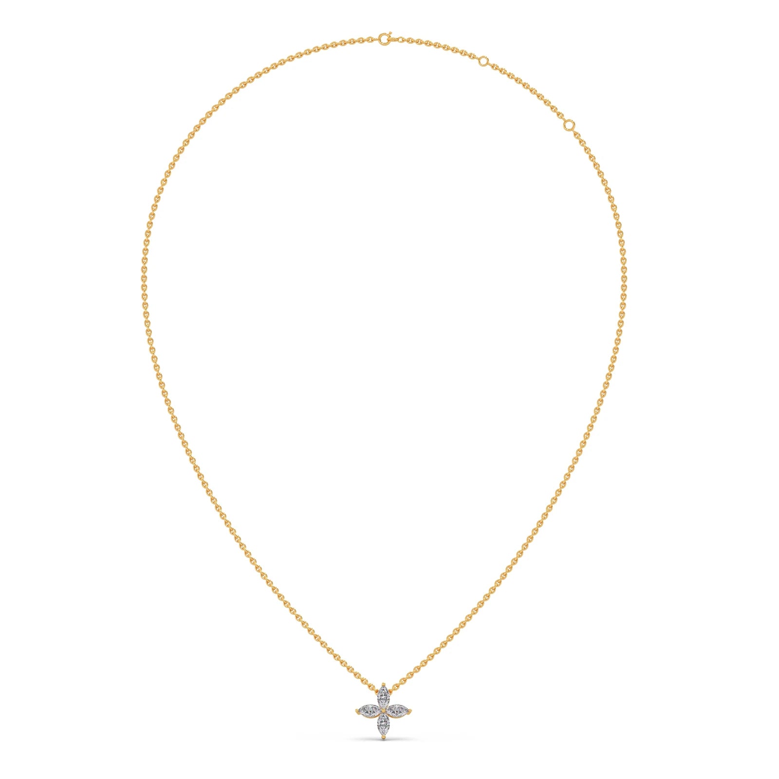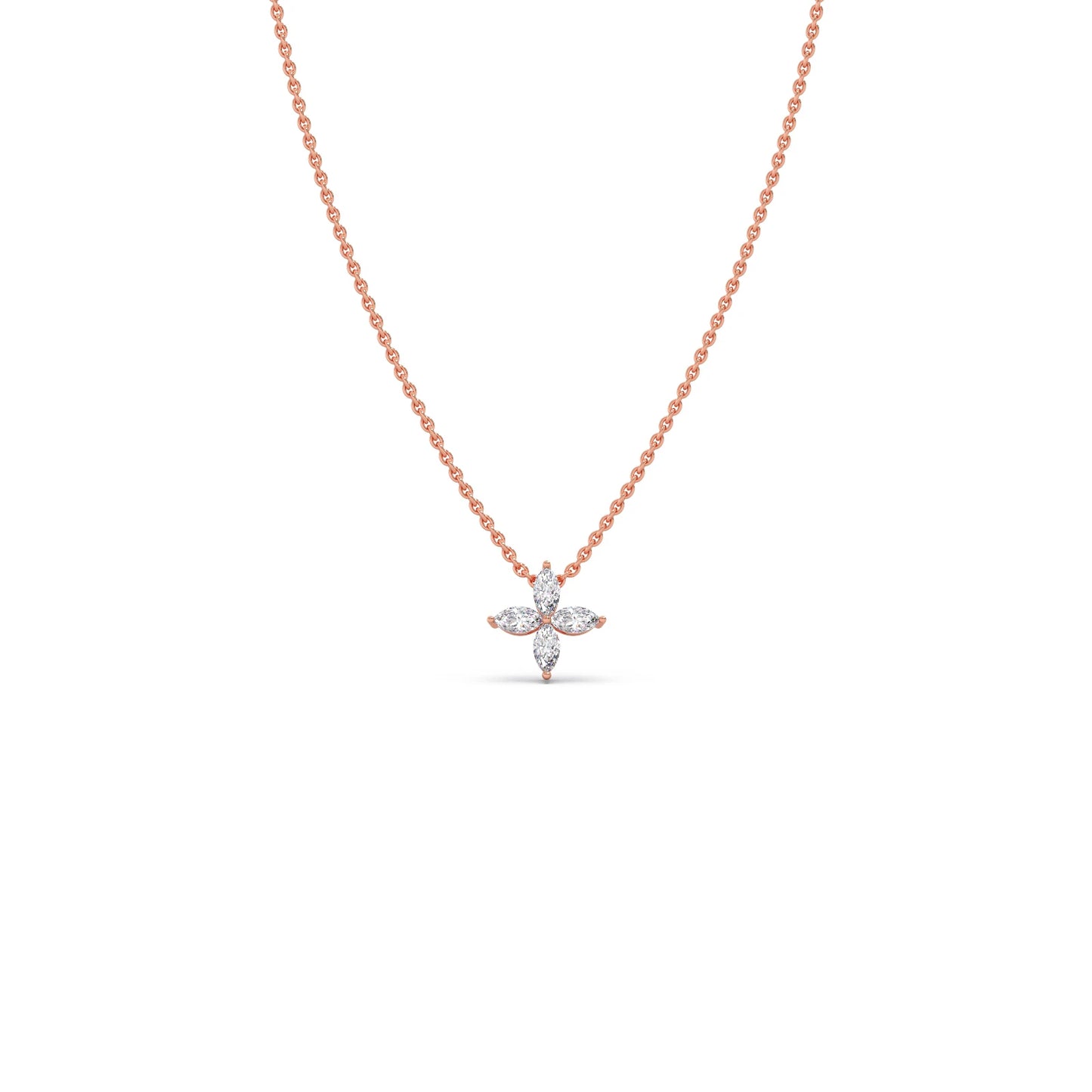 Discover unique radiance with our Marquise Diamond Floral Pendant Necklace. Individually set marquise-shaped diamonds meticulously form this distinctive cross, creating a breathtaking display of light. This striking pendant is a testament to both contemporary design and enduring symbolism, adding a brilliant and meaningful statement to any look.