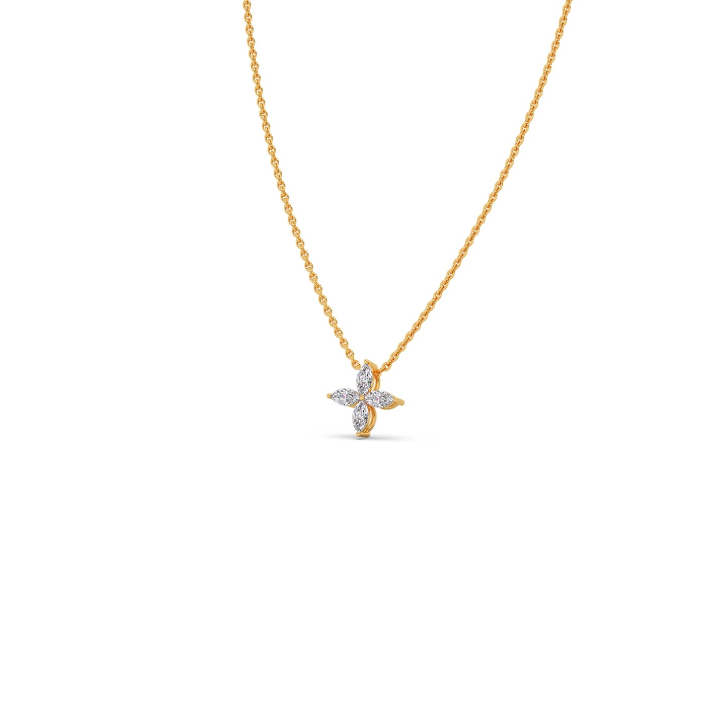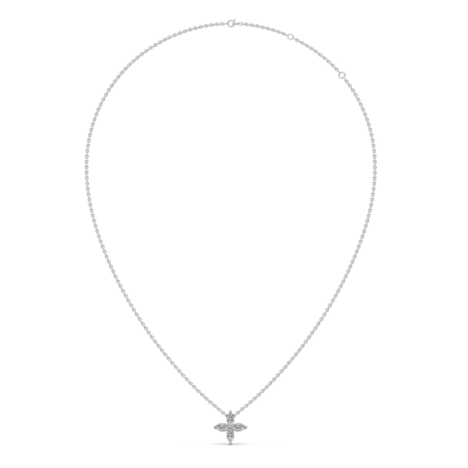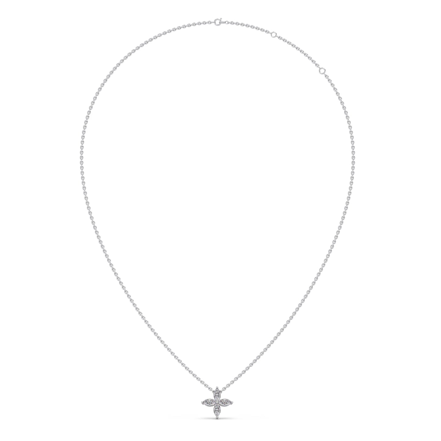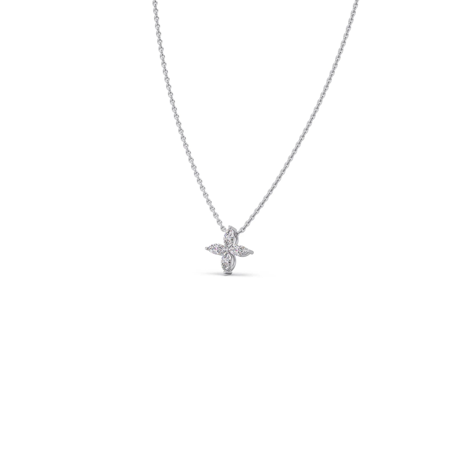 Discover unique radiance with our Marquise Diamond Floral Pendant Necklace. Individually set marquise-shaped diamonds meticulously form this distinctive cross, creating a breathtaking display of light. This striking pendant is a testament to both contemporary design and enduring symbolism, adding a brilliant and meaningful statement to any look.