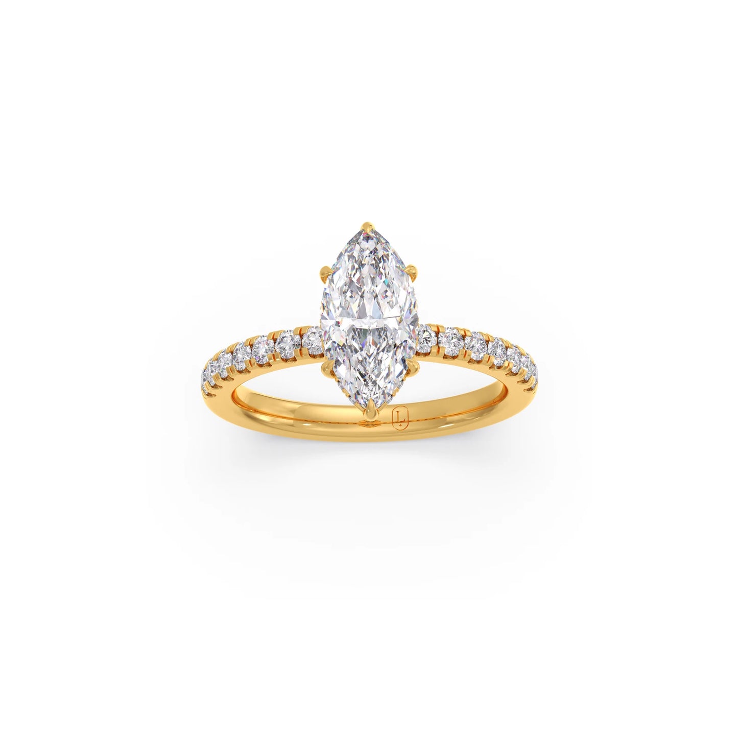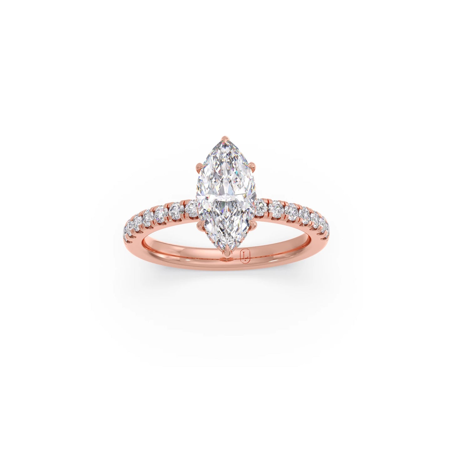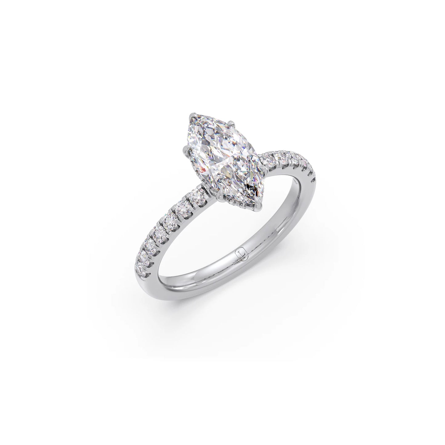 Marquise Diamond Pavé Engagement Ring: This stunning design features an elongated marquise-cut diamond that exudes exceptional brilliance. Framed by a band of meticulously pavé-set accent stones, the ring perfectly balances classic elegance with contemporary style, symbolizing a timeless promise of love and enduring commitment. A symbol of passion and lifelong unity.