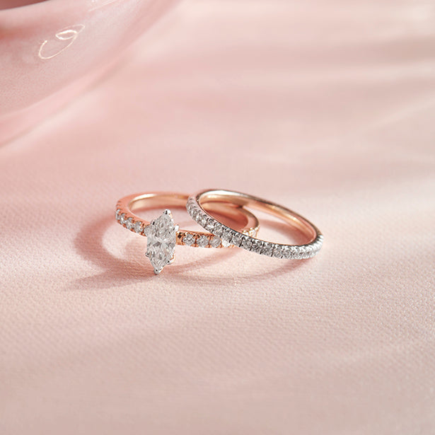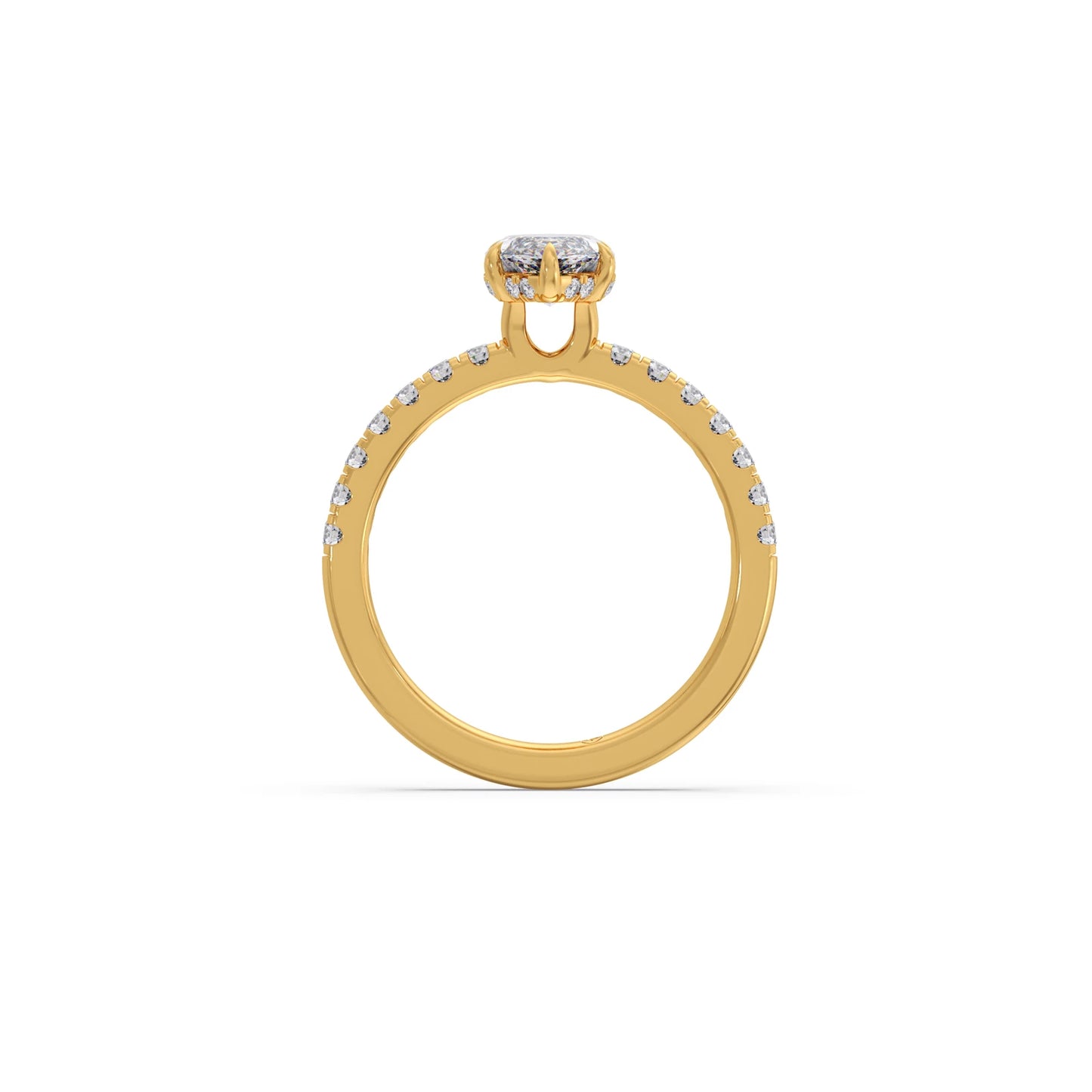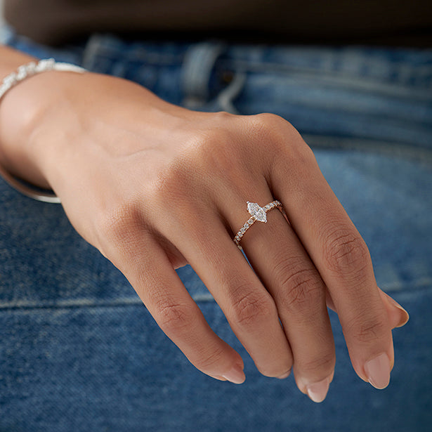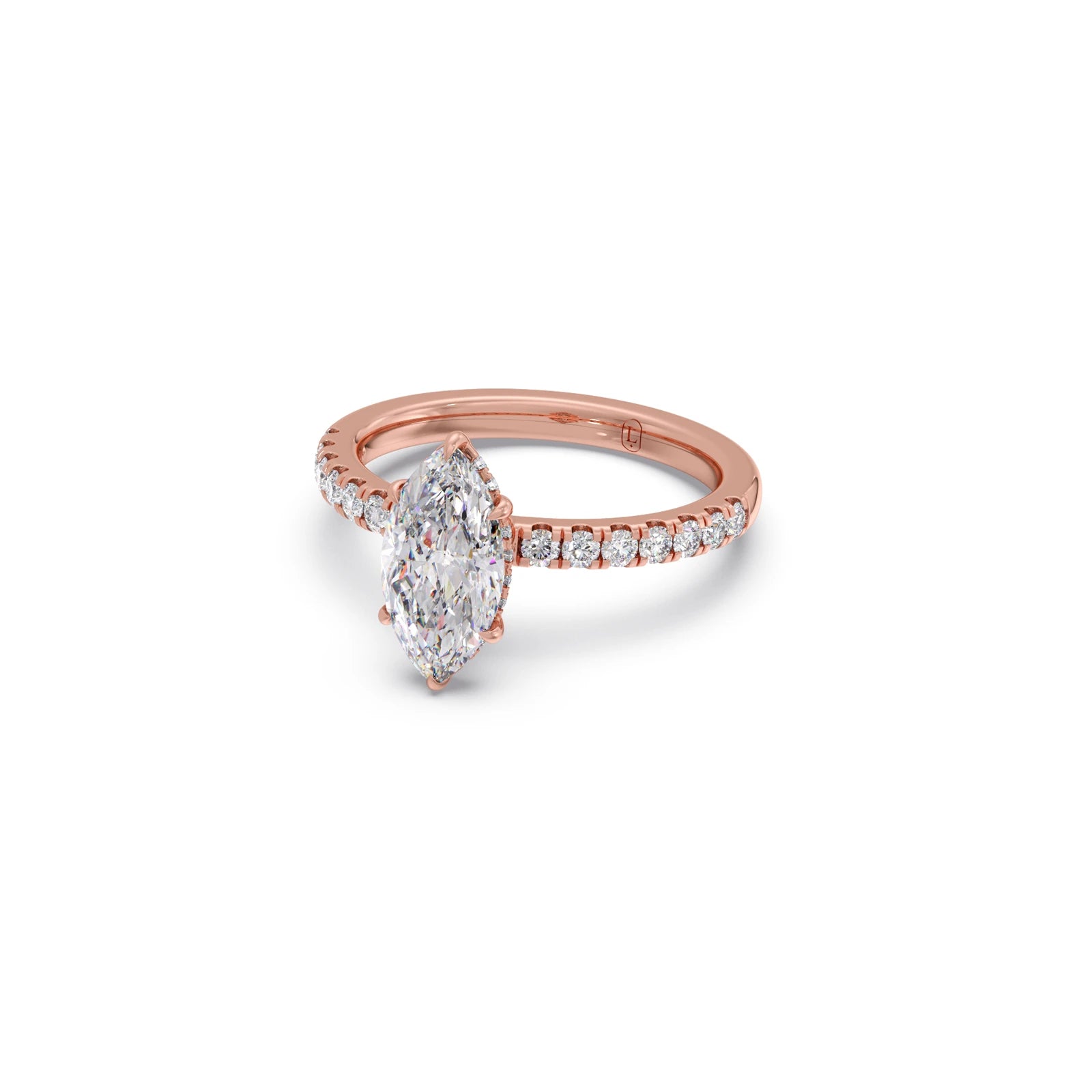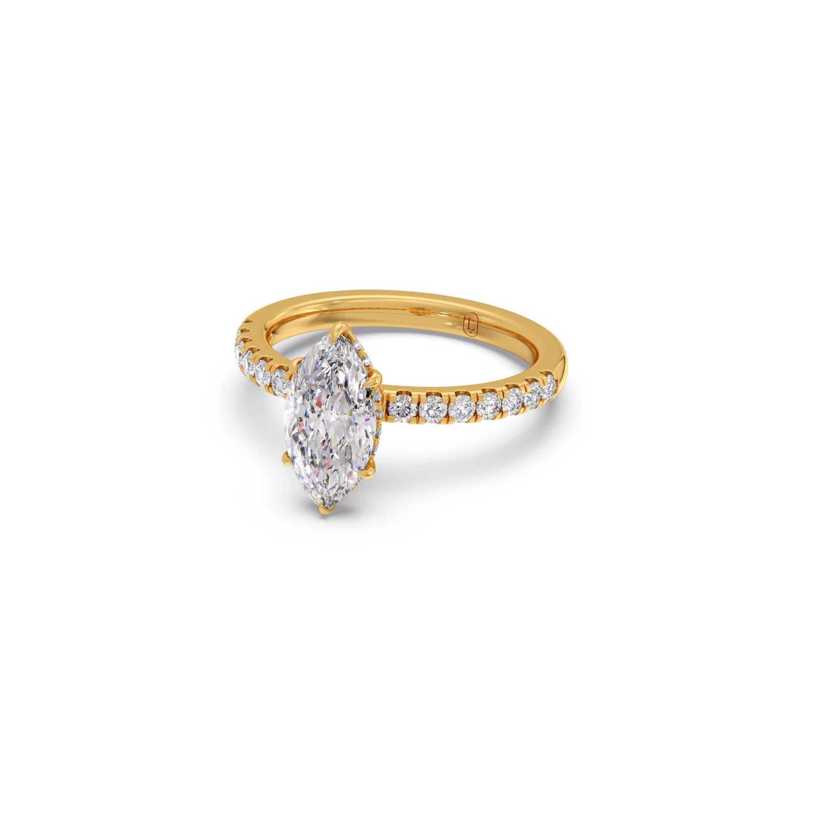 Marquise Diamond Pavé Engagement Ring: This stunning design features an elongated marquise-cut diamond that exudes exceptional brilliance. Framed by a band of meticulously pavé-set accent stones, the ring perfectly balances classic elegance with contemporary style, symbolizing a timeless promise of love and enduring commitment. A symbol of passion and lifelong unity.