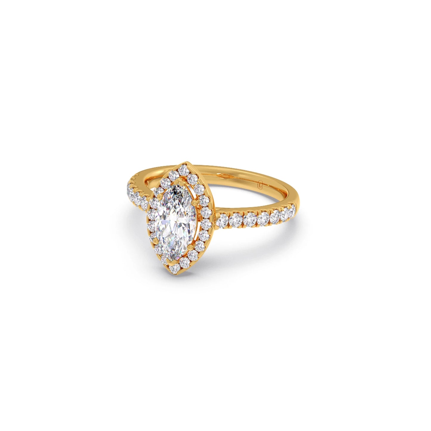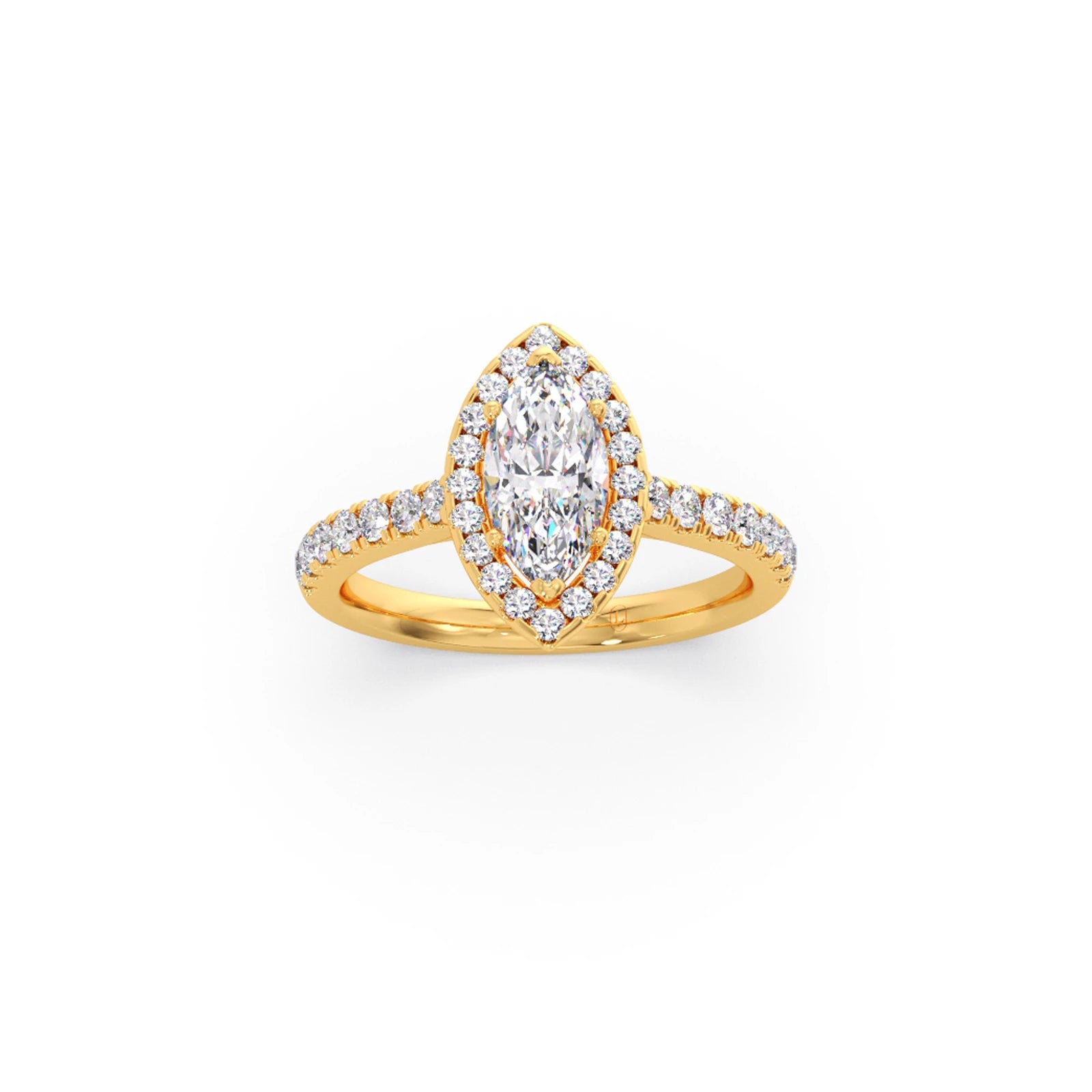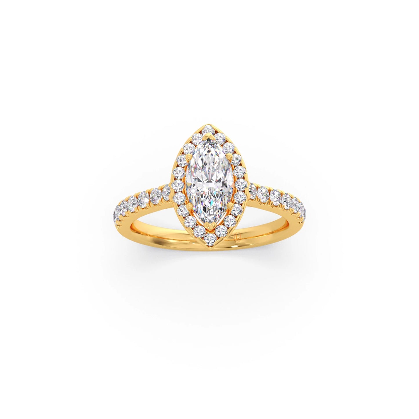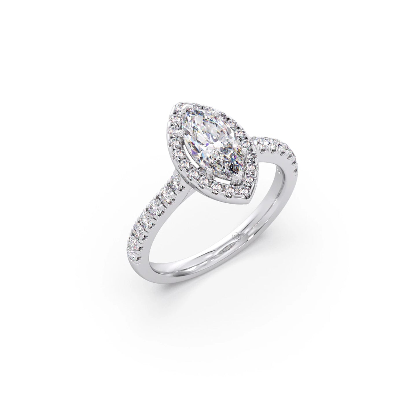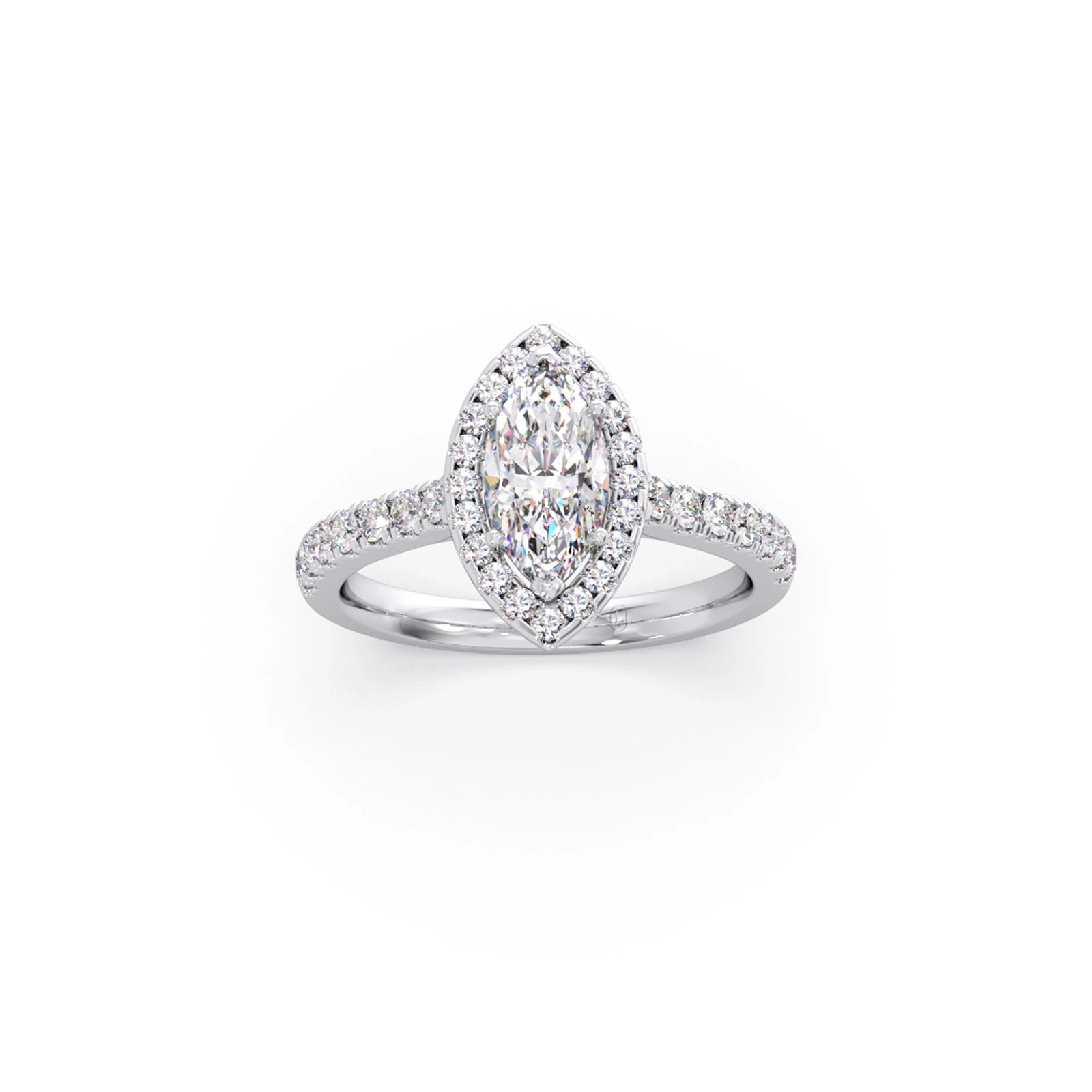 This engagement ring showcases a stunning marquise-cut diamond at its centre, encircled by a delicate halo of pave-set diamonds. The pave diamonds extend along the band, adding extra sparkle. The ring's design balances classic elegance with a touch of modern sophistication, making it a captivating symbol of love and commitment.