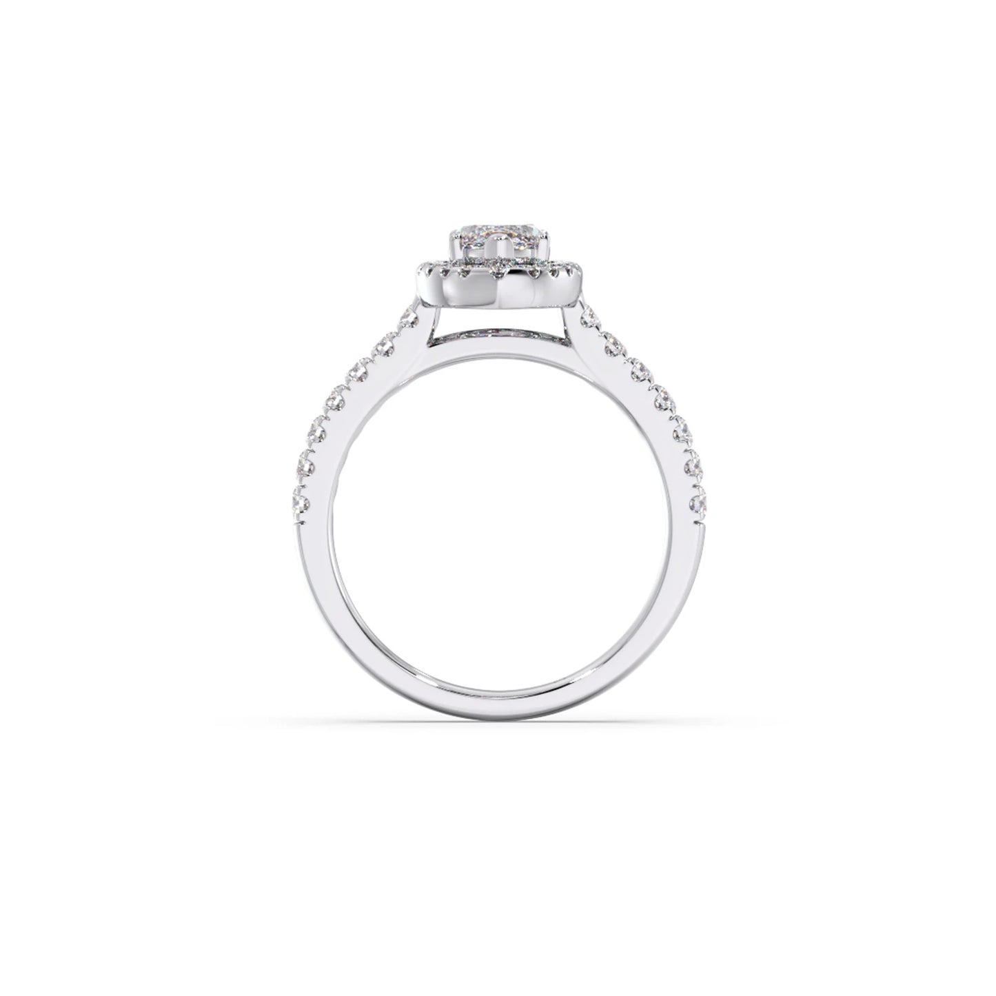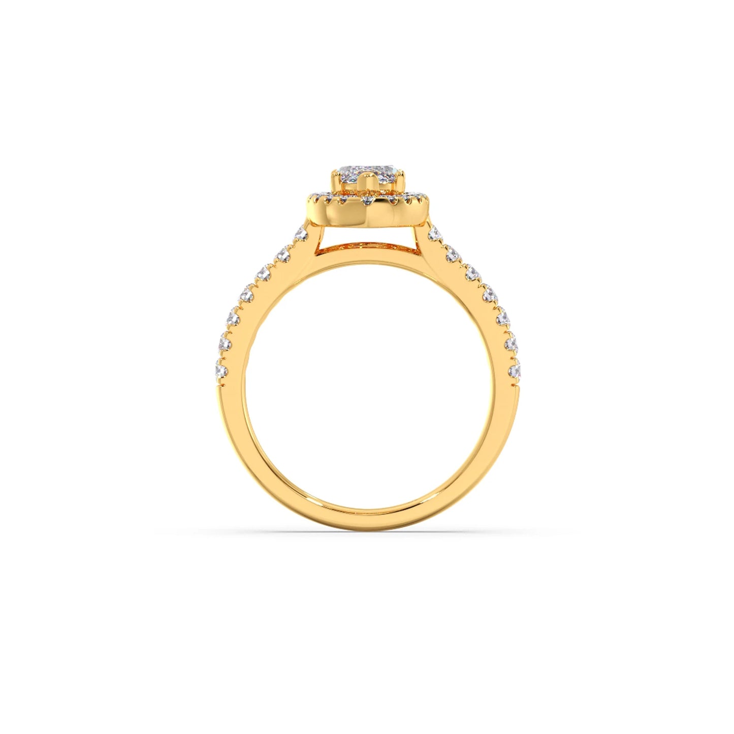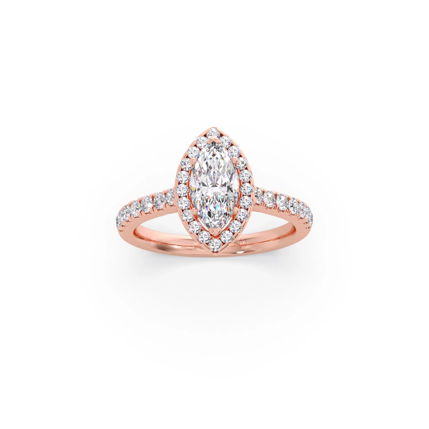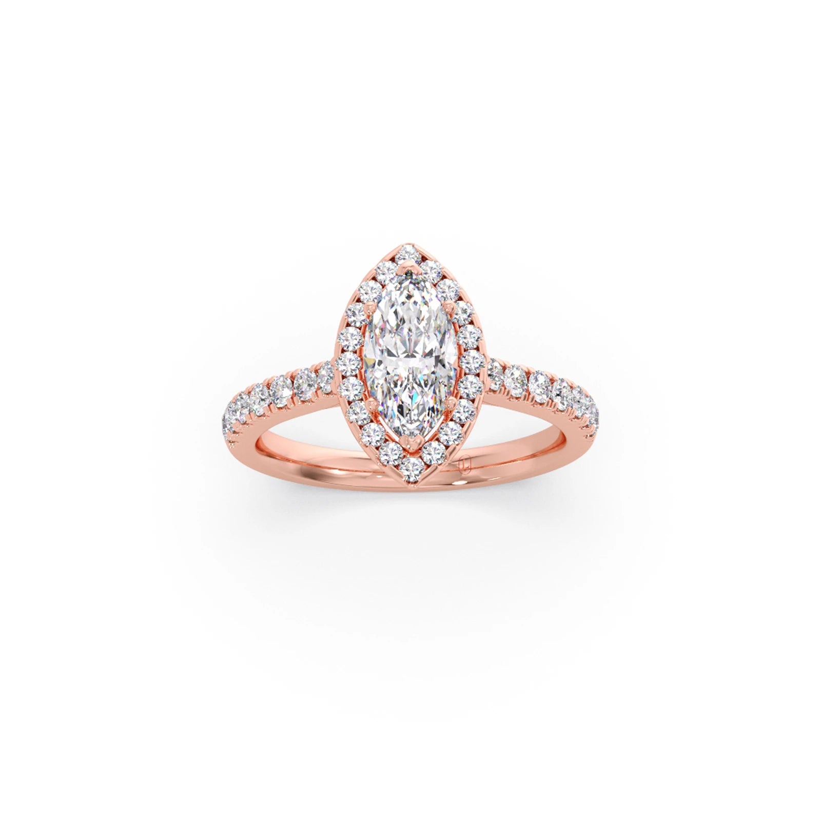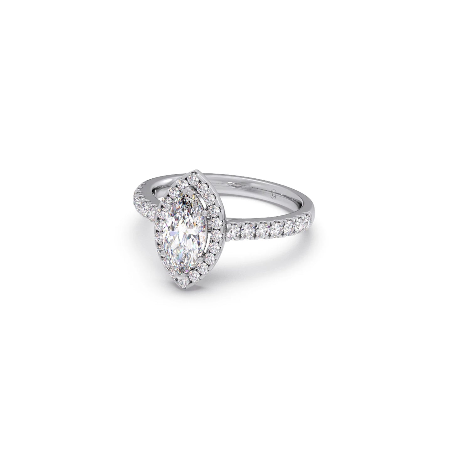 This engagement ring showcases a stunning marquise-cut diamond at its centre, encircled by a delicate halo of pave-set diamonds. The pave diamonds extend along the band, adding extra sparkle. The ring's design balances classic elegance with a touch of modern sophistication, making it a captivating symbol of love and commitment.