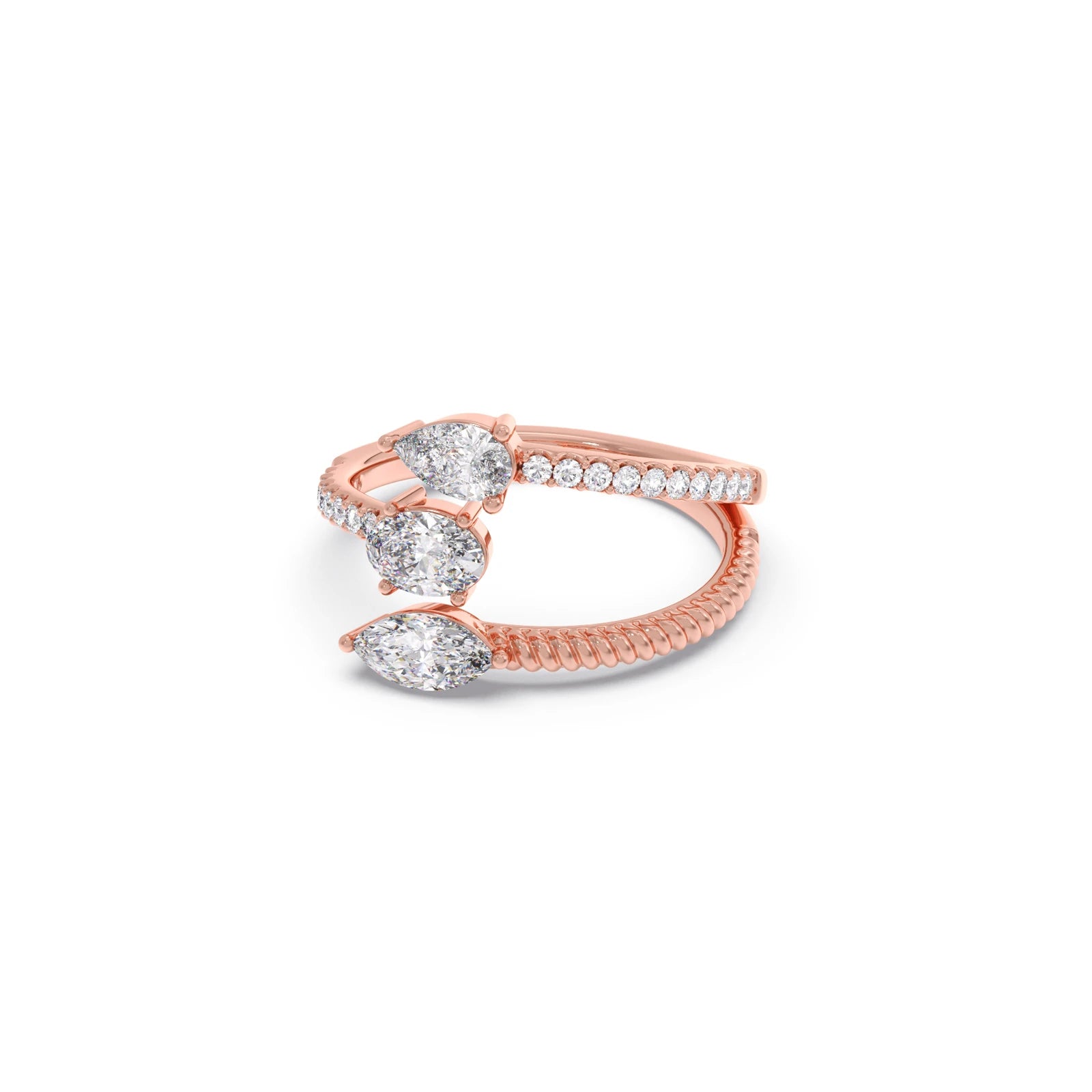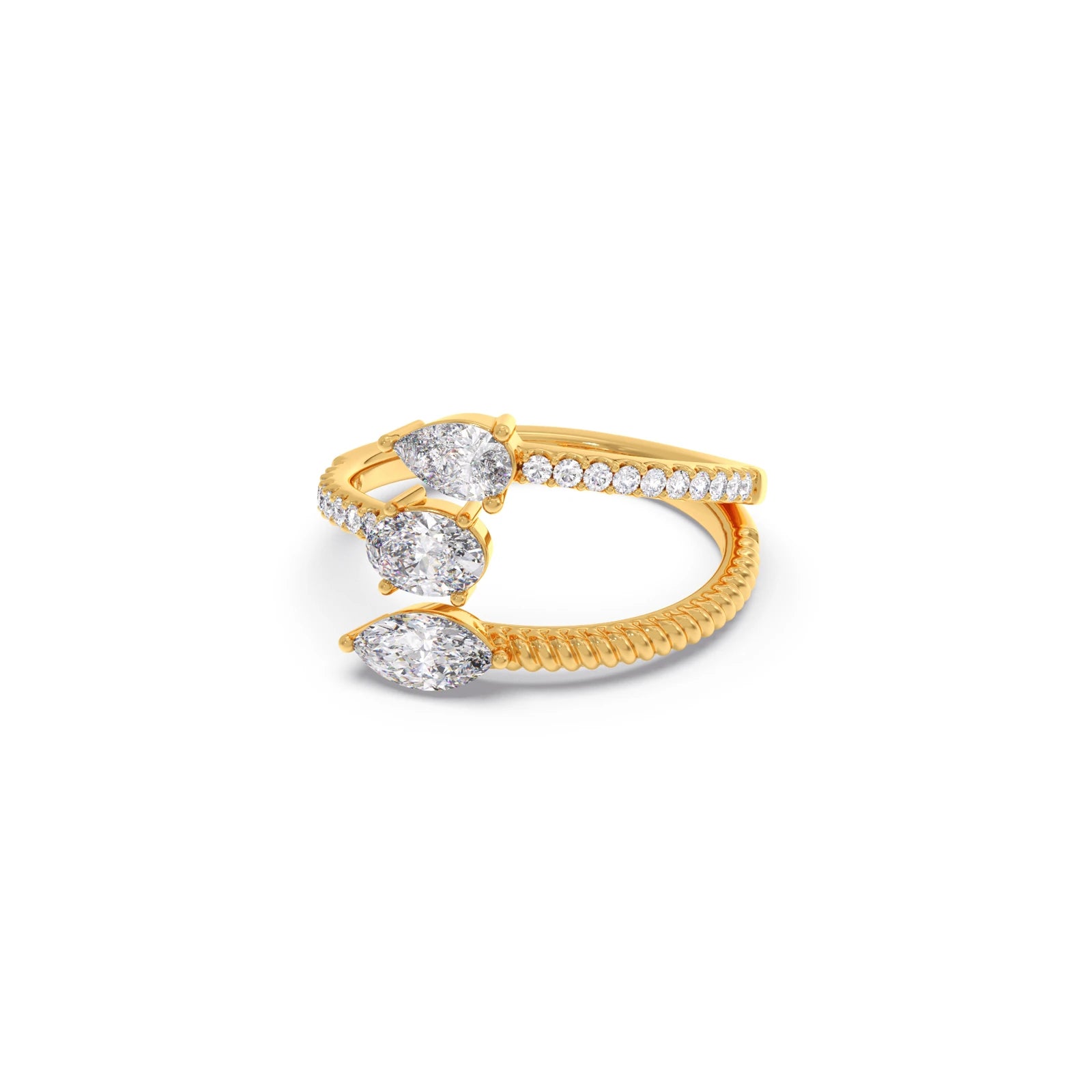 The Marquise, Pear, and Oval Diamond Bypass Ring features an elegant trio of distinct diamond shapes, artfully arranged in a flowing bypass design. Each stone brings its own brilliance and charm, creating a unique and graceful statement piece that celebrates individuality, harmony, and timeless elegance.
