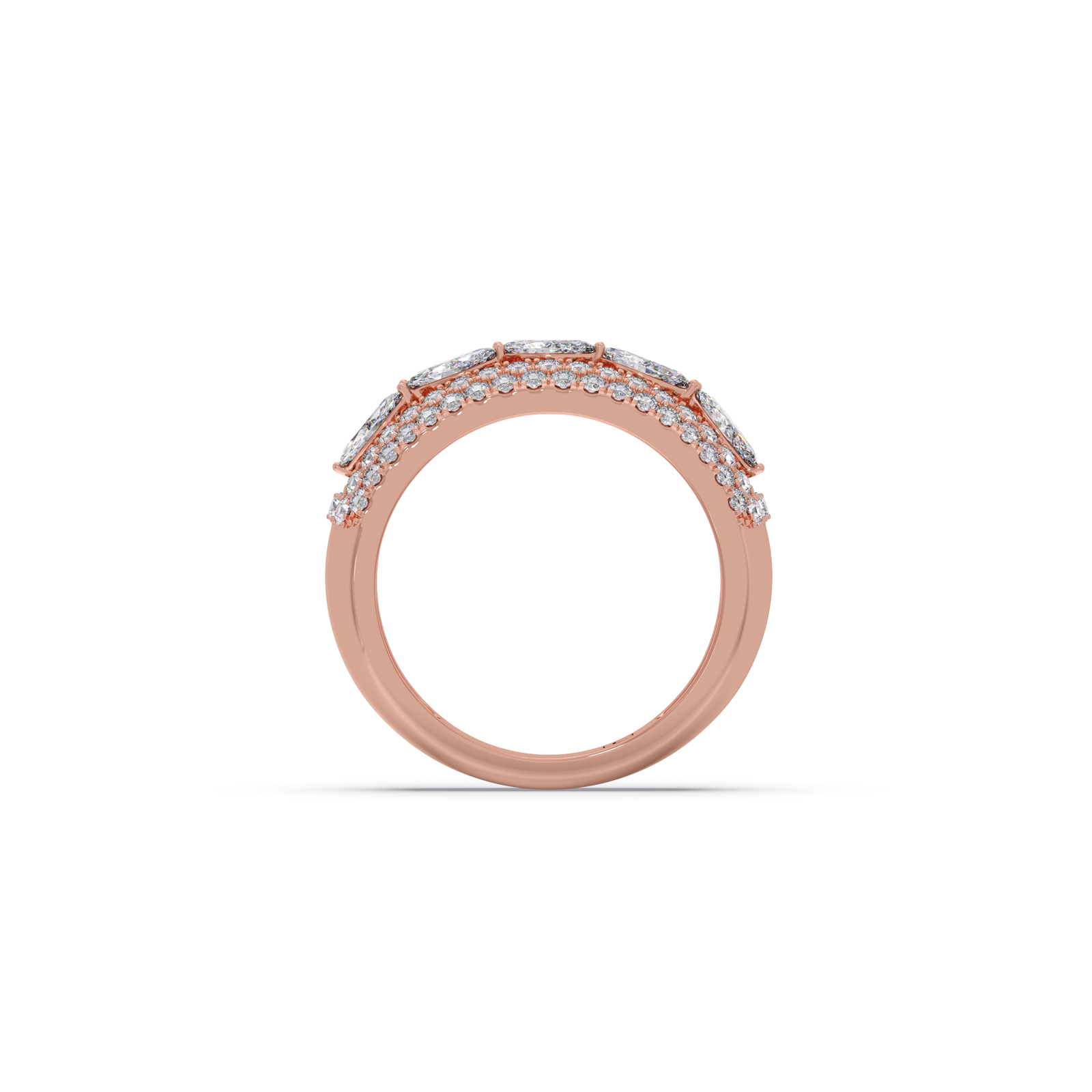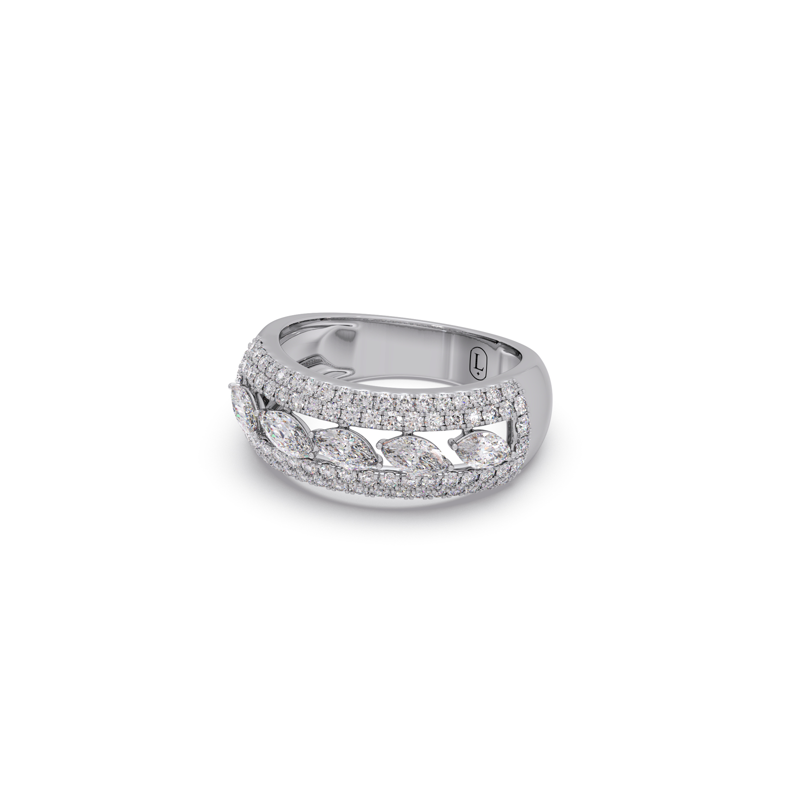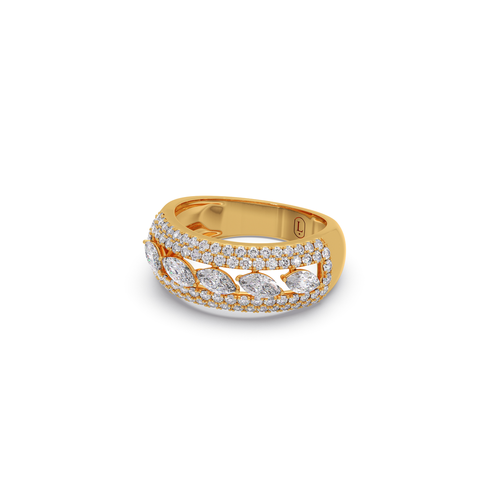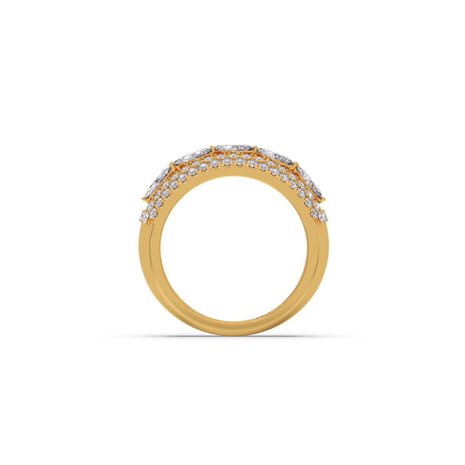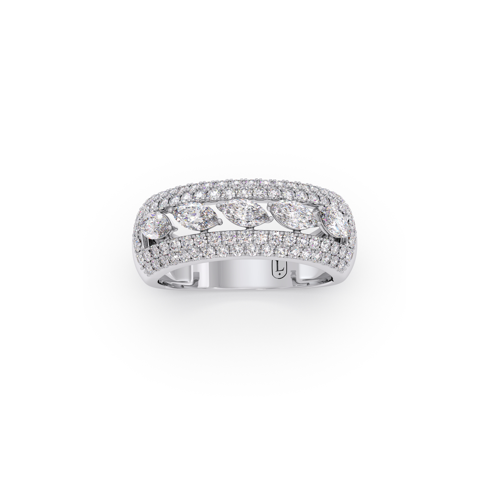 Crafted for a lifetime of love, this magnificent anniversary band features a central row of brilliant marquise-cut diamonds. Two outer rows of shimmering pave-set round diamonds complete the design, creating a breathtaking display of sparkle. The wide, polished gold setting makes this piece a true statement of enduring elegance.