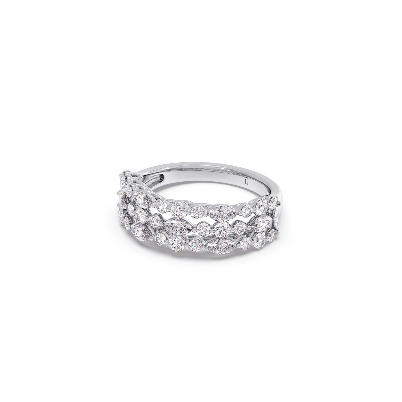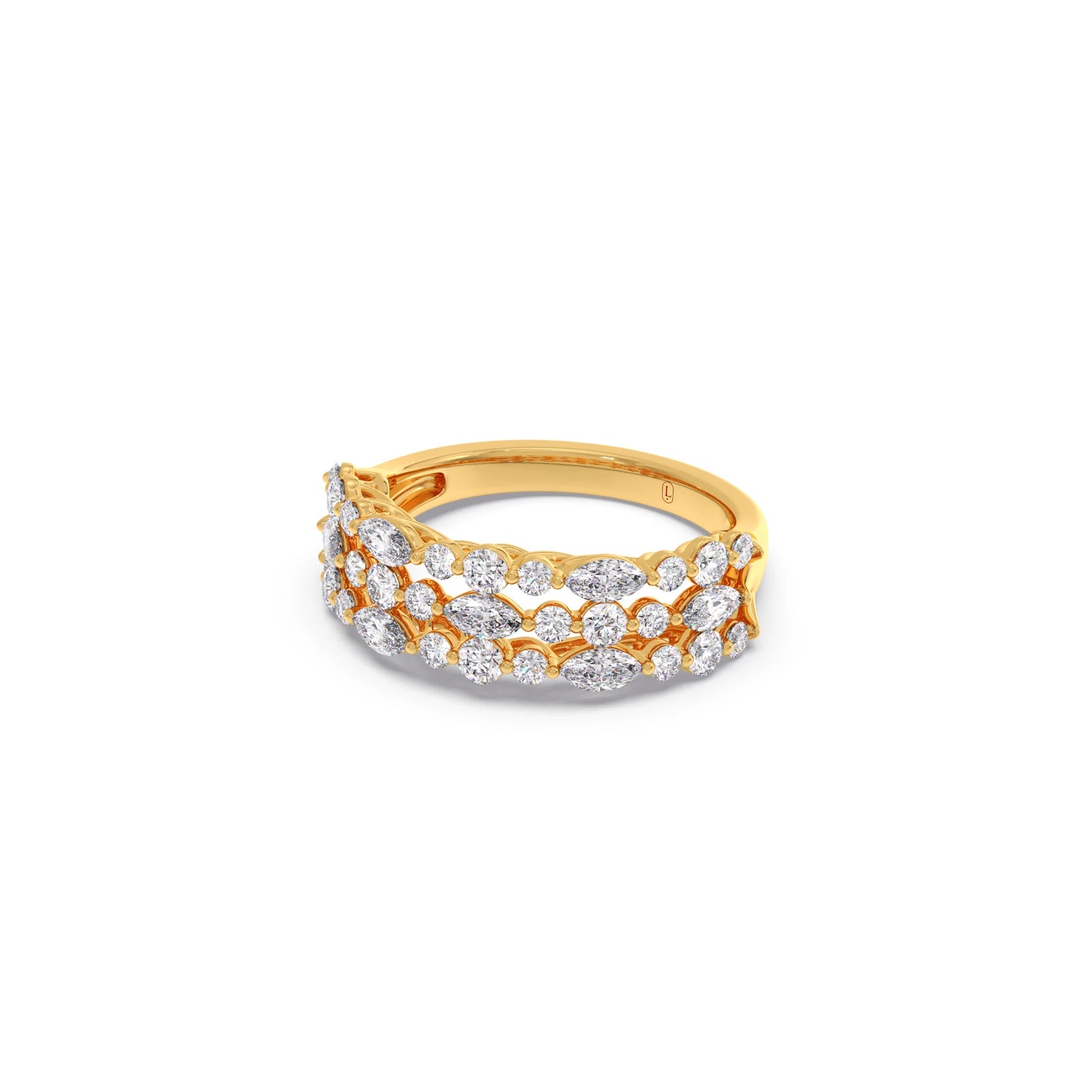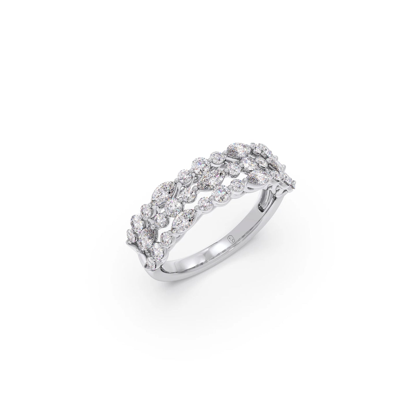 This captivating ring features a harmonious cluster of sparkling diamonds, showcasing both the elegant elongated shape of marquise-cut stones and the classic brilliance of round-cut diamonds. The varying shapes are artfully arranged to create a visually dynamic and luminous design. The carefully set diamonds catch and reflect light beautifully, resulting in a dazzling and unique statement piece. This ring offers a modern yet timeless appeal, perfect for adding a touch of sophisticated sparkle to any occasion.