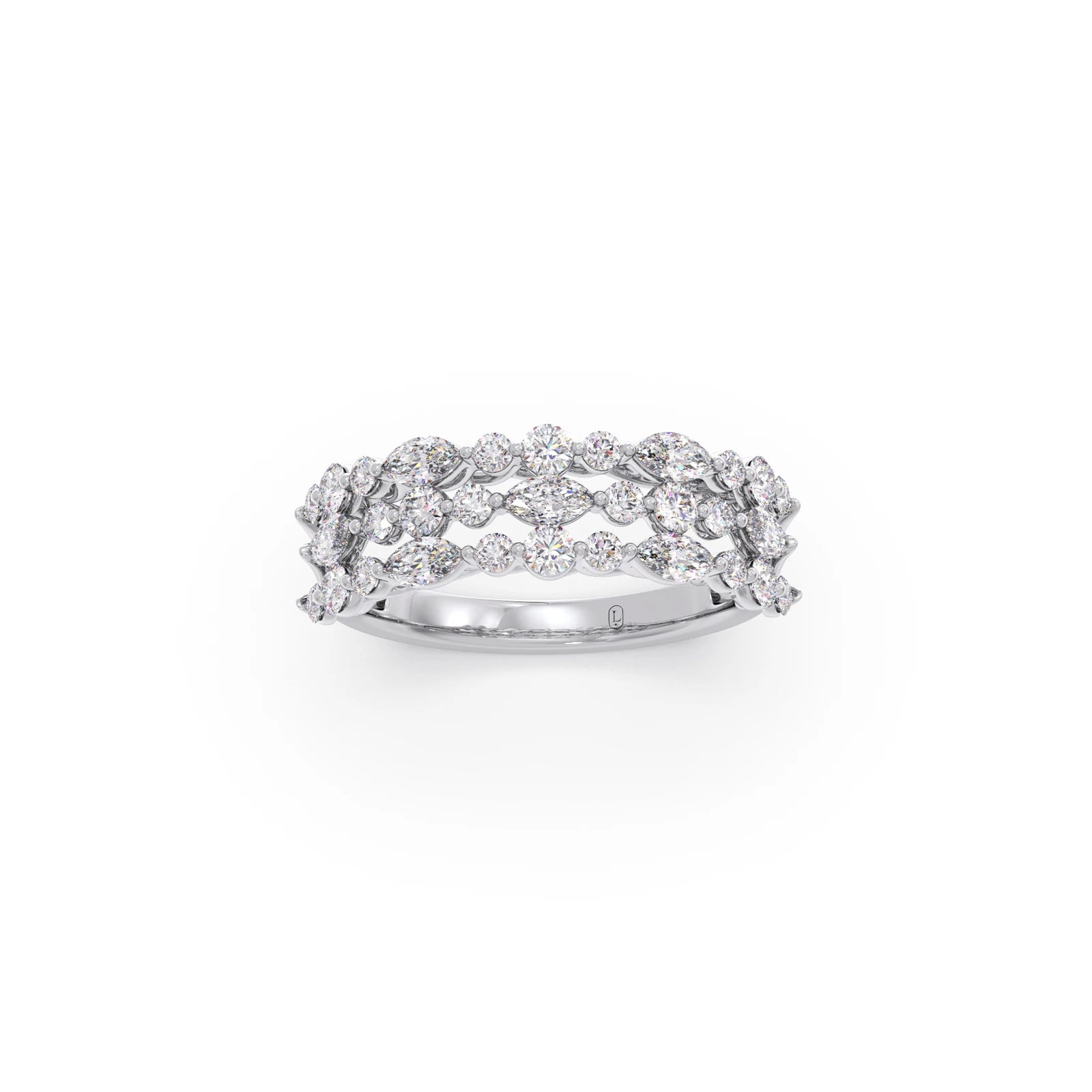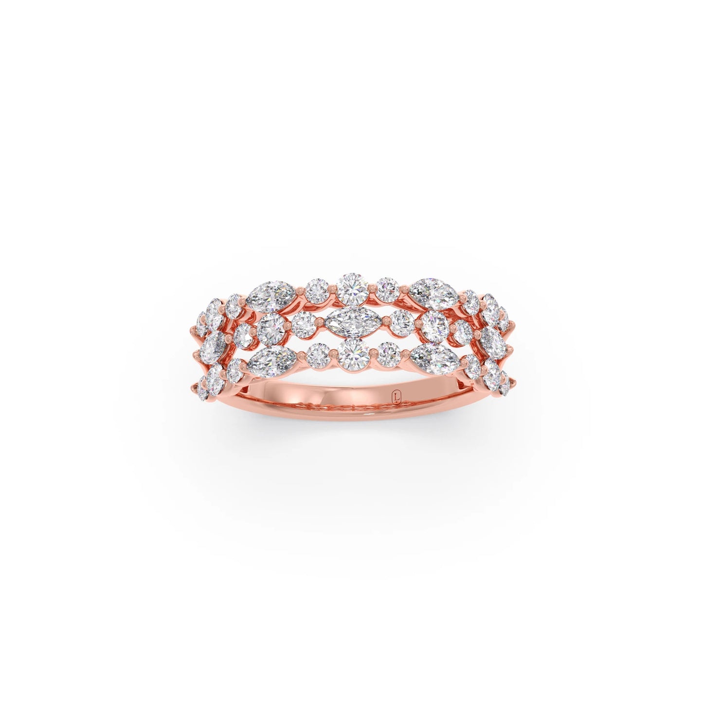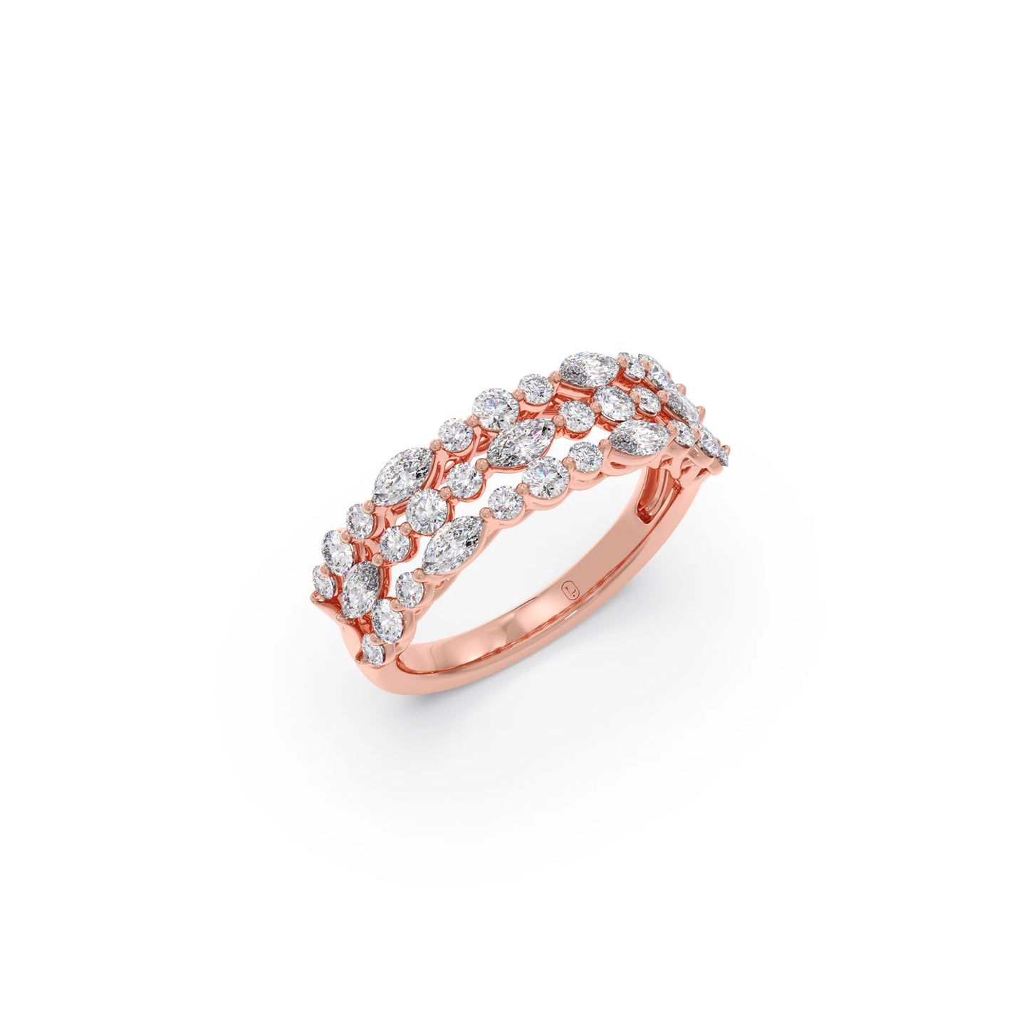 This captivating ring features a harmonious cluster of sparkling diamonds, showcasing both the elegant elongated shape of marquise-cut stones and the classic brilliance of round-cut diamonds. The varying shapes are artfully arranged to create a visually dynamic and luminous design. The carefully set diamonds catch and reflect light beautifully, resulting in a dazzling and unique statement piece. This ring offers a modern yet timeless appeal, perfect for adding a touch of sophisticated sparkle to any occasion.