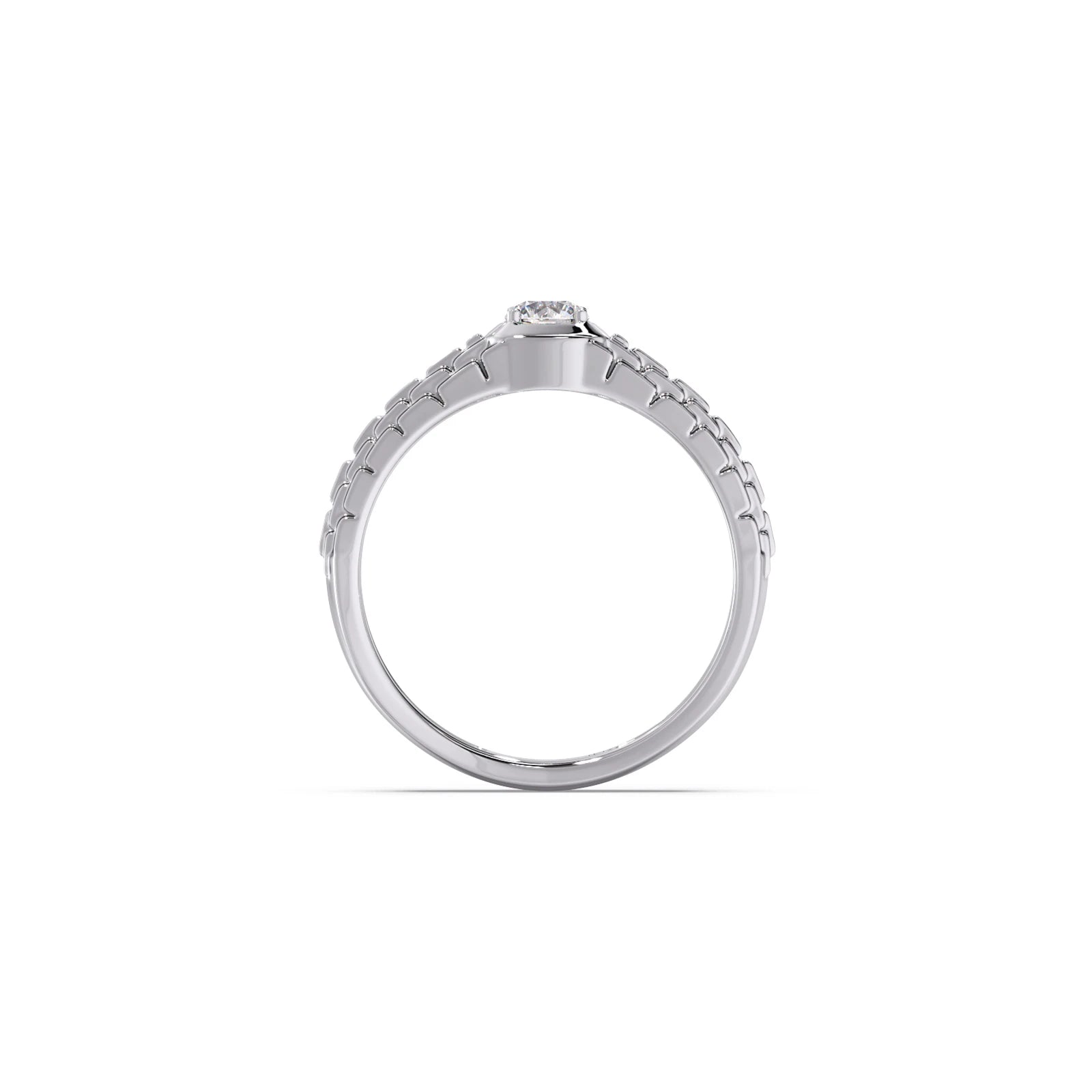 This men's ring features a unique textured band, adding a touch of rugged sophistication. A brilliant lab-grown diamond (LGD) solitaire takes center stage, offering ethical sparkle. The contrast between the textured metal and the clean lines of the setting creates a modern and distinctive look. Perfect for everyday wear or a special occasion.