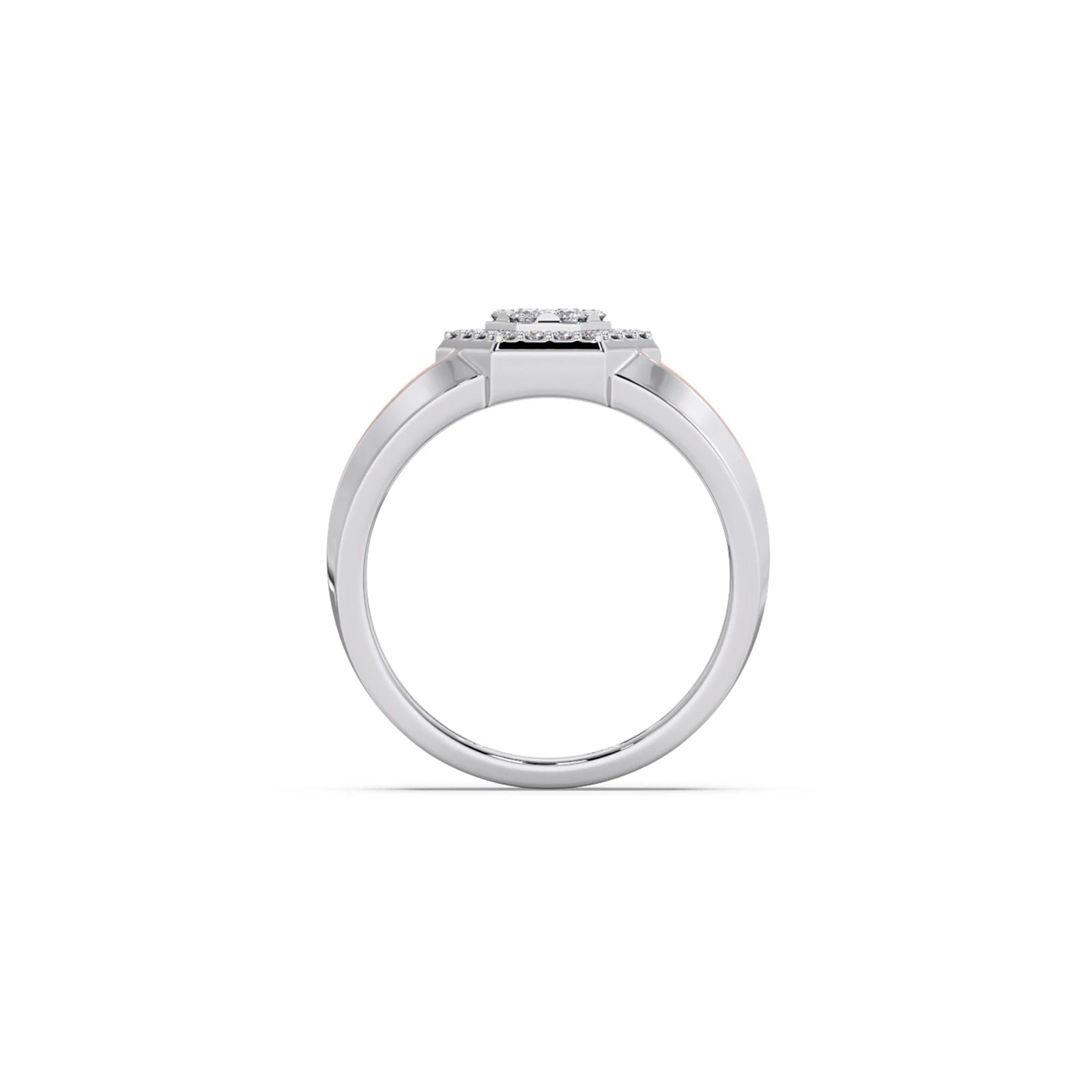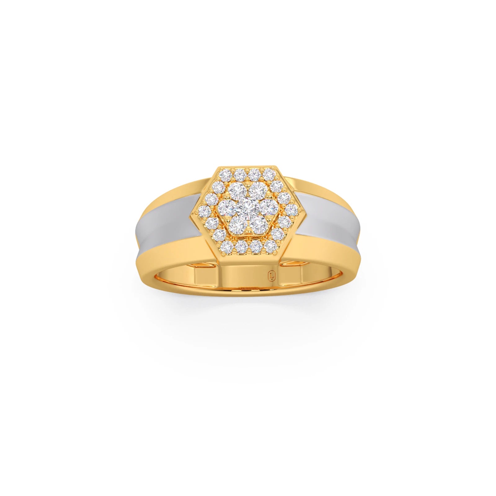 This men's ring features a bold, two-tone design with a hexagonal cluster of diamonds at its center. The contrasting metals enhance the brilliance of the diamonds, creating a modern and sophisticated look. Perfect for adding a touch of distinctive style to any occasion.