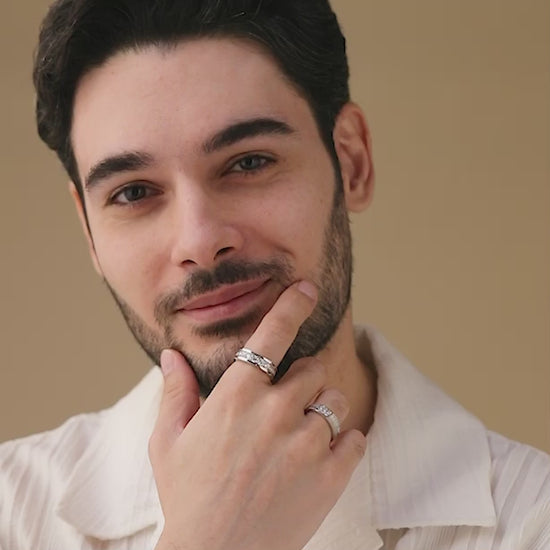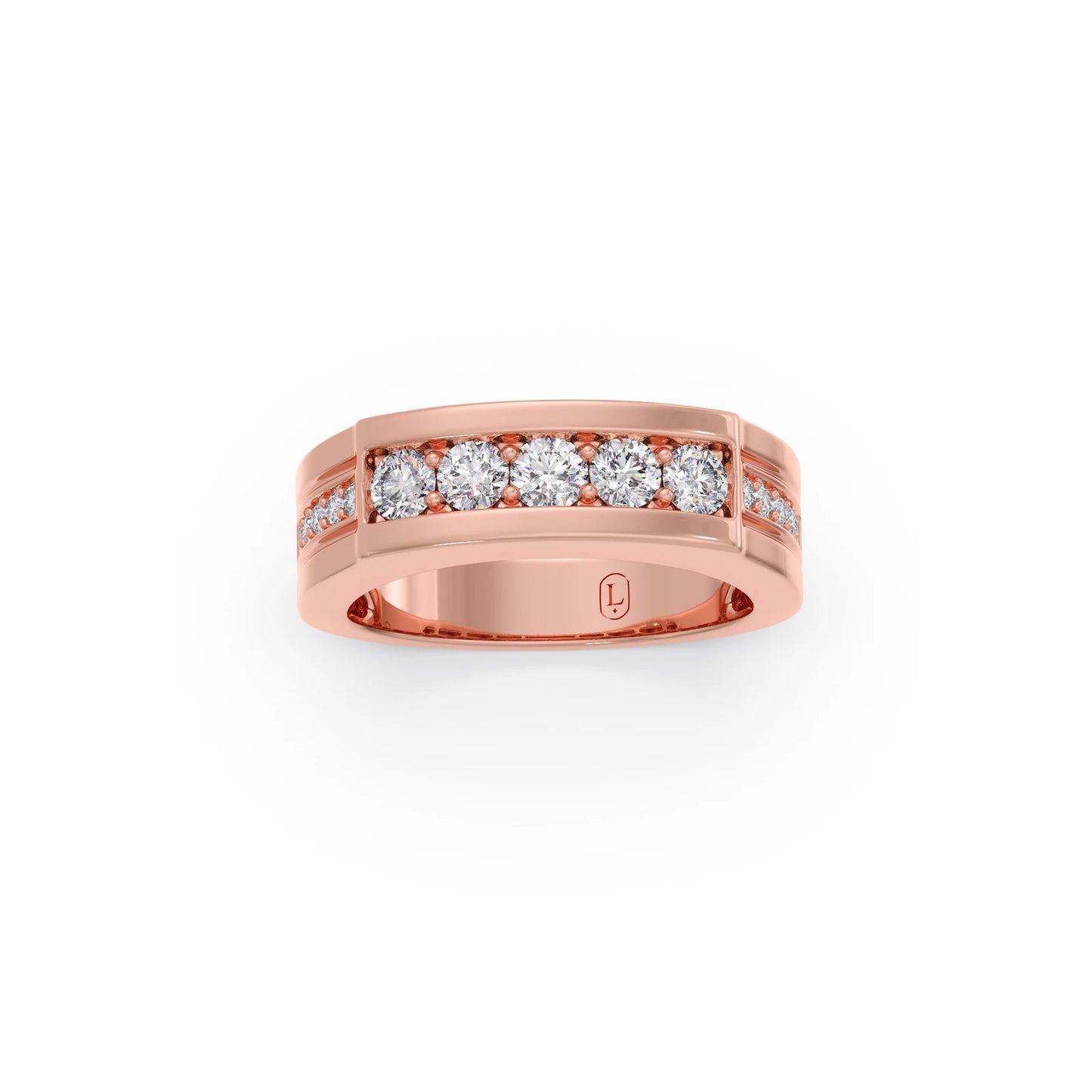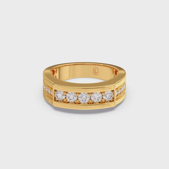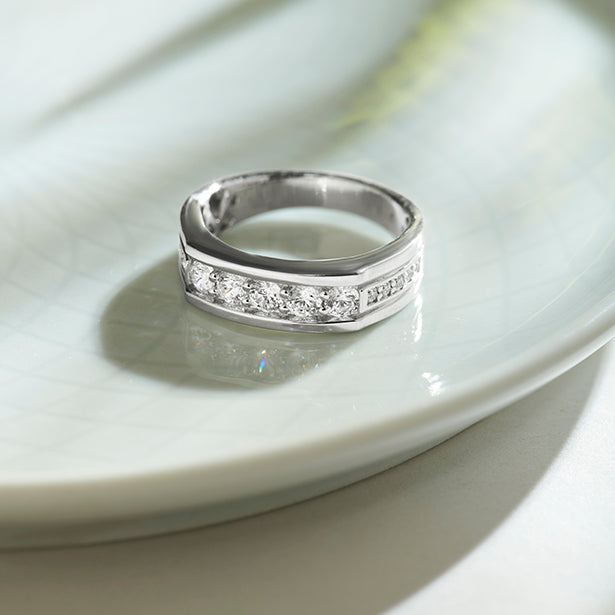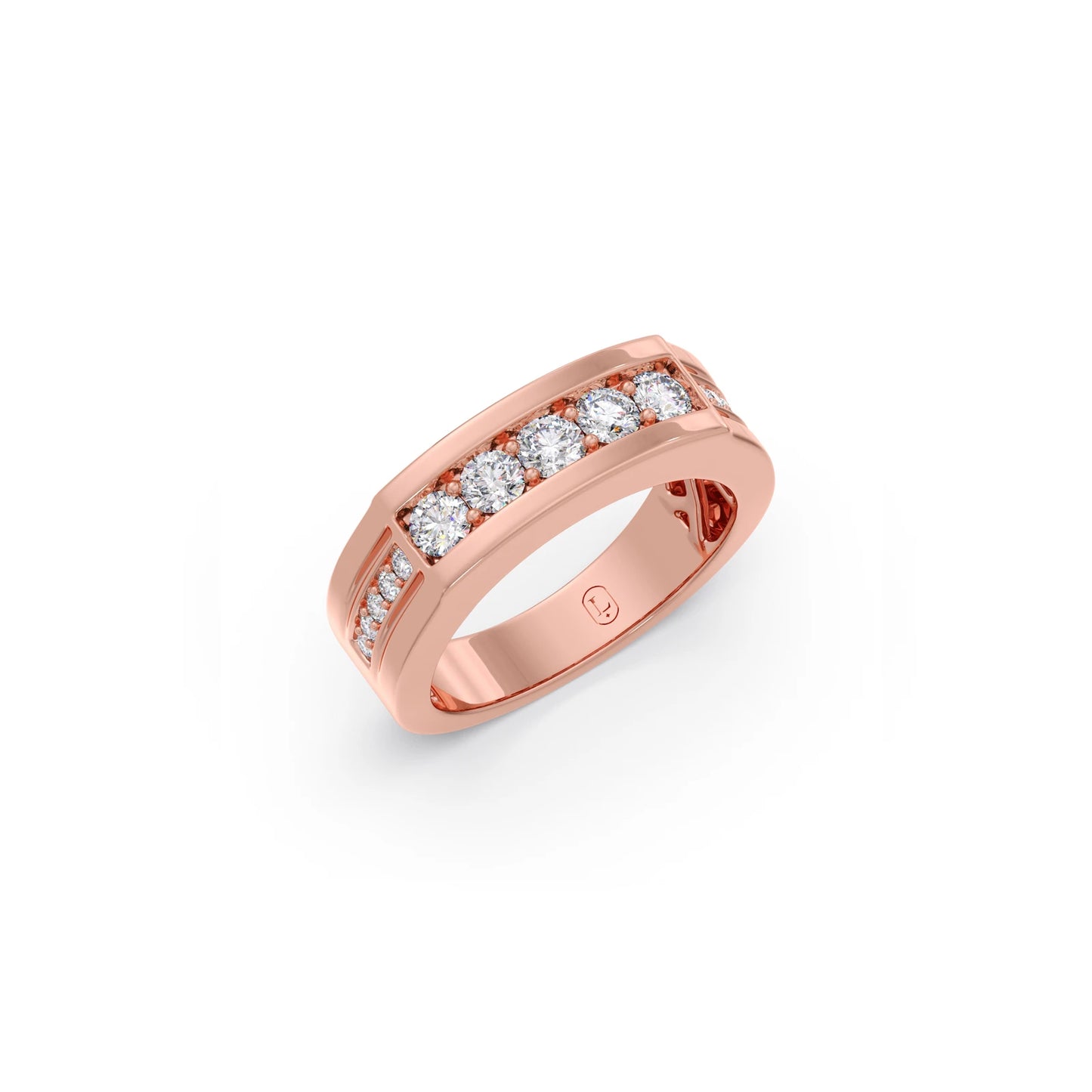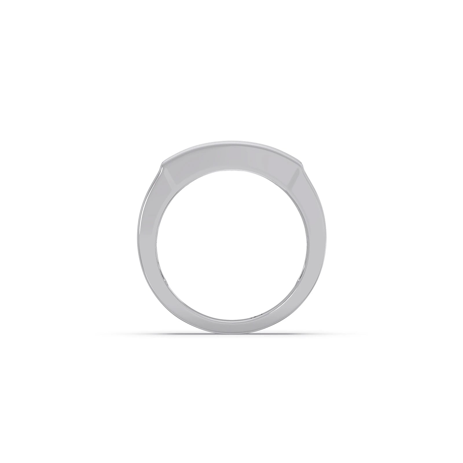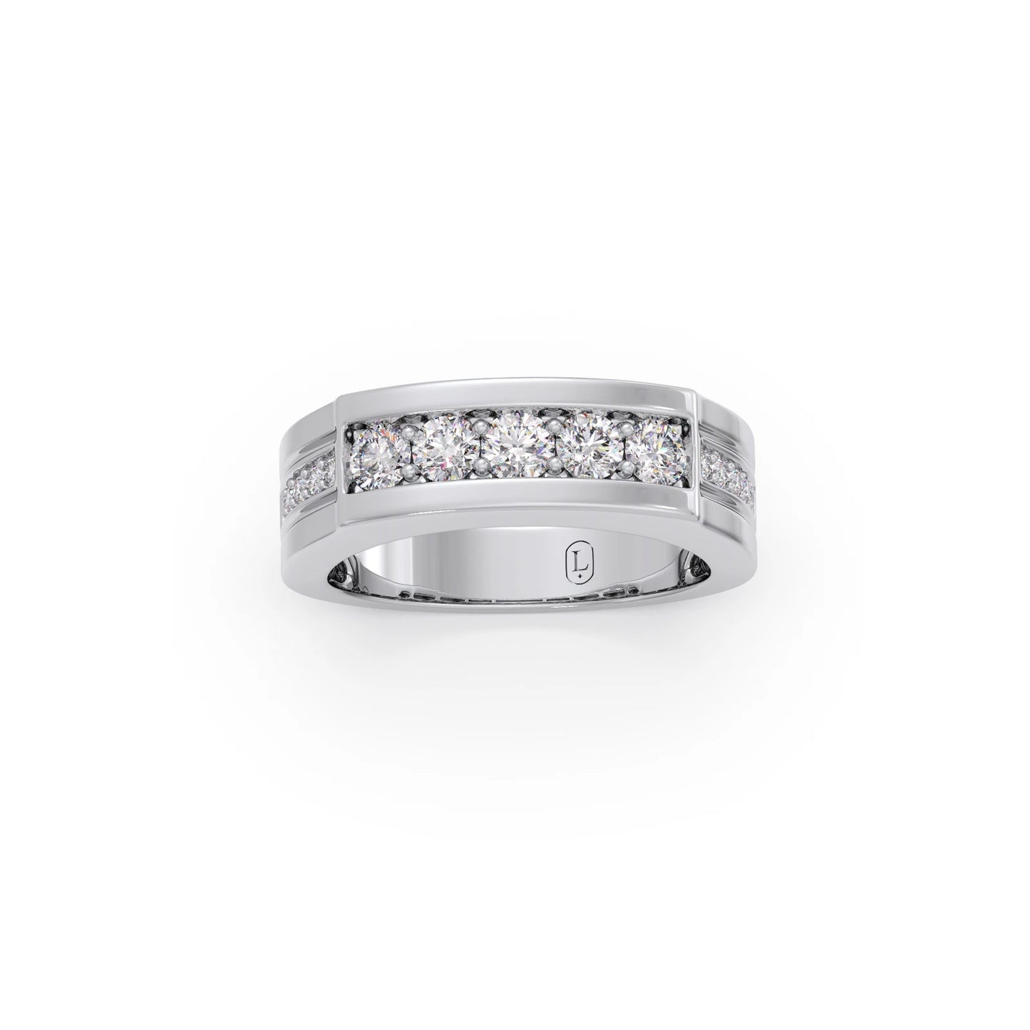 Crafted for the modern man, this band features a sleek design with a row of precisely set round diamonds adding a touch of understated luxury. Its contemporary style offers a sophisticated and masculine appeal, perfect for everyday wear or a distinguished statement. A symbol of enduring style and commitment.