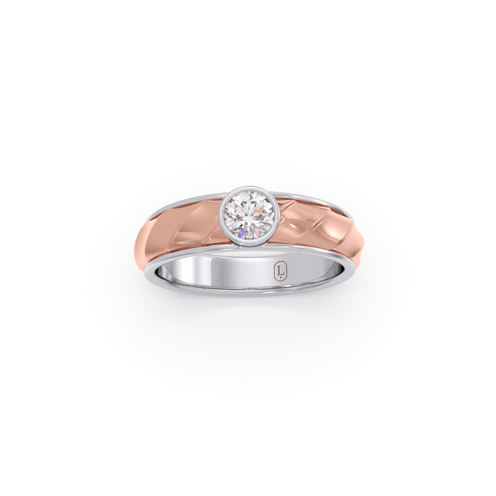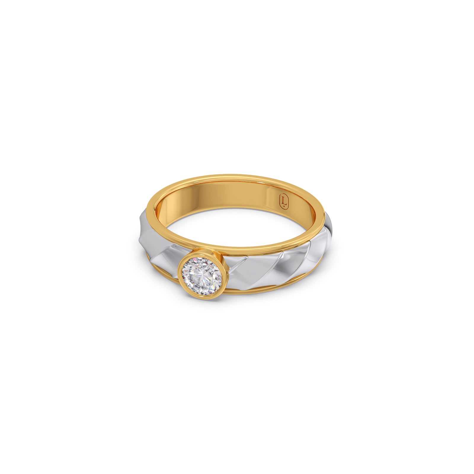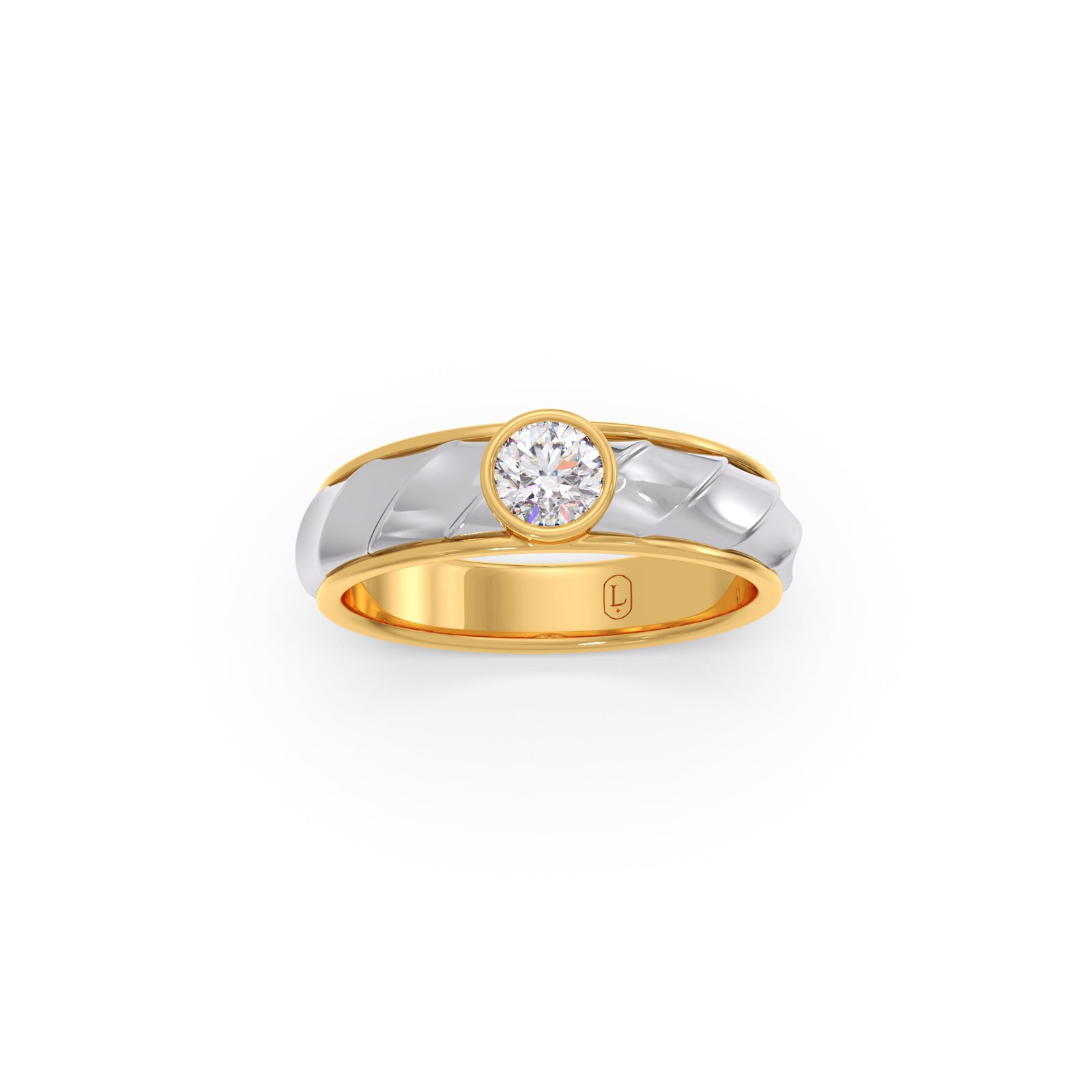 Bold yet elegant, this ring features a 0.42 ct. Round brilliant-cut Lucira Grown Diamond, bezel-set at the center of a quilted yellow gold band bordered with polished white gold. A single-piece creation, it reflects refined strength and quiet confidence. Its dual-tone design symbolizes balance between tradition and innovation, stillness and motion. Crafted for the men who stand steady while the world moves around them.