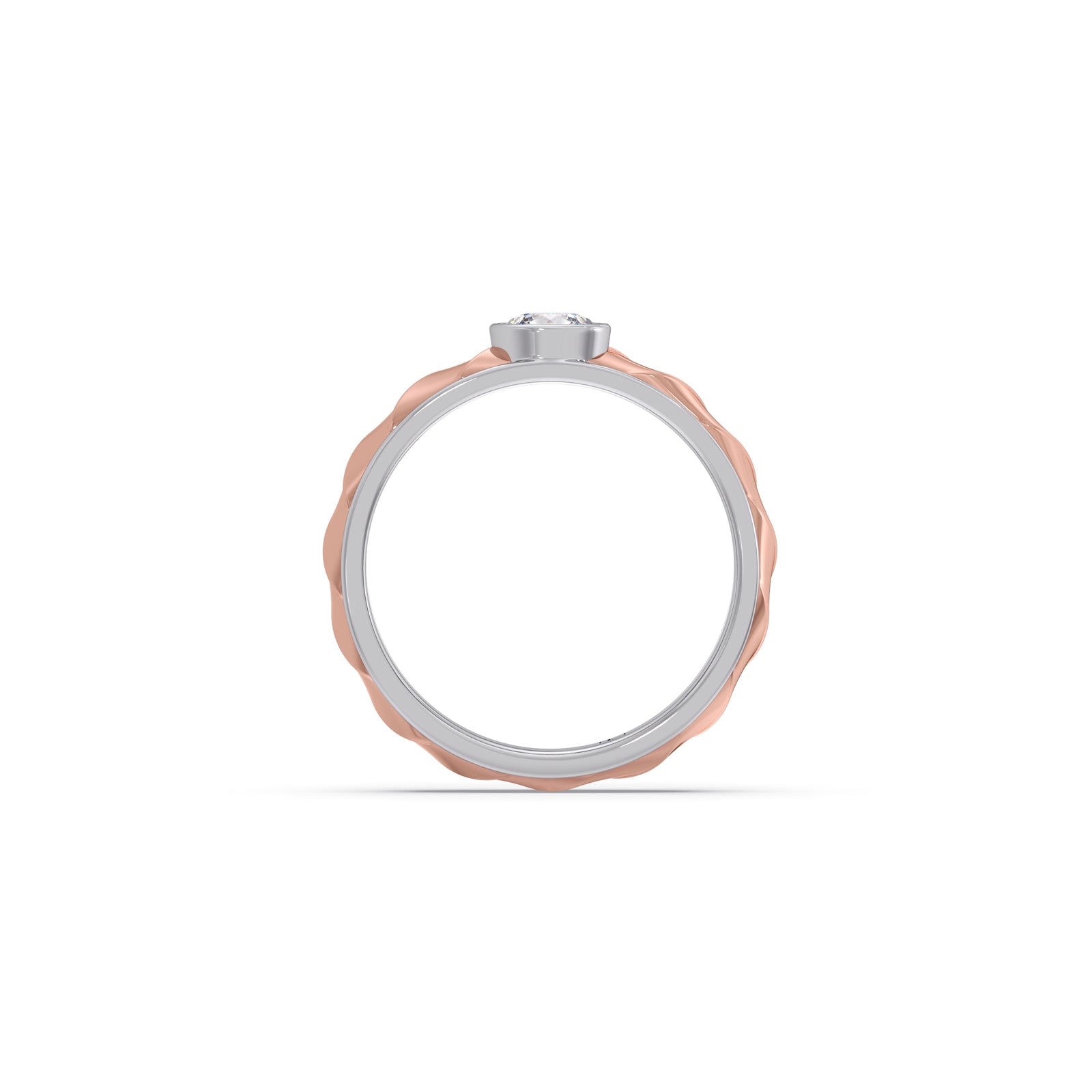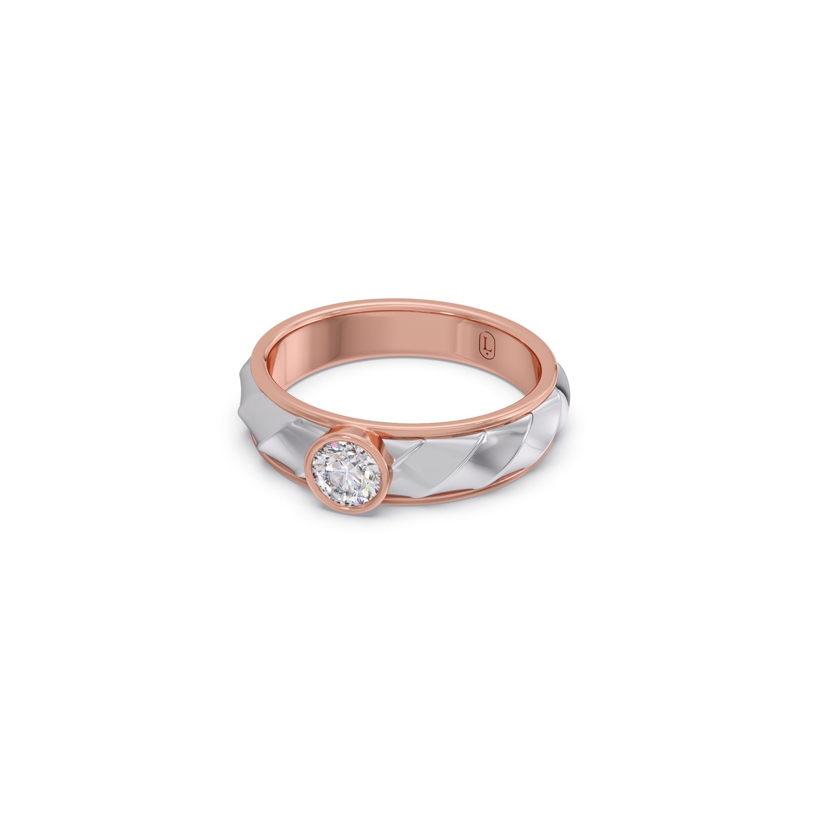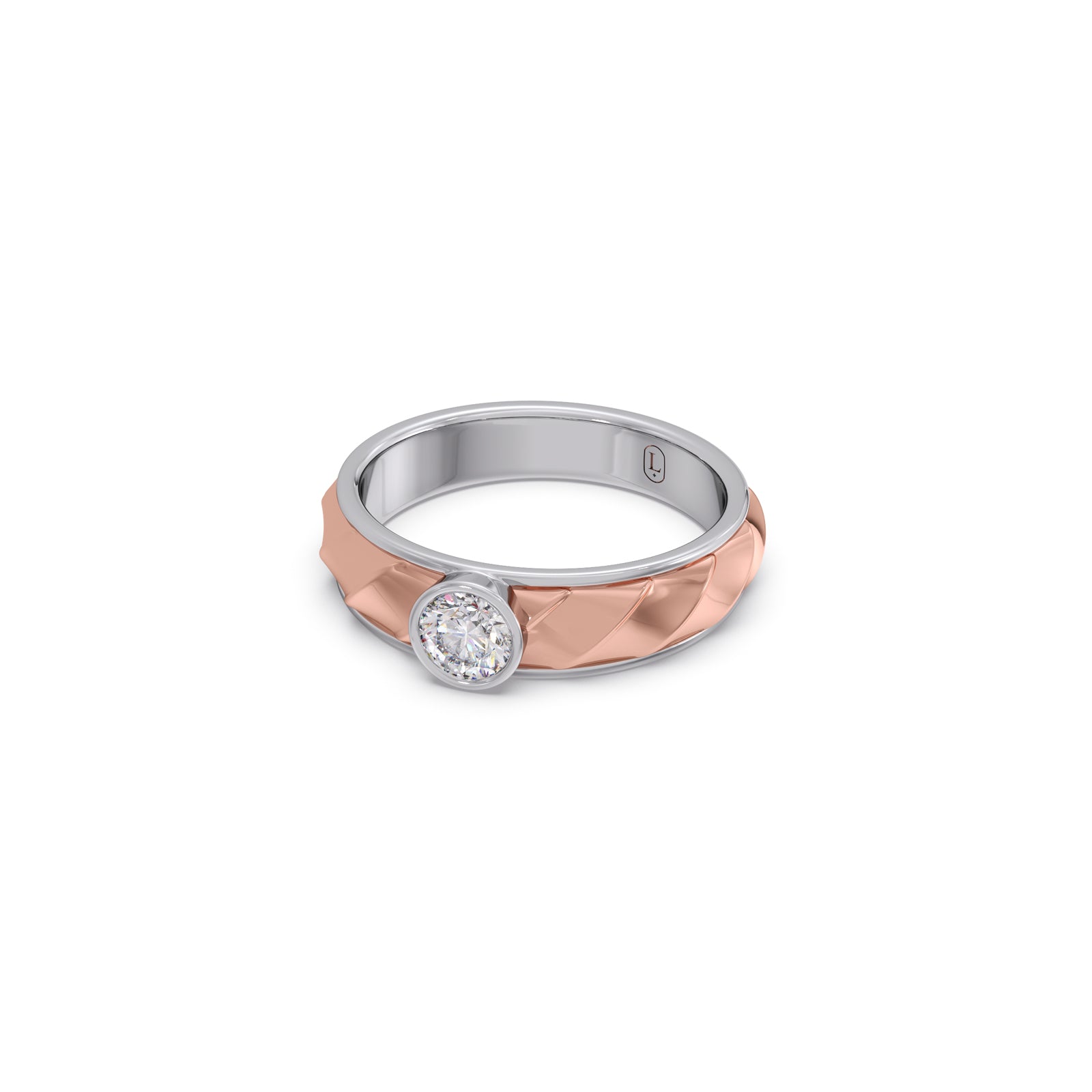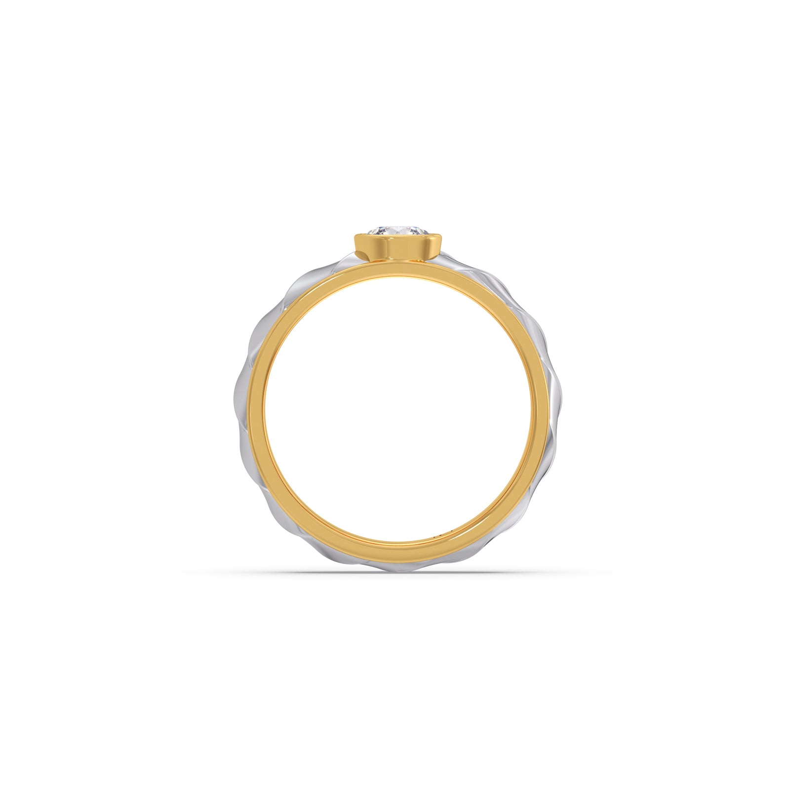 Bold yet elegant, this ring features a 0.42 ct. Round brilliant-cut Lucira Grown Diamond, bezel-set at the center of a quilted yellow gold band bordered with polished white gold. A single-piece creation, it reflects refined strength and quiet confidence. Its dual-tone design symbolizes balance between tradition and innovation, stillness and motion. Crafted for the men who stand steady while the world moves around them.