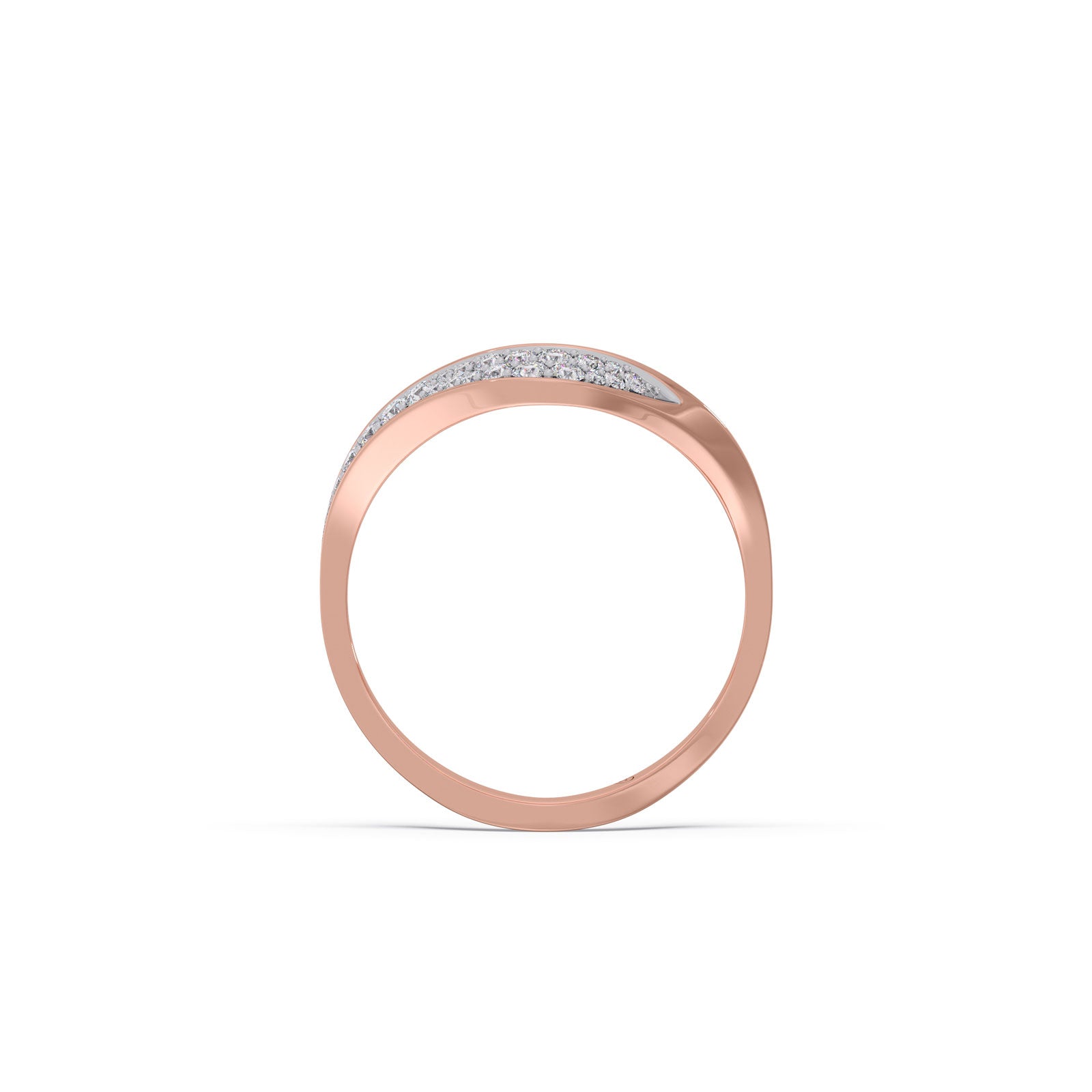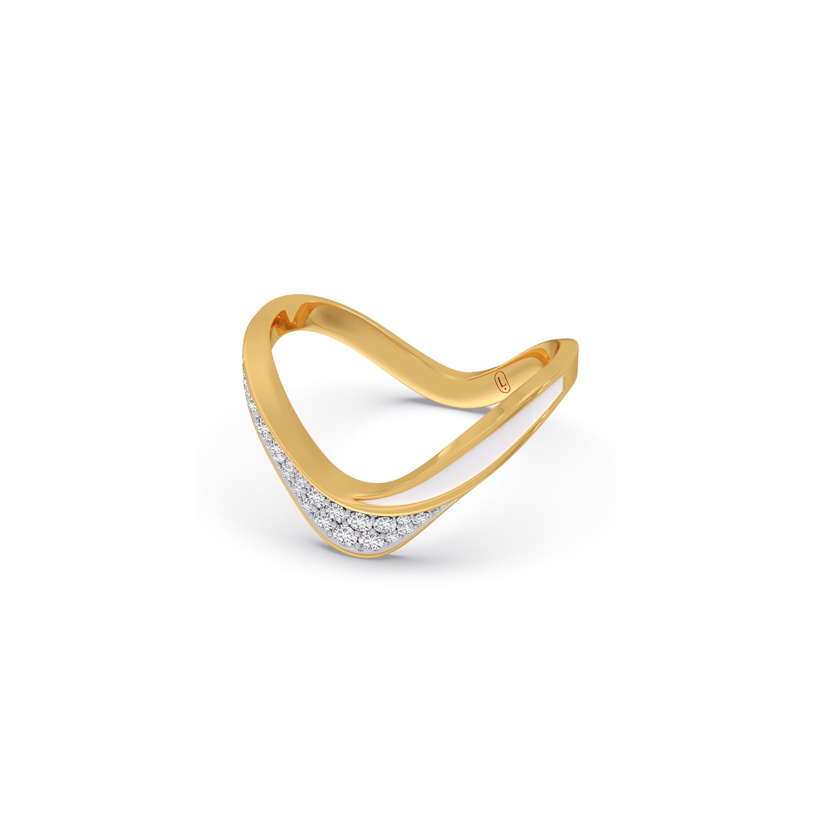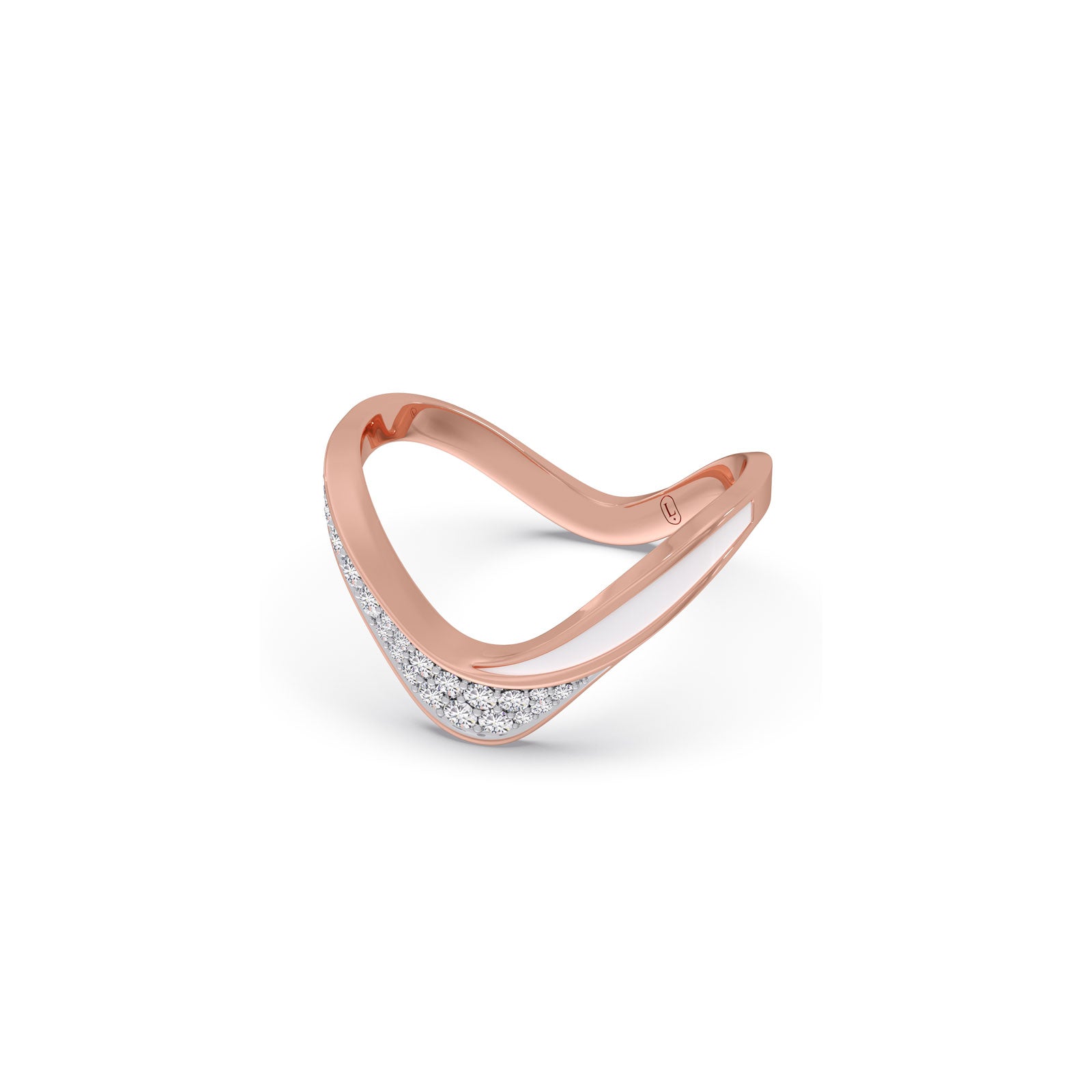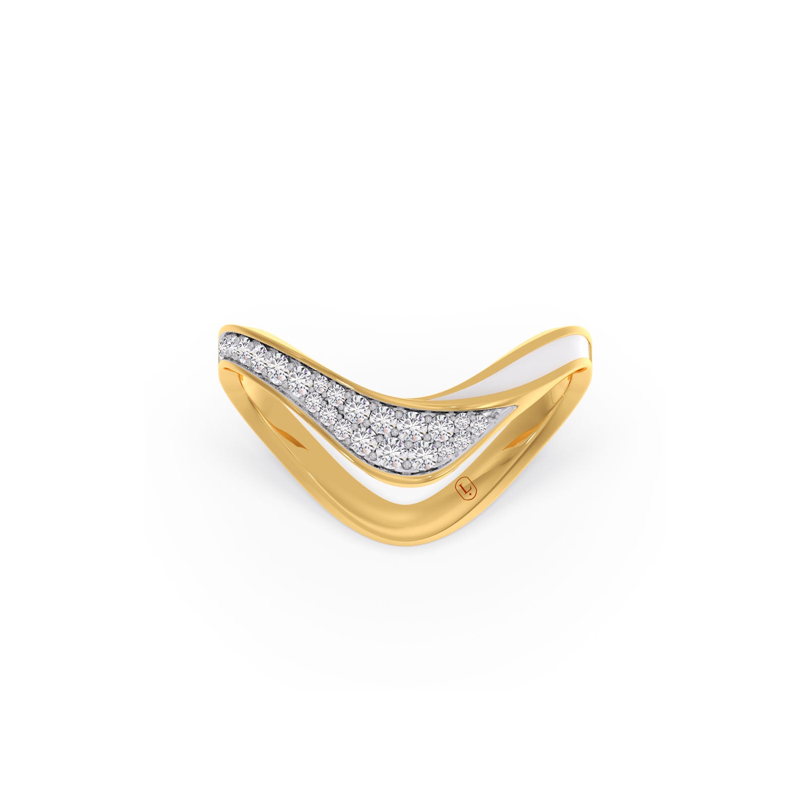 This chevron ring features a V-Shape type shank. The chevron shank are lined with row of classic pave-set round diamonds and soft white enamel layer. Ideal for both daily wear and special occasions, this ring exudes tradition with a modern sparkle.