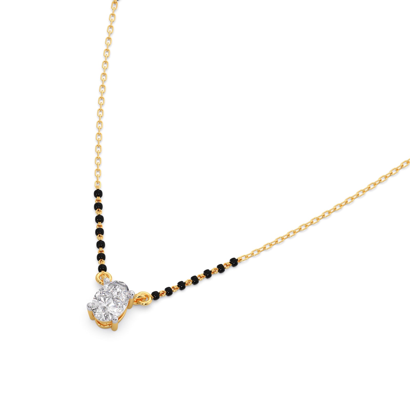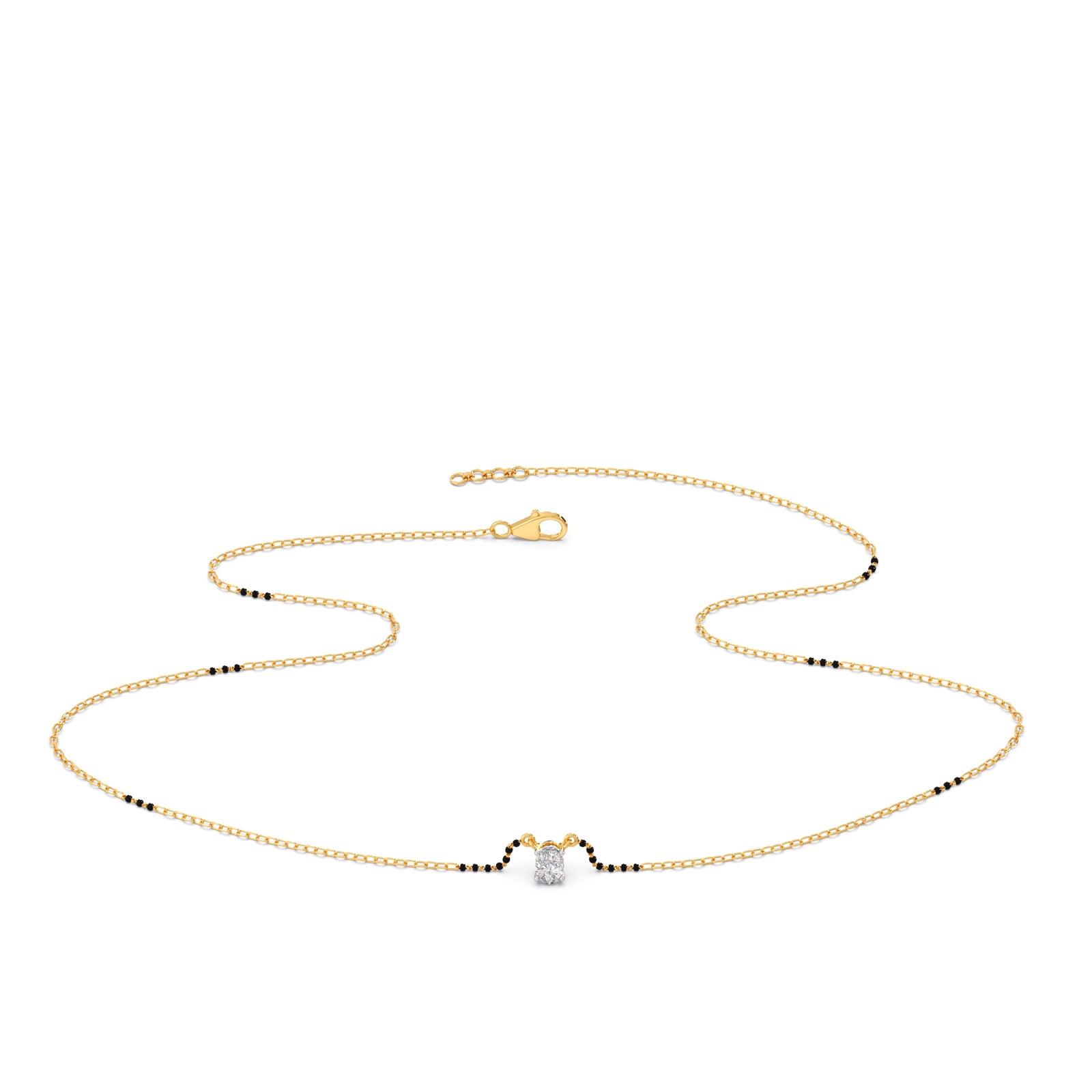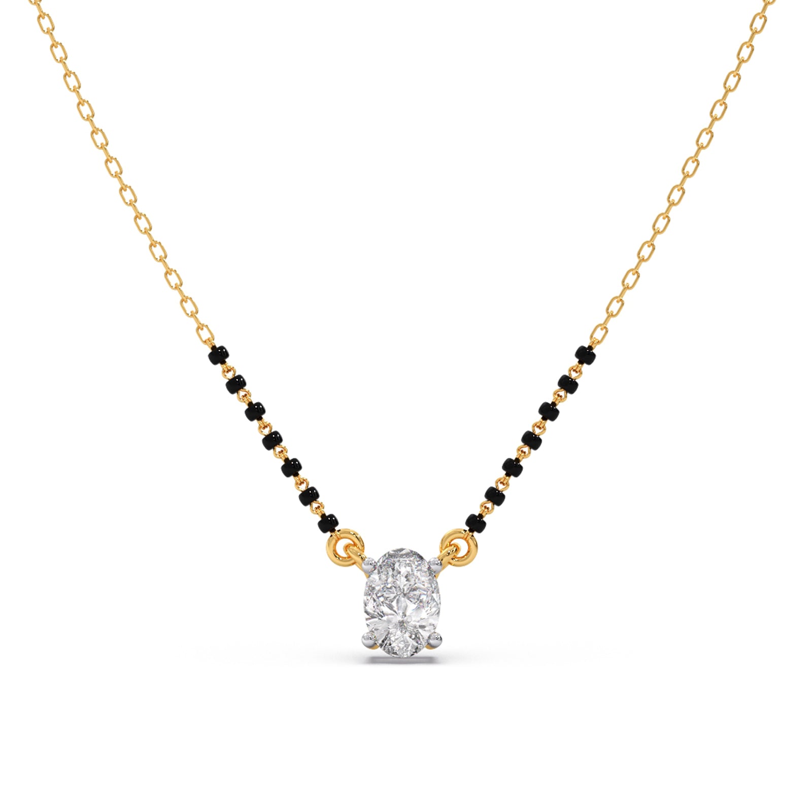 The Minimalist Oval Diamond Mangalsutra is a perfect blend of tradition and modern sophistication. Featuring a brilliant oval-cut solitaire diamond set in sleek gold, this design offers understated luxury. The delicate black bead accents symbolize protection and prosperity, making it an ideal choice for everyday wear or special occasions