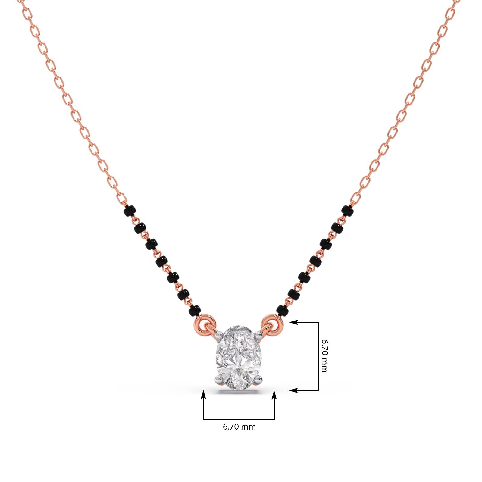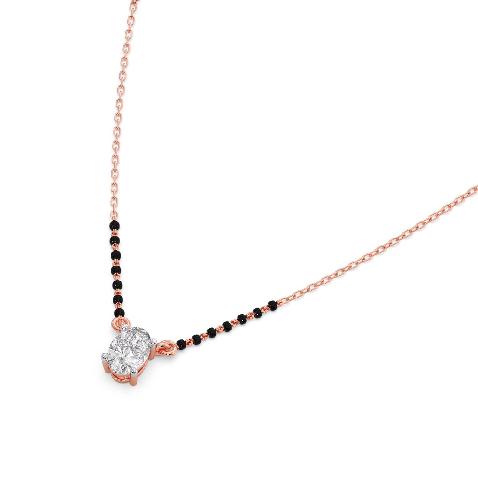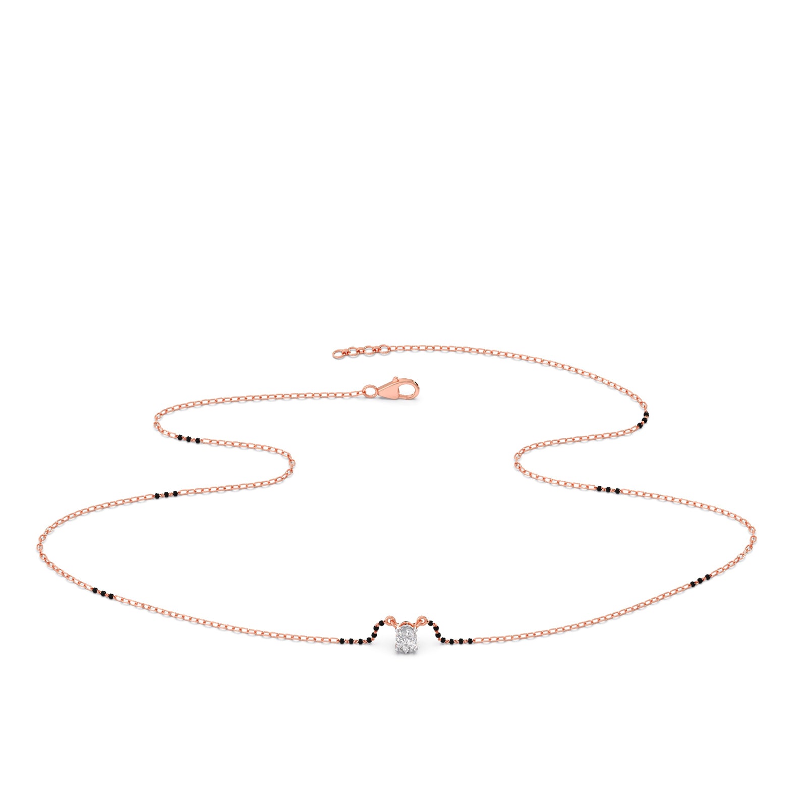 The Minimalist Oval Diamond Mangalsutra is a perfect blend of tradition and modern sophistication. Featuring a brilliant oval-cut solitaire diamond set in sleek gold, this design offers understated luxury. The delicate black bead accents symbolize protection and prosperity, making it an ideal choice for everyday wear or special occasions