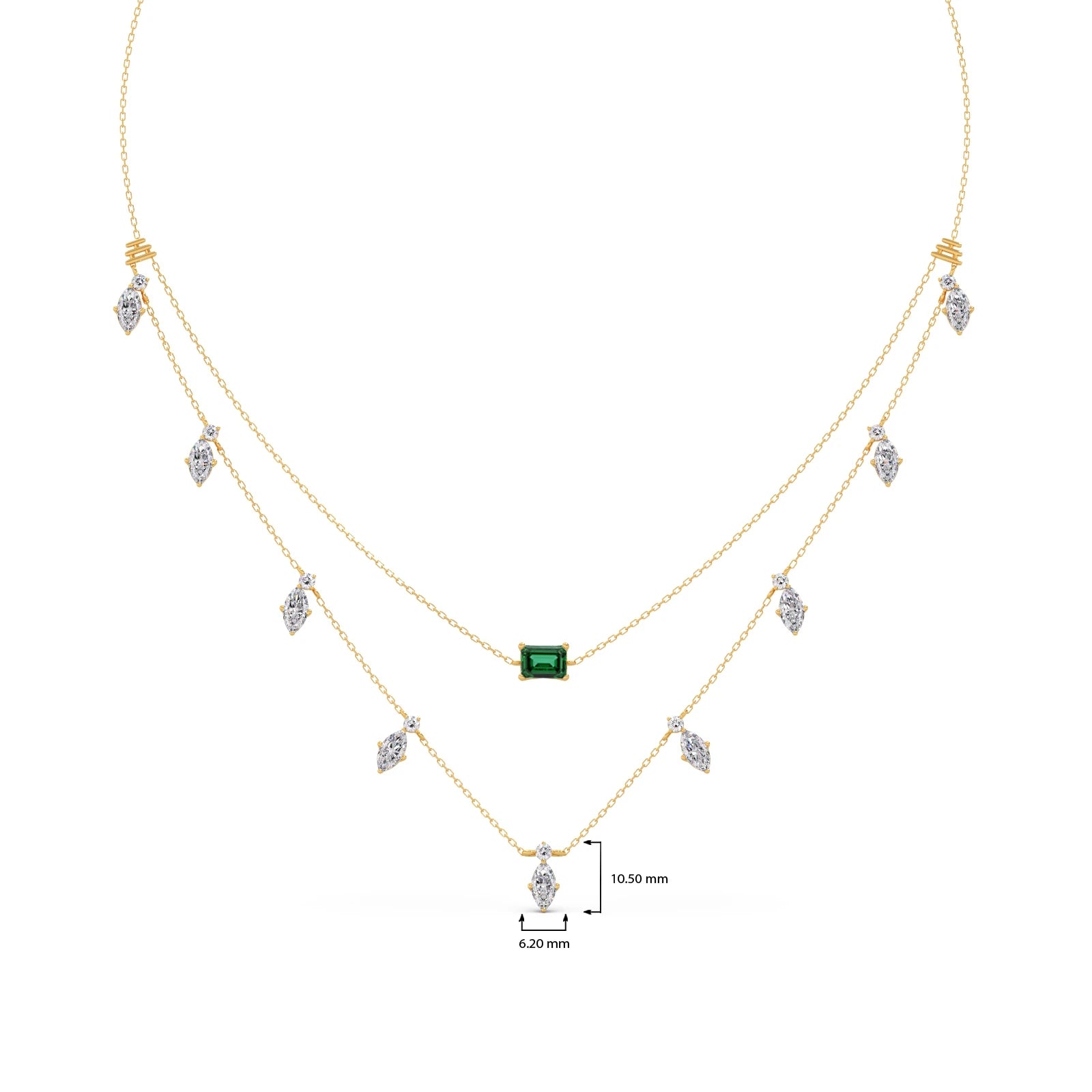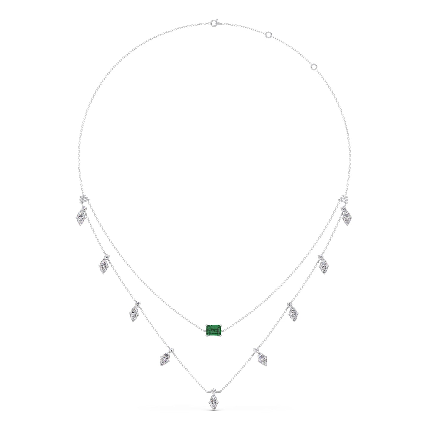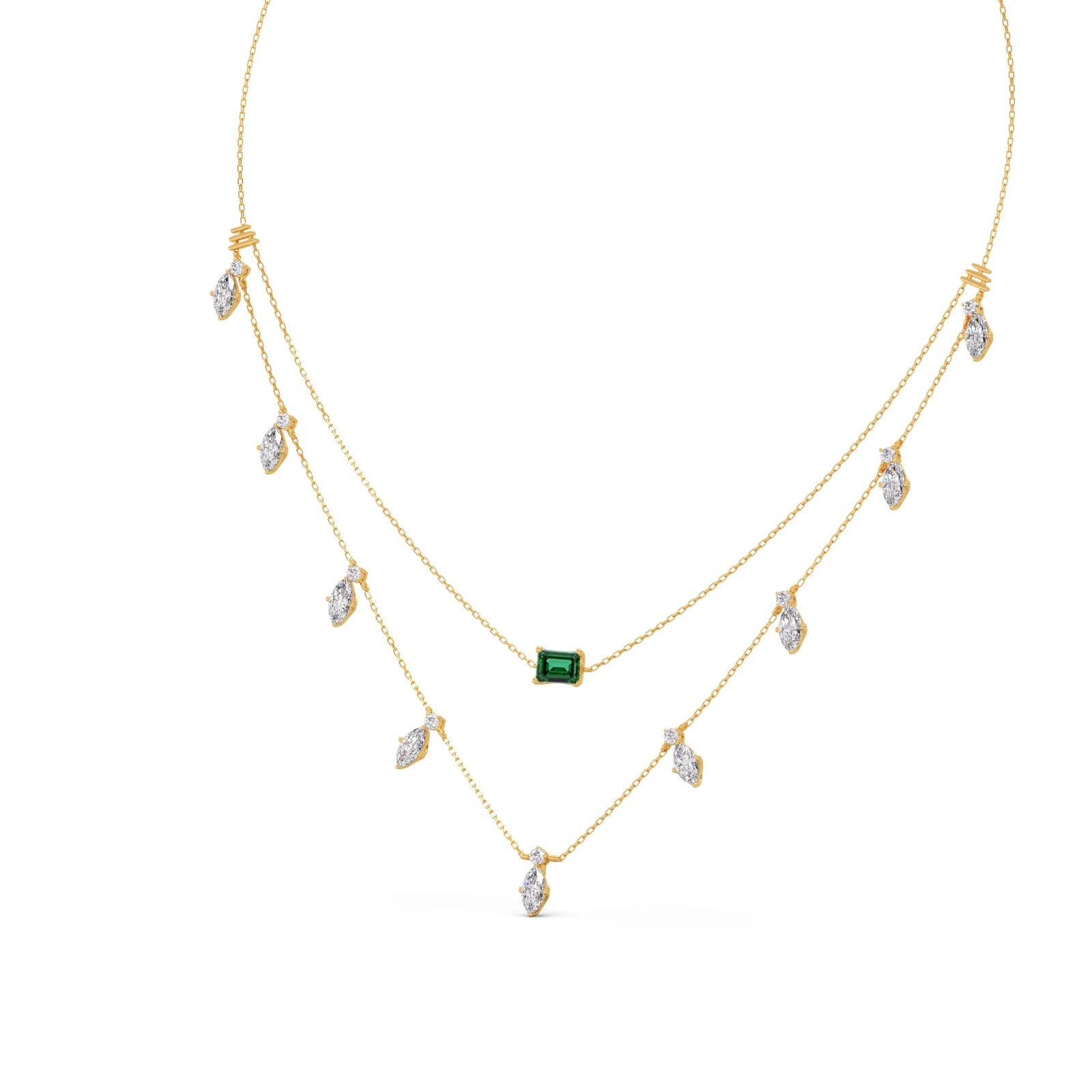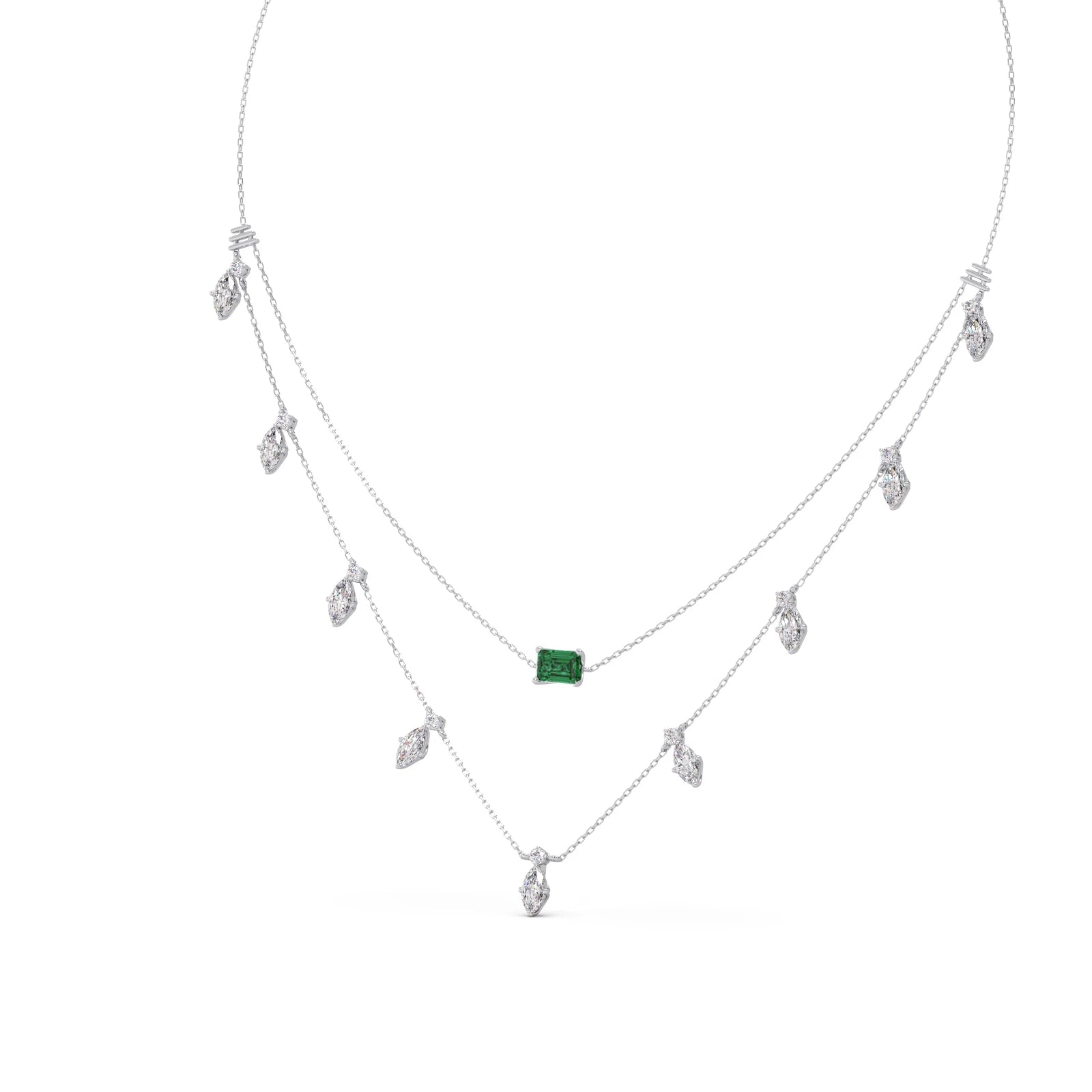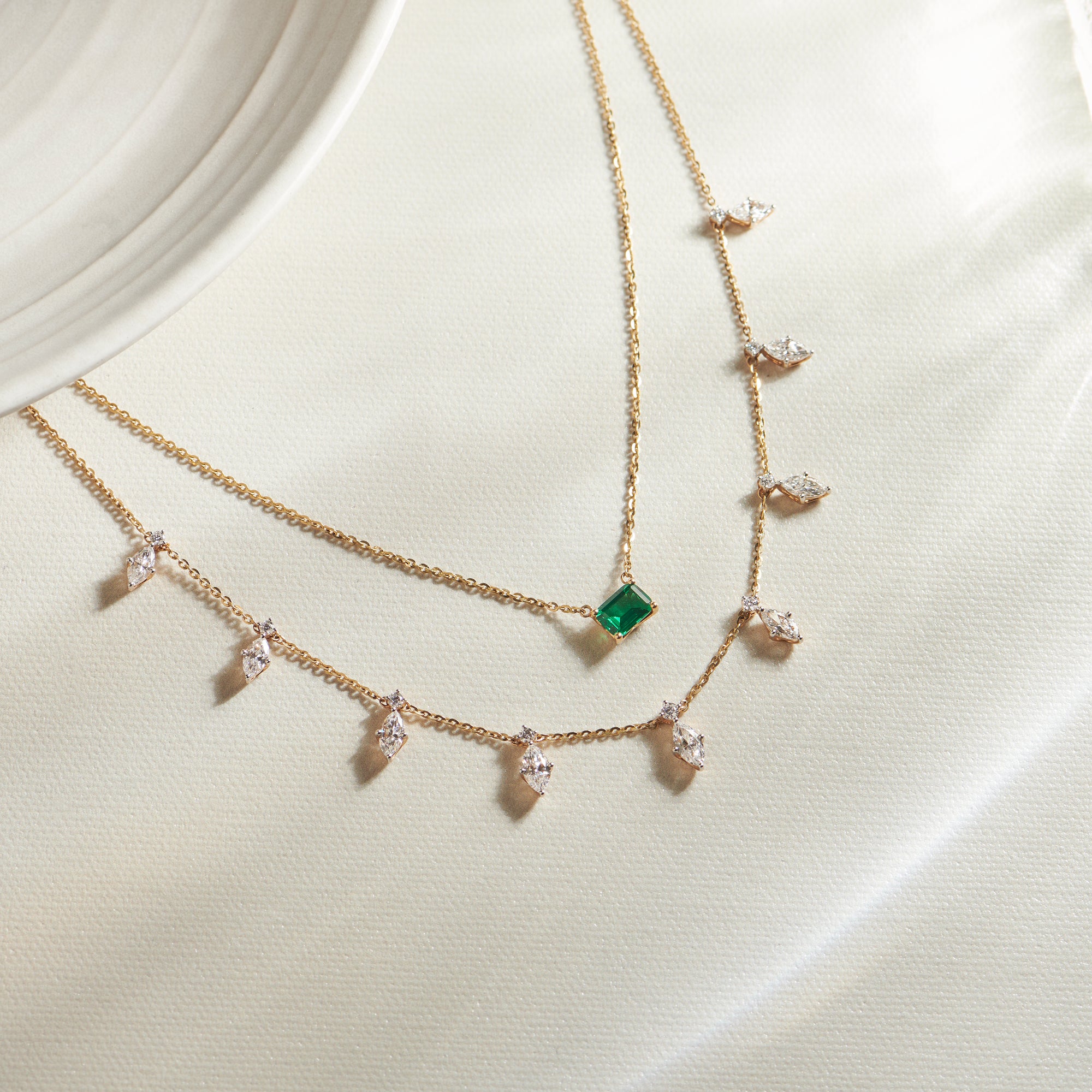 This elegant necklace features a series of sparkling diamonds in various cuts including round, marquise, and emerald gracefully dangling along a delicate chain. The combination of shapes creates a unique and eye-catching design with beautiful movement and brilliance.