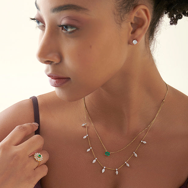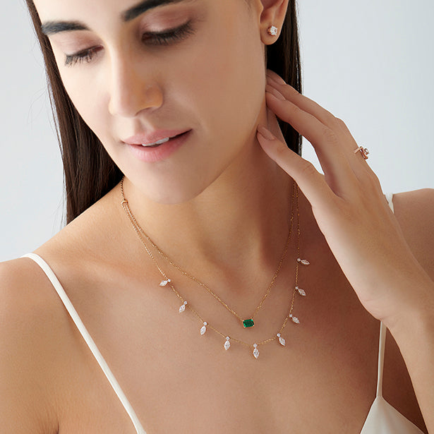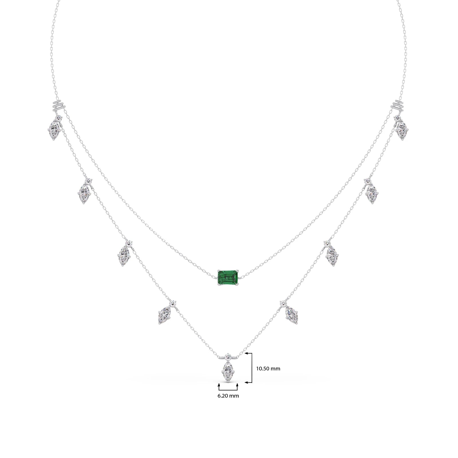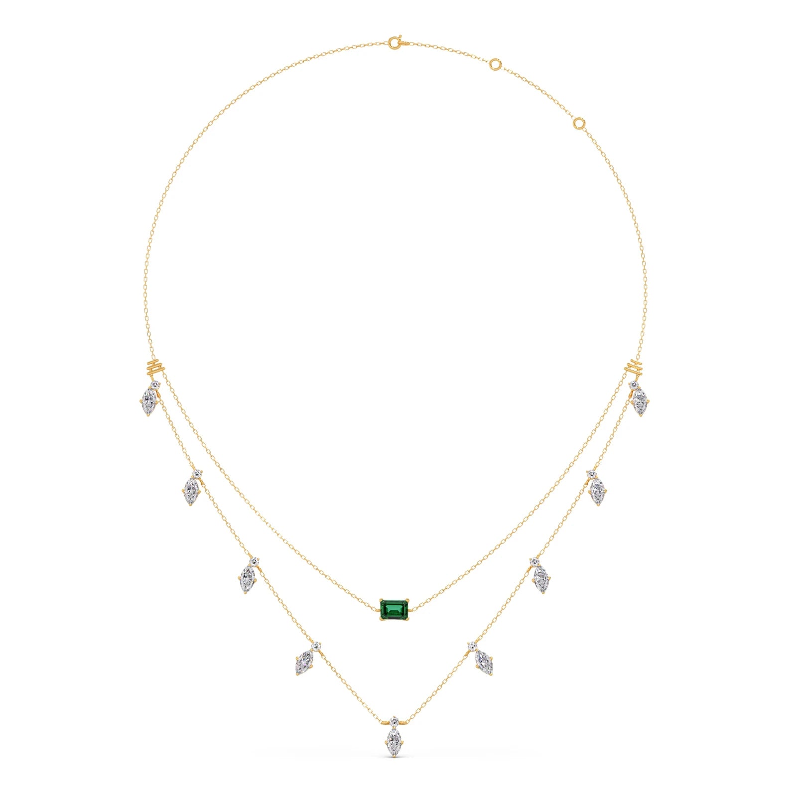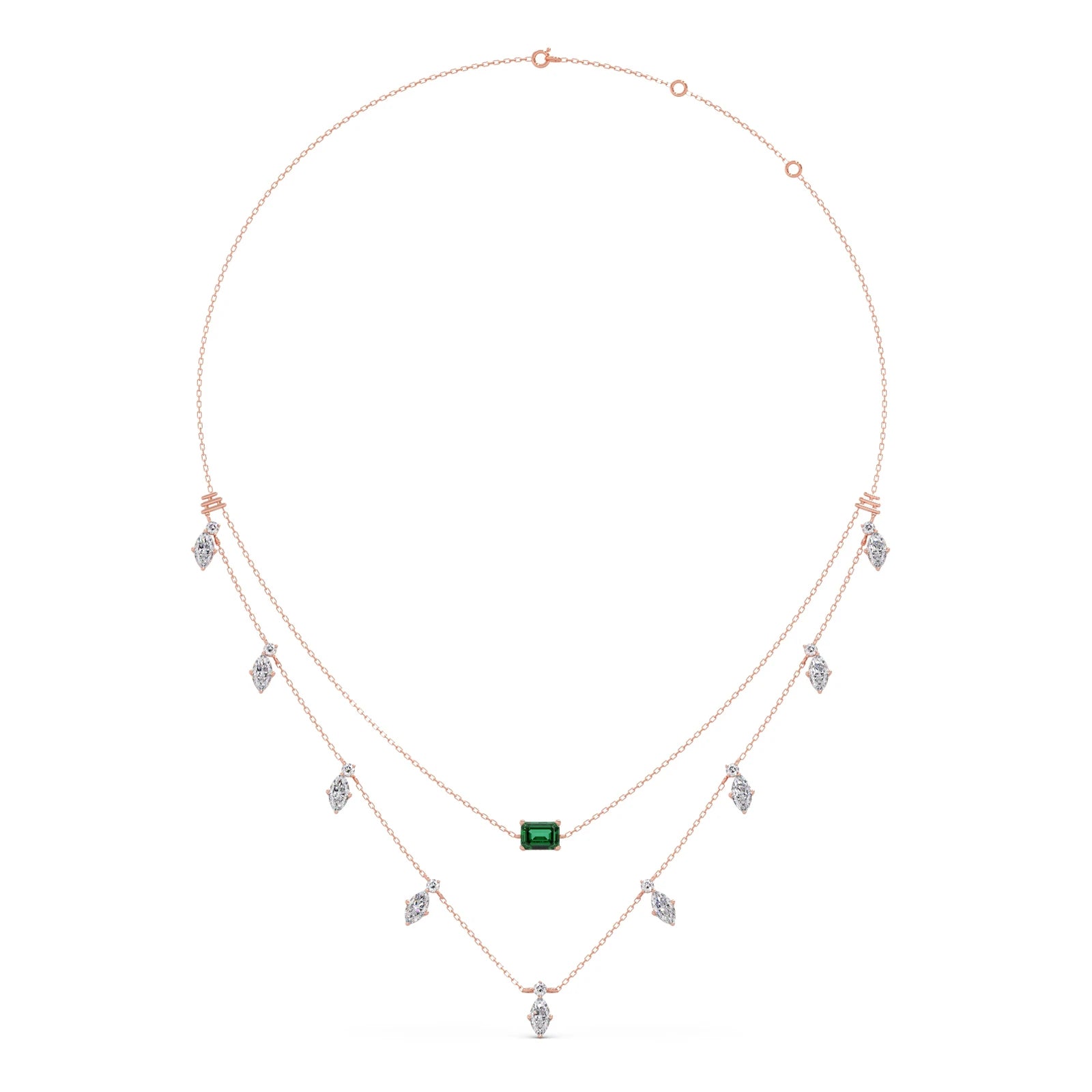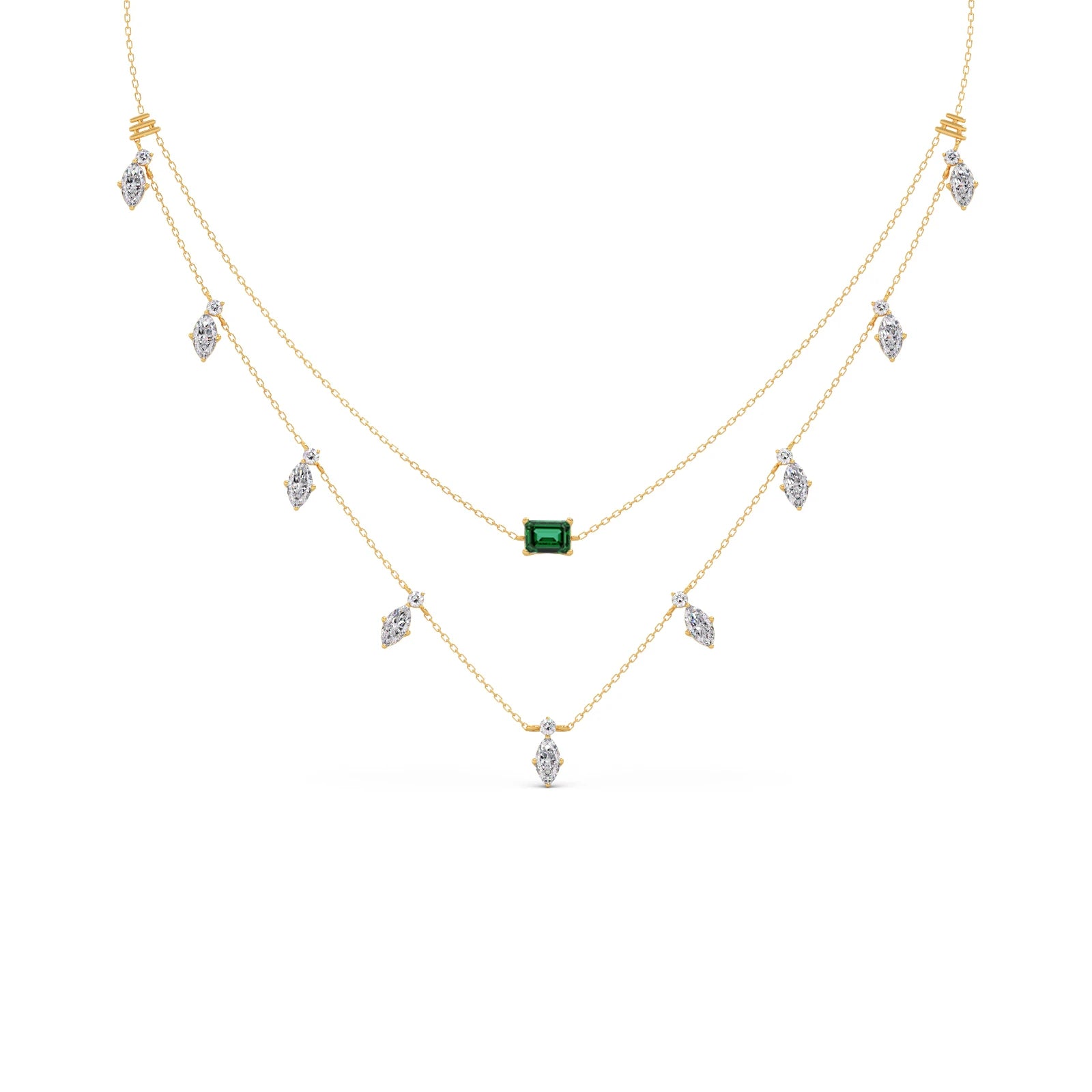 This elegant necklace features a series of sparkling diamonds in various cuts including round, marquise, and emerald gracefully dangling along a delicate chain. The combination of shapes creates a unique and eye-catching design with beautiful movement and brilliance.