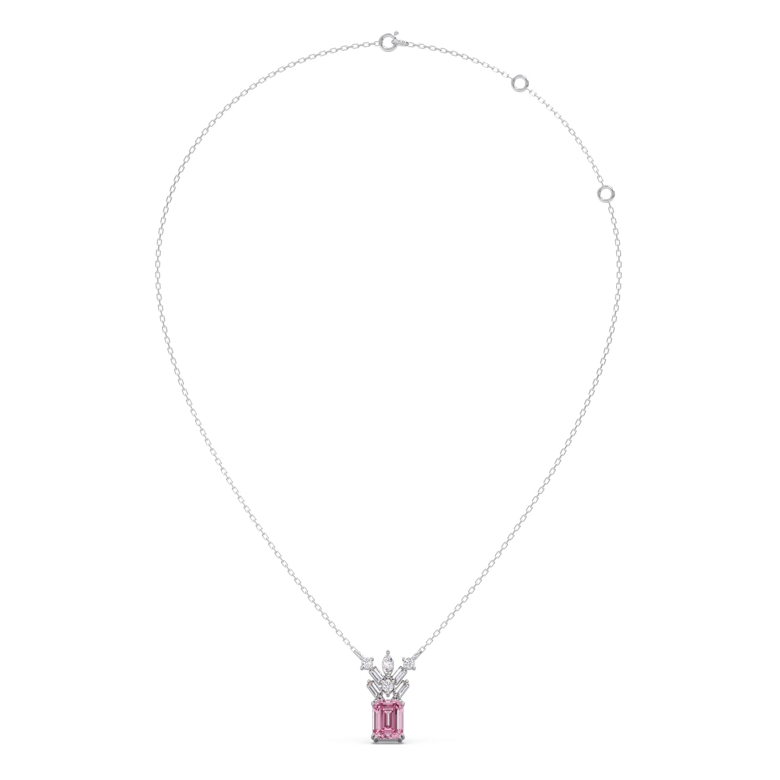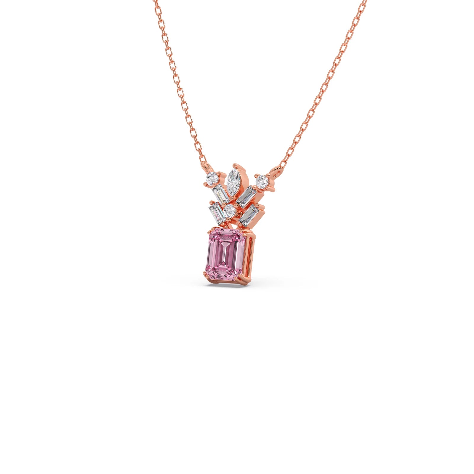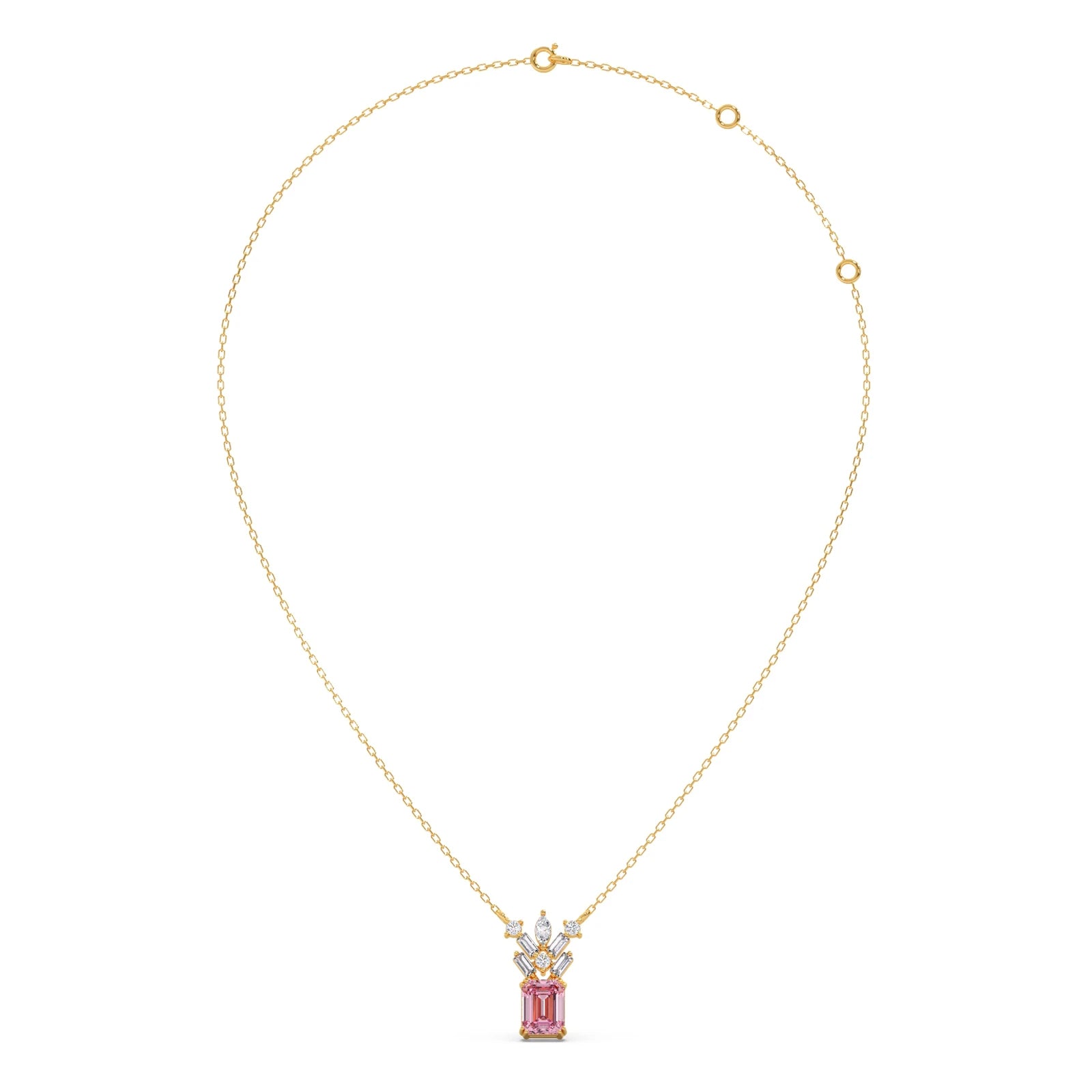 Grace your décolletage with this alluring pendant. A captivating pink gemstone is beautifully complemented by a medley of mixed-cut diamonds, creating exceptional sparkle and depth. Set in exquisite metal, this necklace offers a modern yet timeless design, perfect for elevating your everyday style or special occasions.