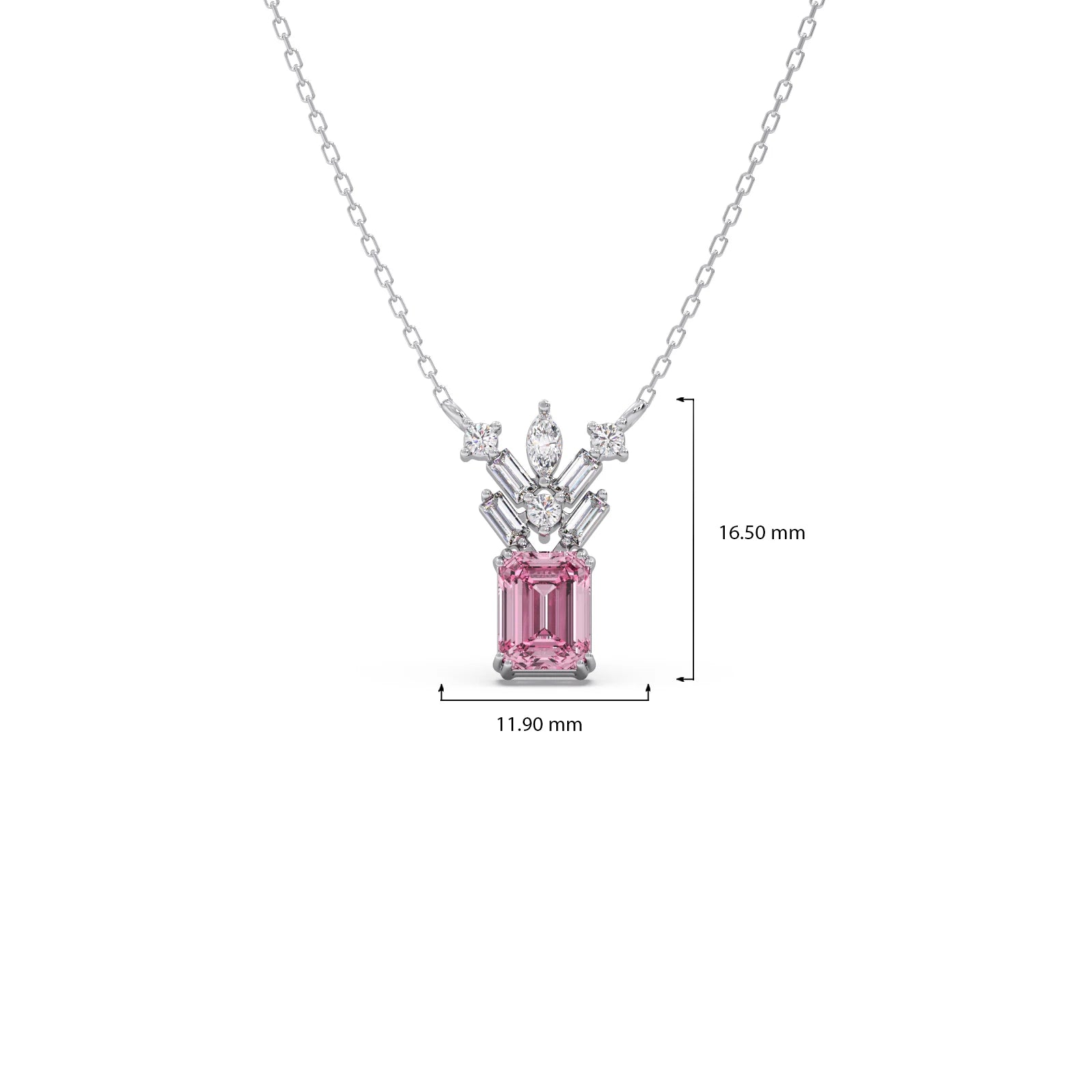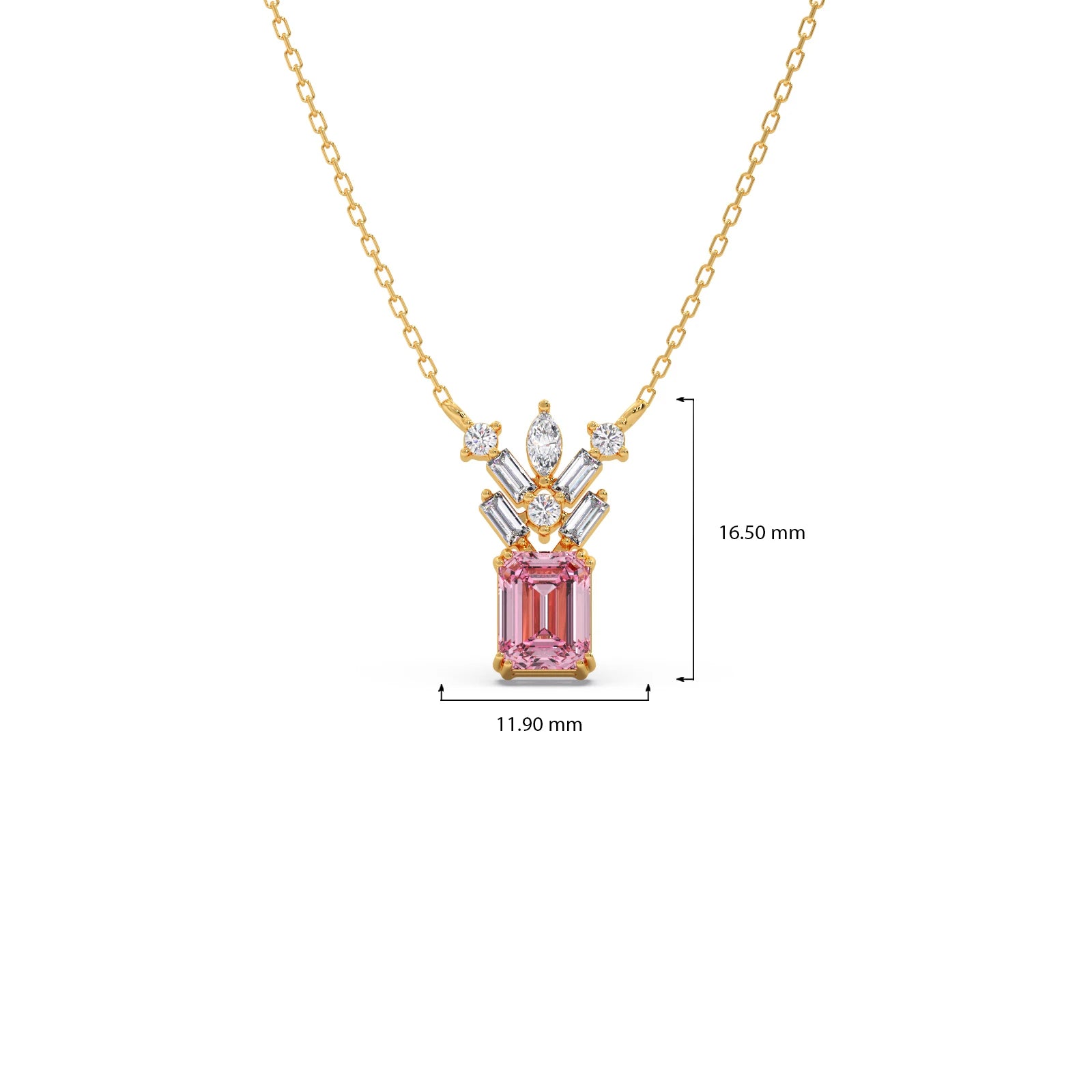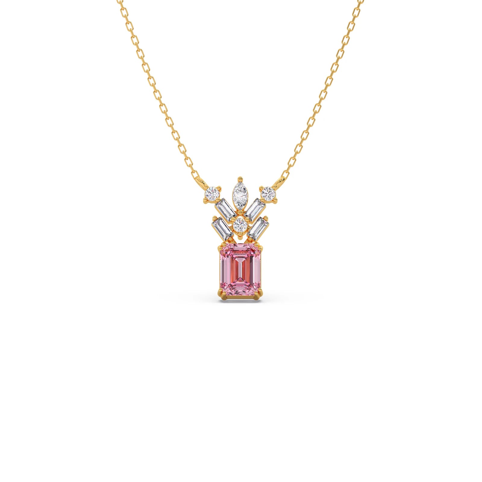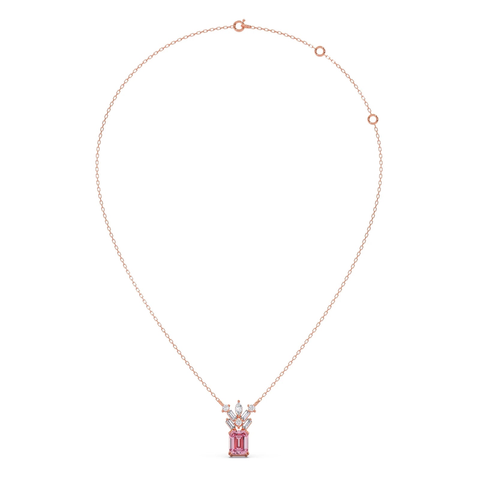 Grace your décolletage with this alluring pendant. A captivating pink gemstone is beautifully complemented by a medley of mixed-cut diamonds, creating exceptional sparkle and depth. Set in exquisite metal, this necklace offers a modern yet timeless design, perfect for elevating your everyday style or special occasions.