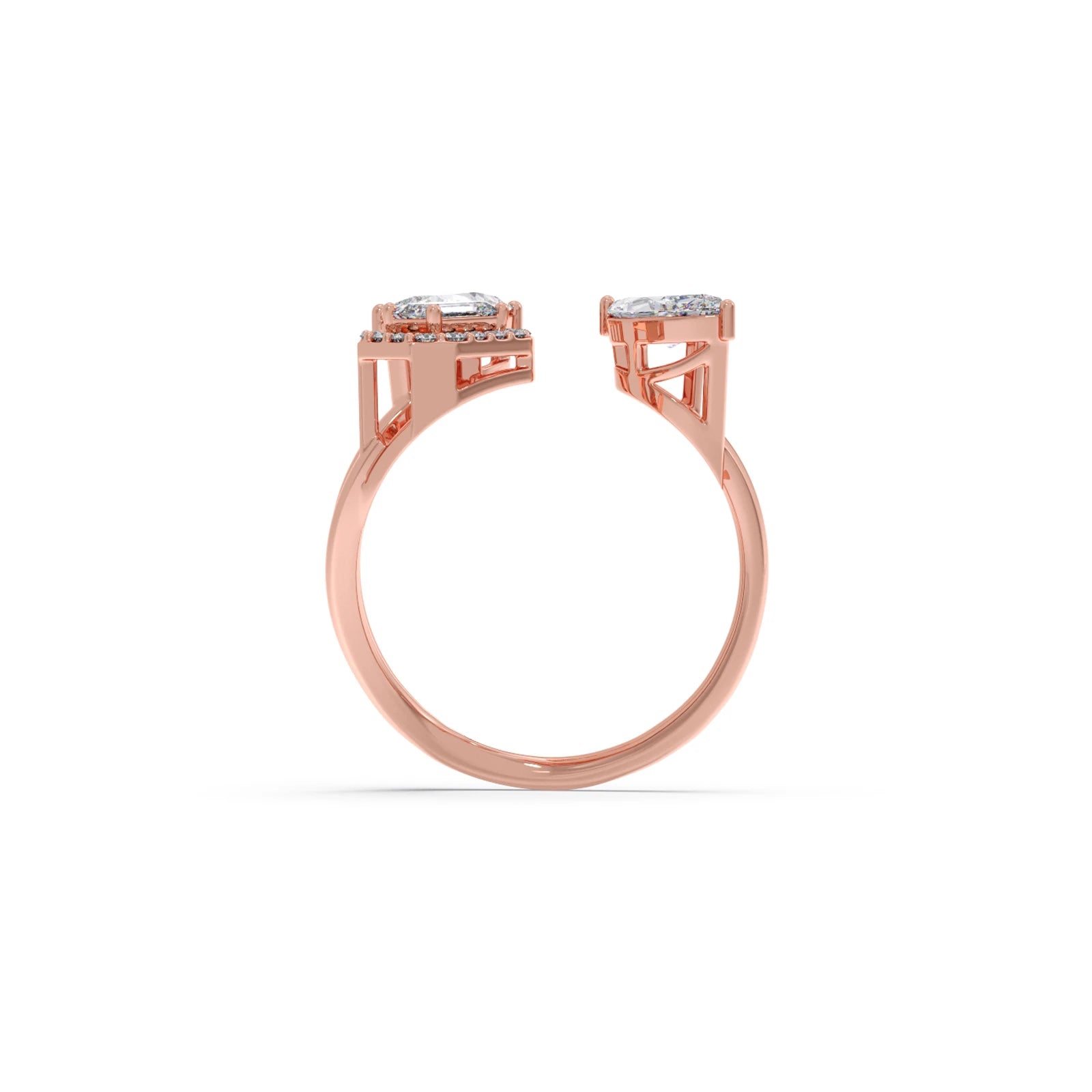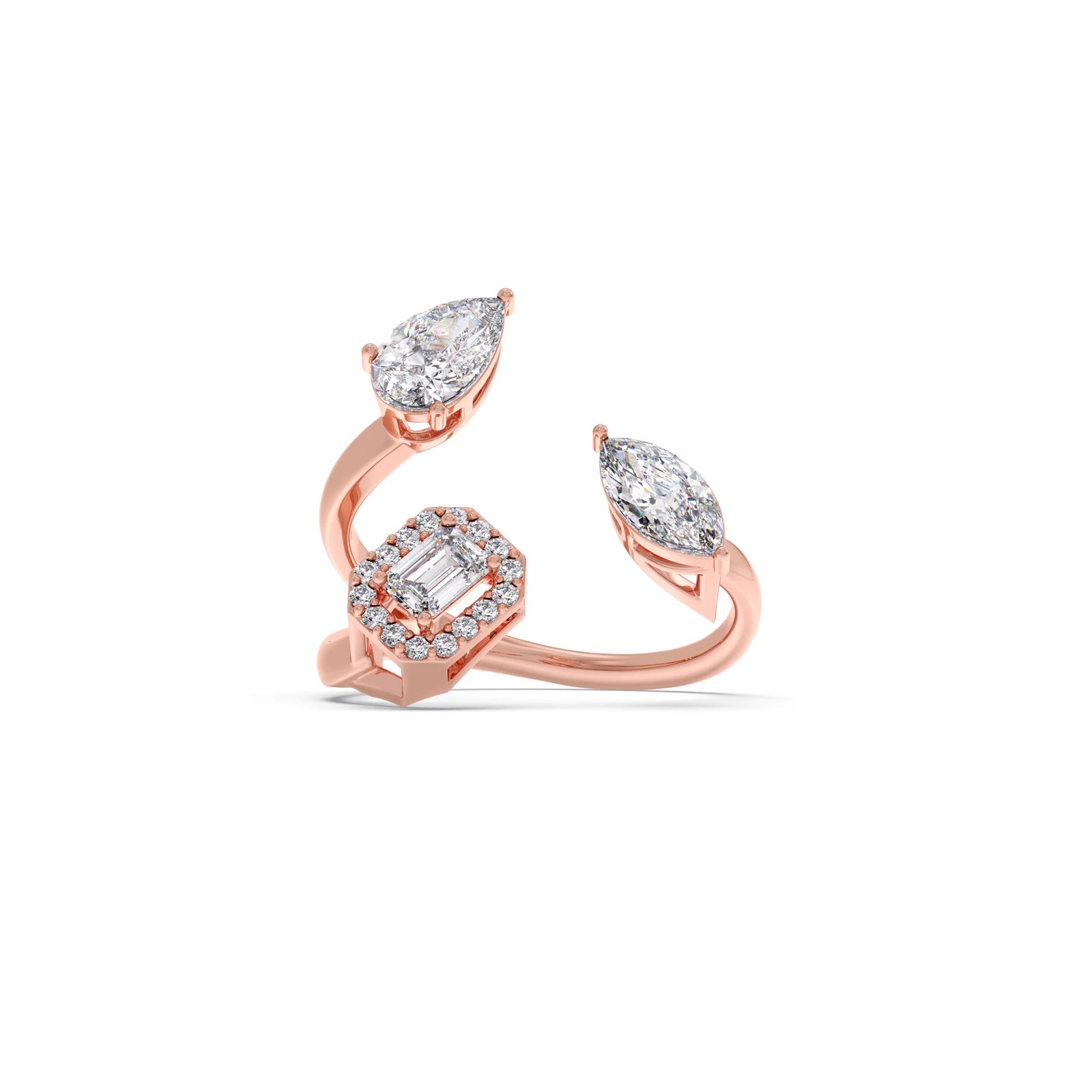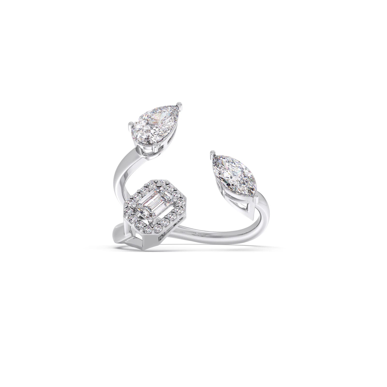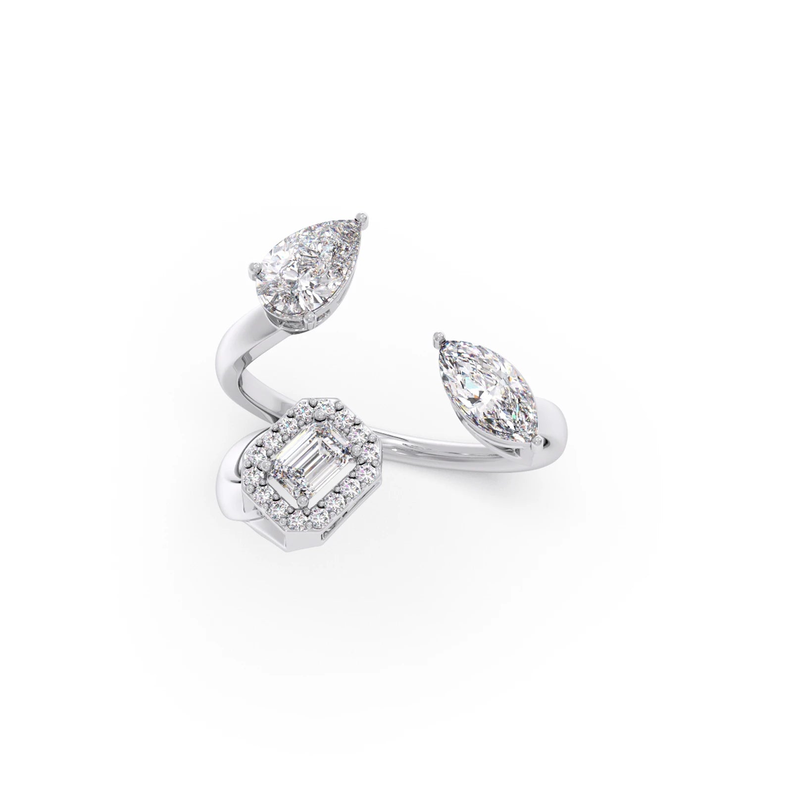A modern bypass design gracefully wraps around emerald, marquise, and pear-cut diamonds, symbolizing unity and elegance. This artistic multi-stone ring blends timeless romance with contemporary style, perfect for those drawn to refined, modern brilliance.