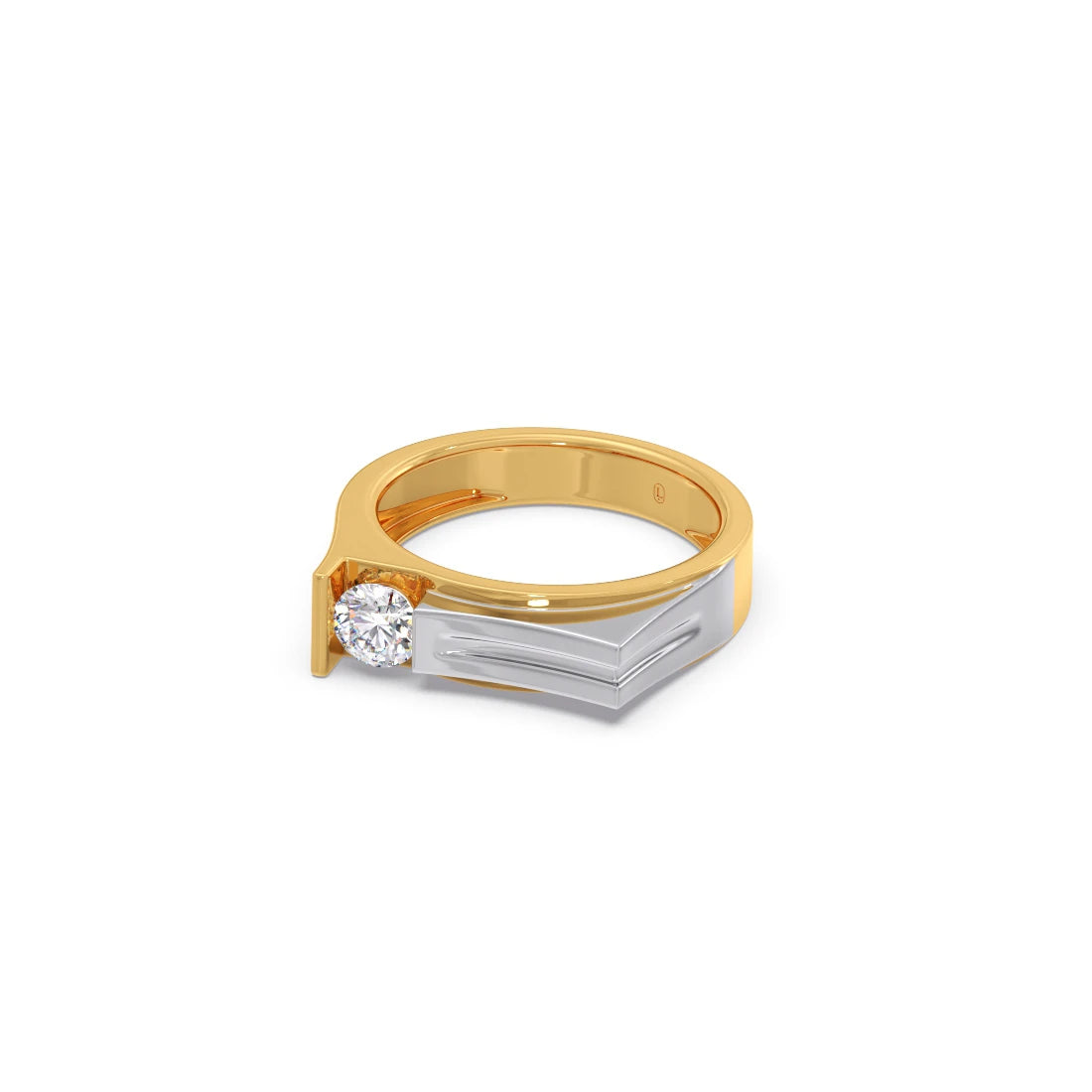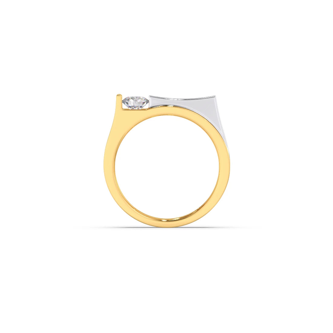 Men's ring featuring a round, brilliant-cut diamond solitaire set in a yellow gold bezel. The ring band is also yellow gold, with a unique design element of two parallel white gold bars extending diagonally across the top, adding a modern touch.