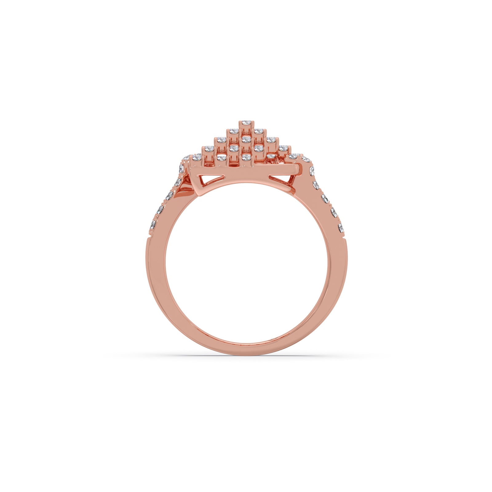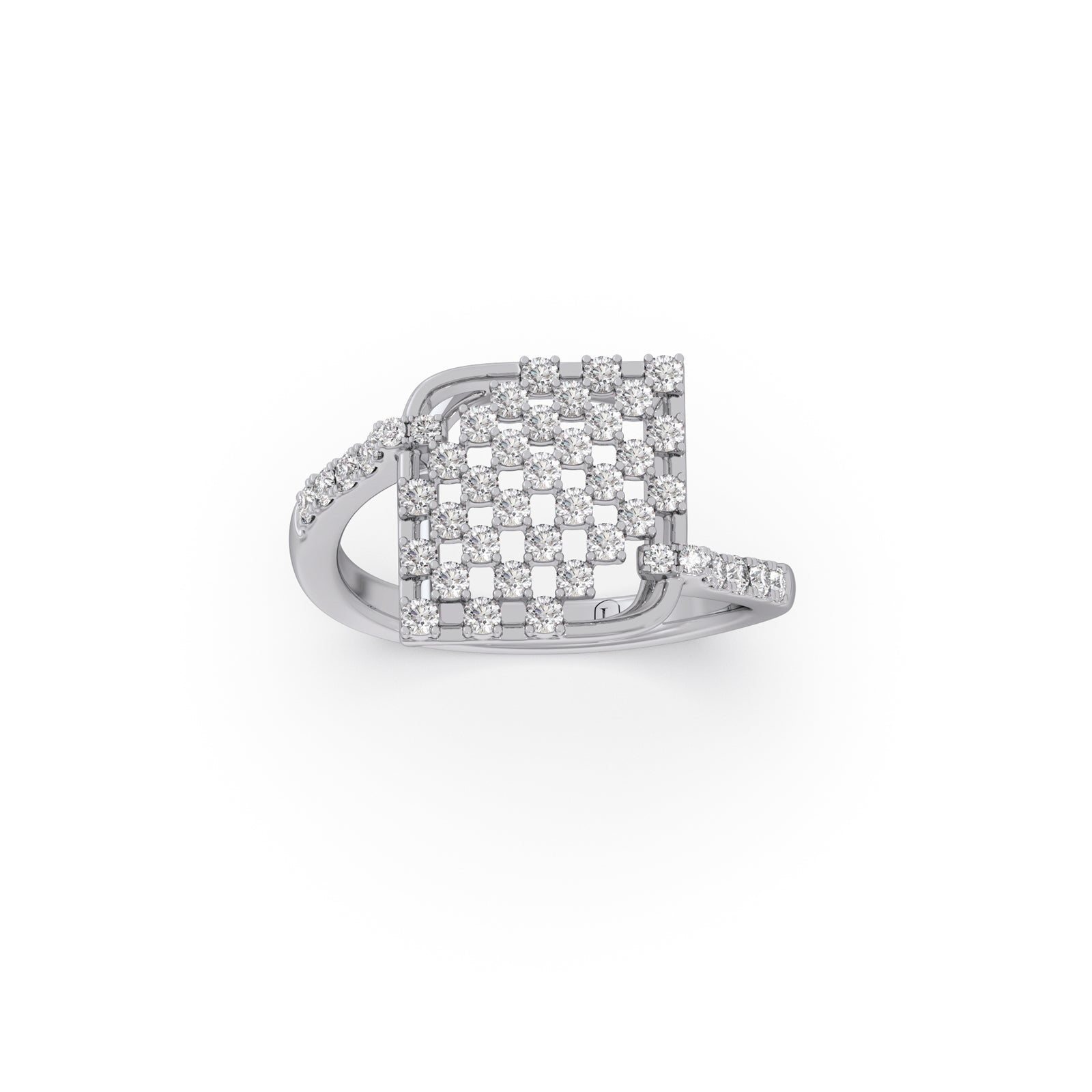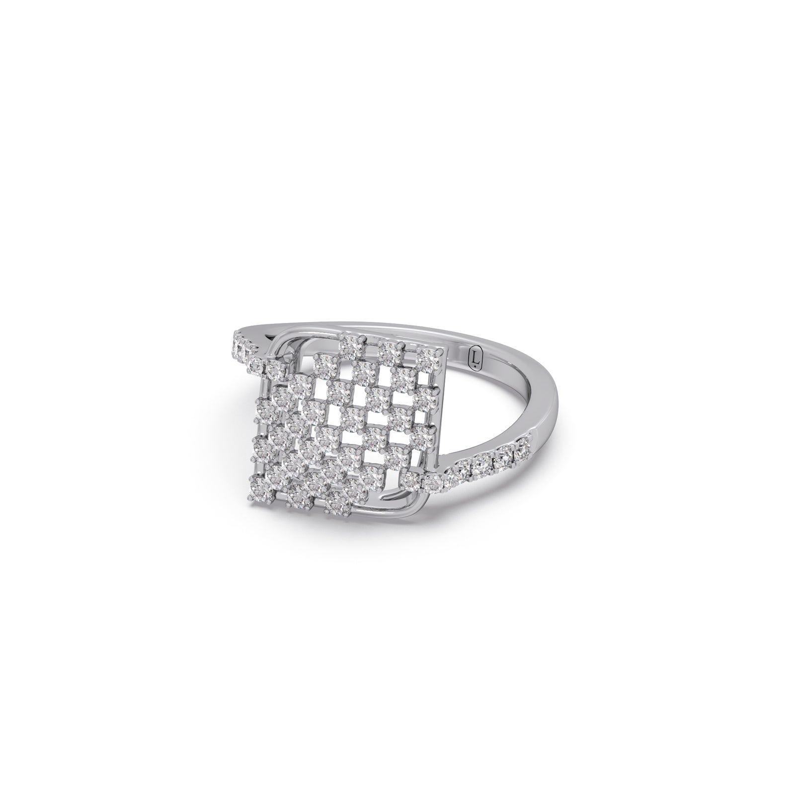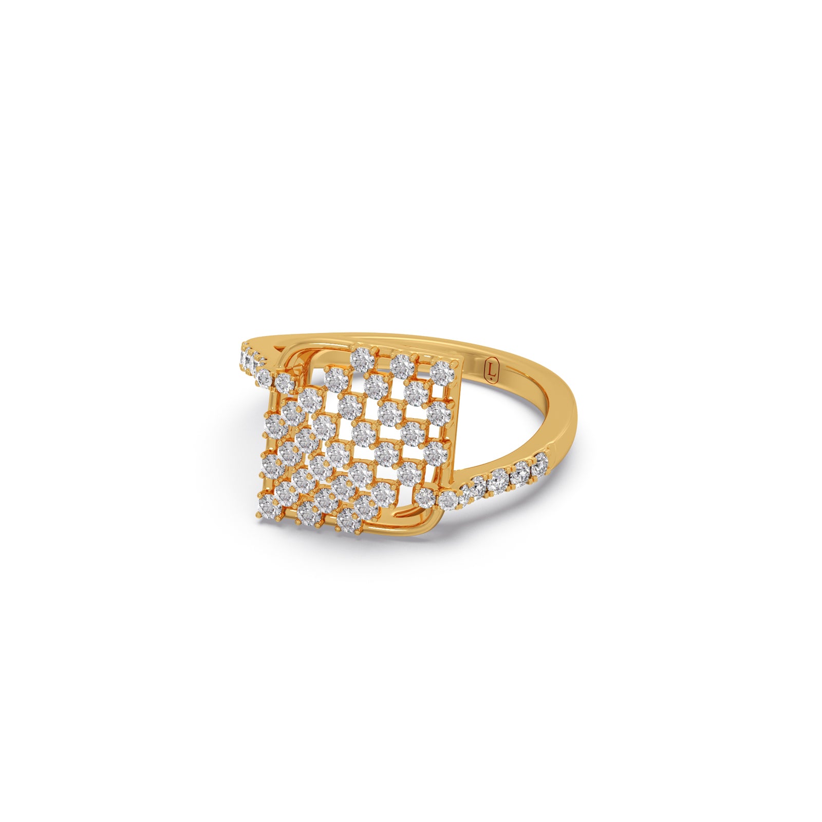 This ring features a prominent rectangular grid pattern set at center of band, embellished with 0.608ct. brilliant Round-cut diamonds. Each diamond is secured in a prong setting at the intersections of the gold lattice, creating a shimmering, textured surface. This is a statement piece suitable for evening wear, cocktail parties, or festive occasions.