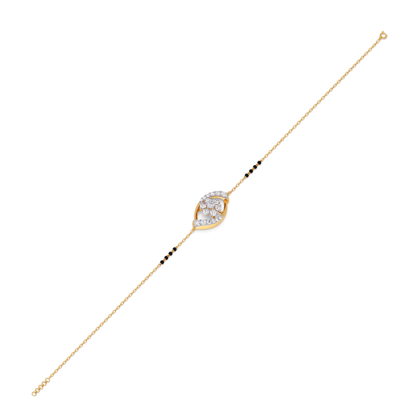 This Nitya Cluster Diamond Mangalsutra Bracelet features a delicate and contemporary Mangalsutra bracelet. The elegant, marquise shape frame crafted in row of shimmering roun-cut diamonds. Inside the frame sits a floral cluster of round diamonds. It is secured with a classic spring ring clasp and includes an adjustable length extender to ensure a comfortable fit on the wrist.