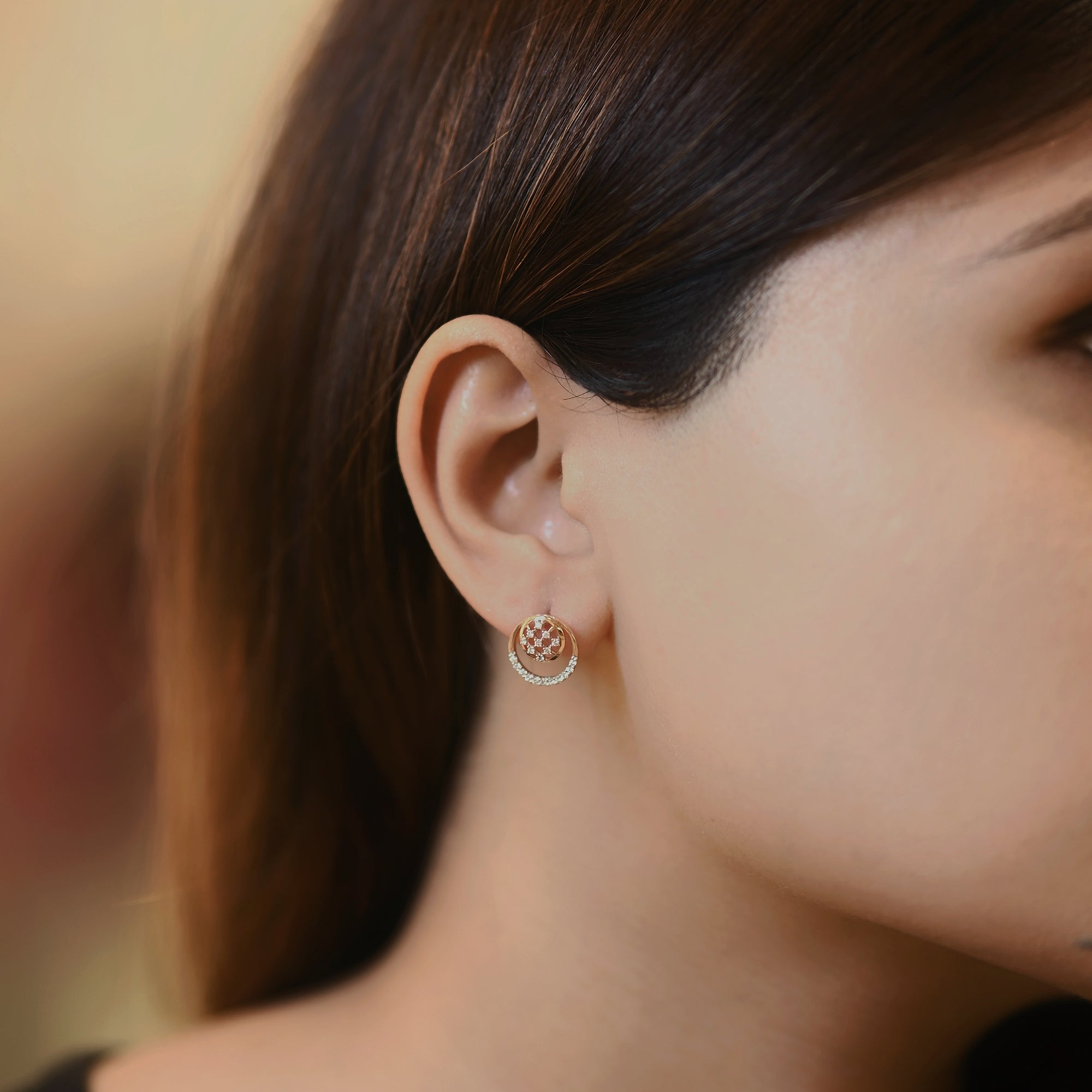 Elegant and modern, these stud earrings feature a unique double-circle design. The inner circle showcases a cluster of brilliant round-cut diamonds, while the outer semi-circle is adorned with a pave setting of sparkling diamonds. Crafted in polished gold, these earrings are a perfect blend of classic and contemporary style.