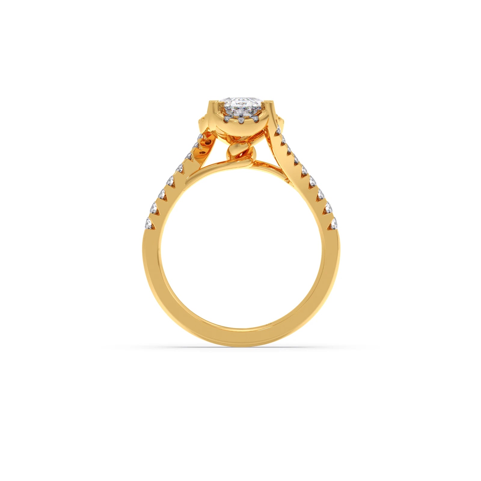 A radiant oval-cut diamond takes center stage, encircled by a shimmering halo. The yellow gold band is elegantly set with sparkling round diamonds, creating a harmonious blend of shape and brilliance. A captivating symbol of love.
