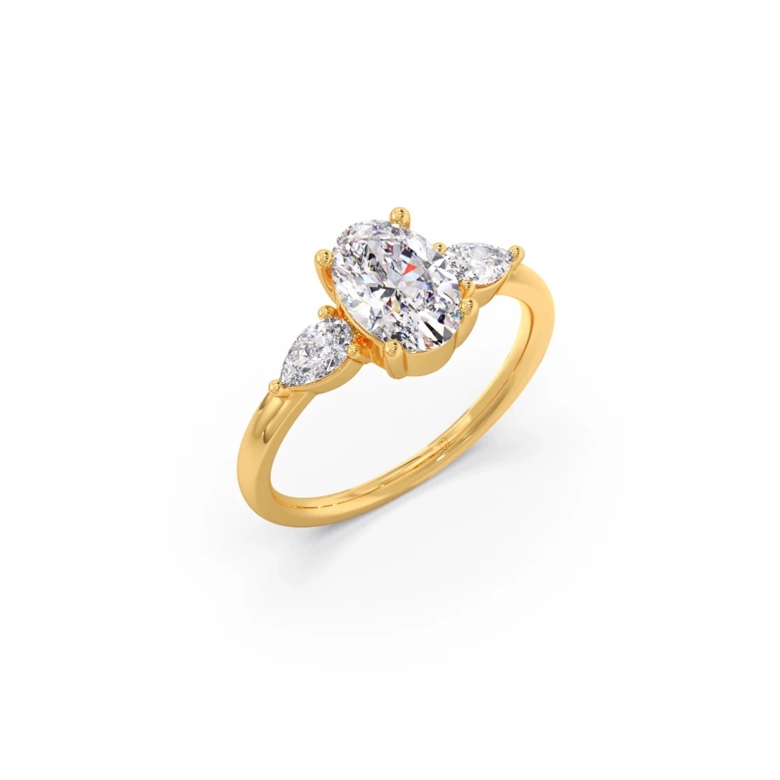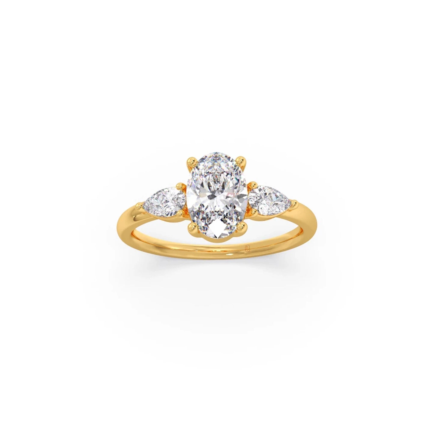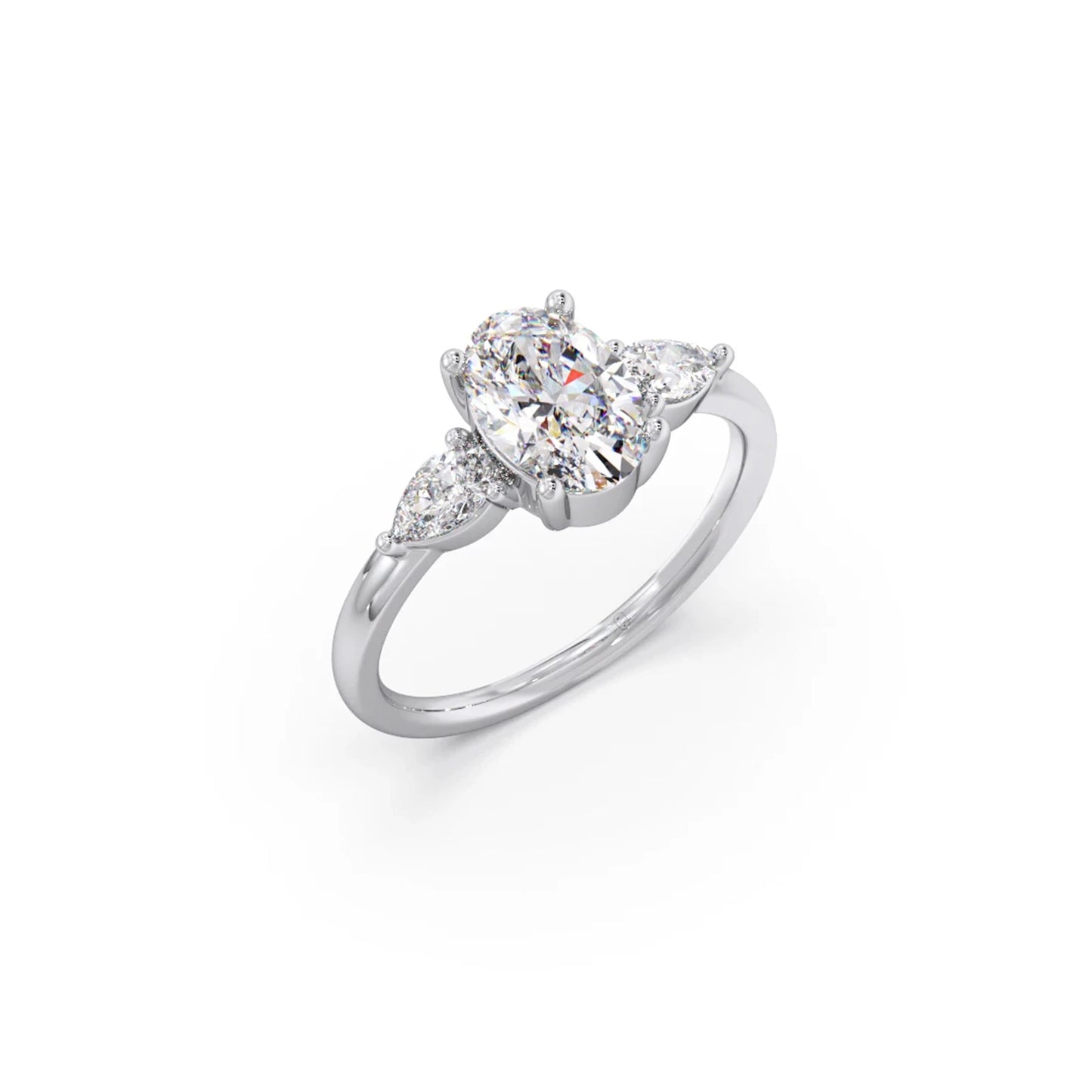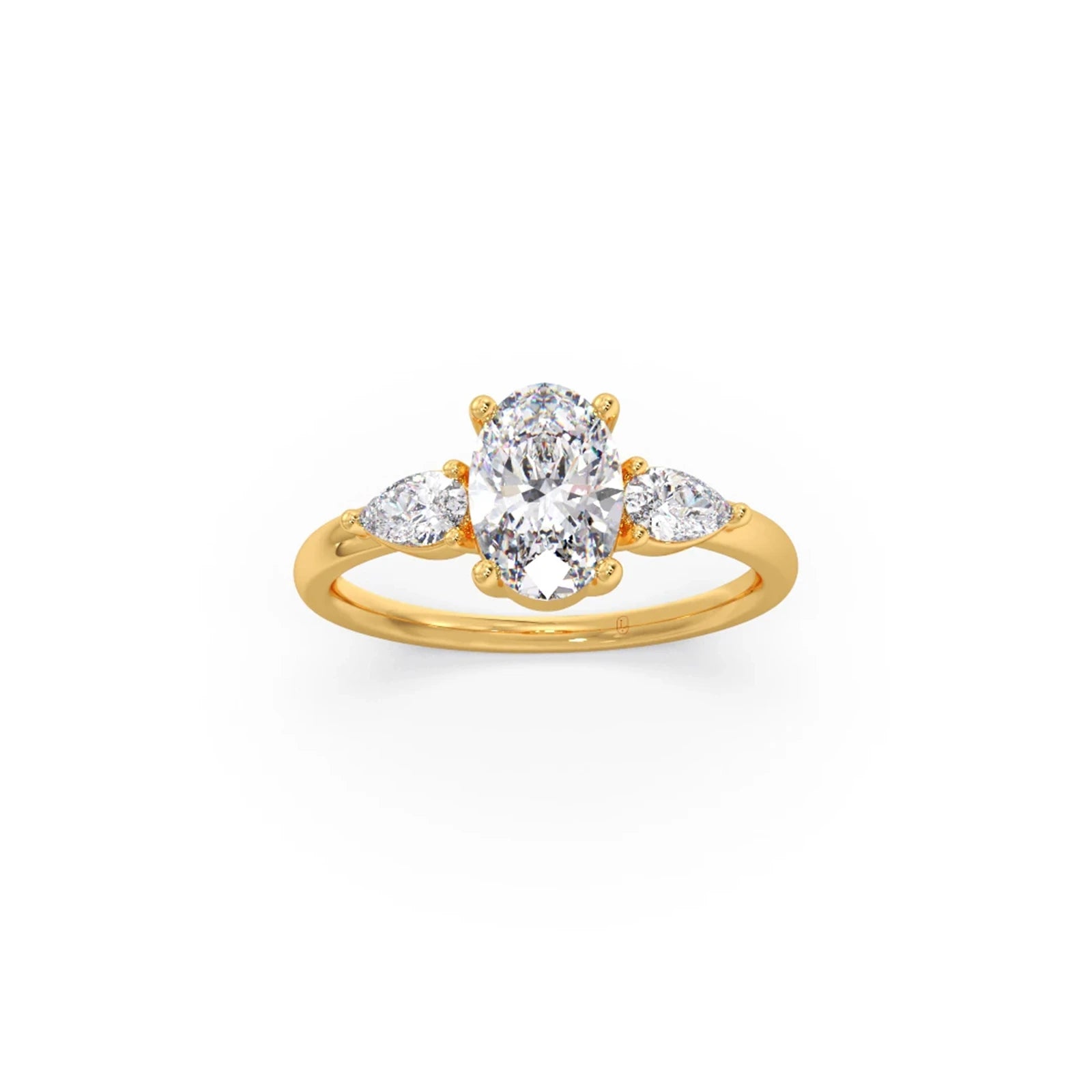 Timeless and romantic, our Oval Cut Three Stone Engagement Ring features a captivating Oval-cut center diamond, flanked by Two Sparkling Pear-shaped side stones—symbolizing the past, present, and future✨