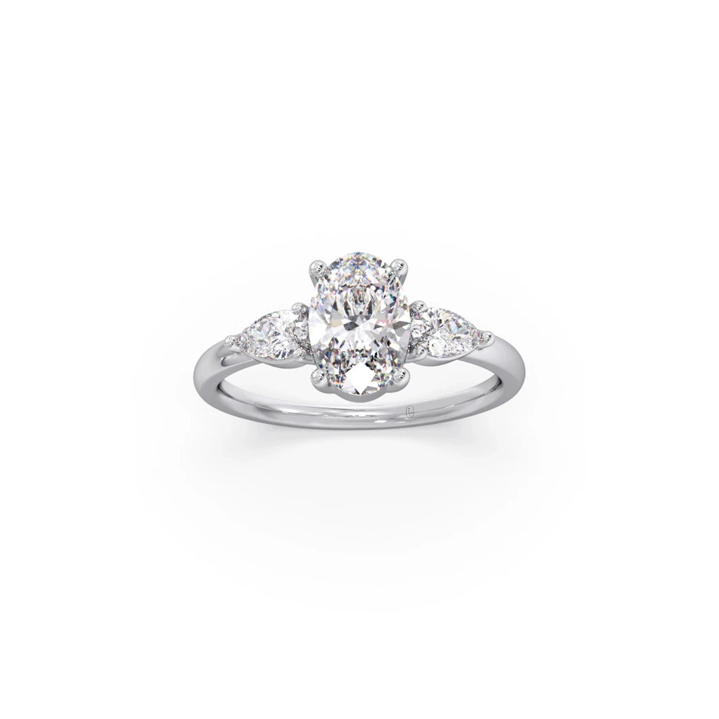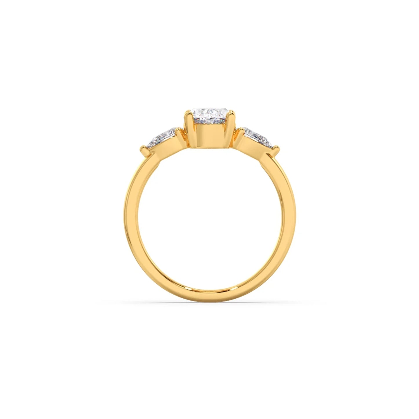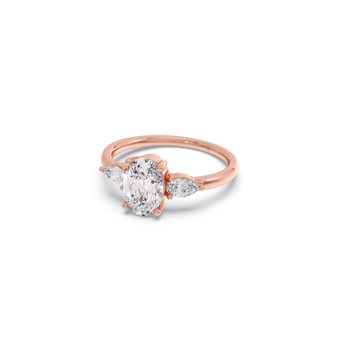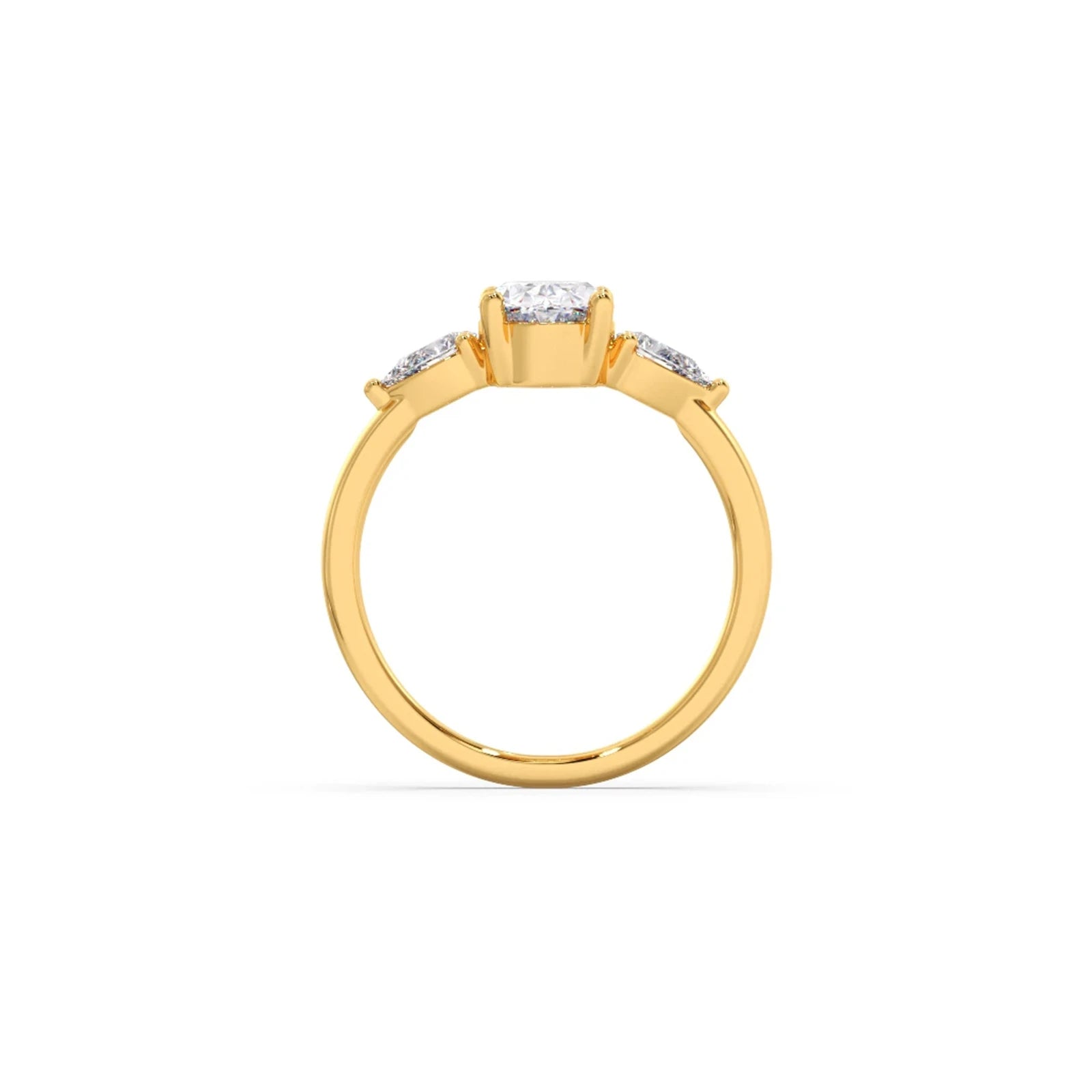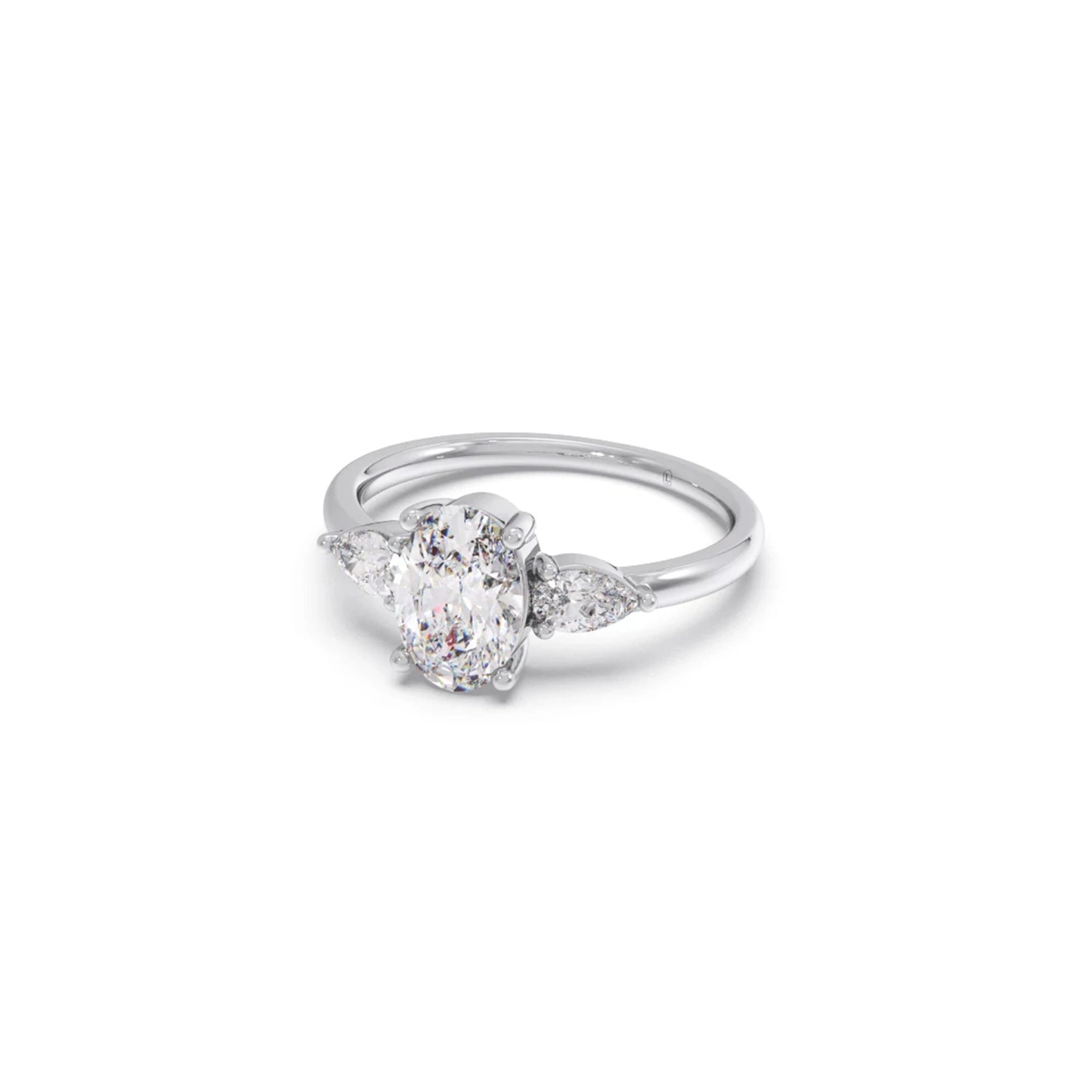 Timeless and romantic, our Oval Cut Three Stone Engagement Ring features a captivating Oval-cut center diamond, flanked by Two Sparkling Pear-shaped side stones—symbolizing the past, present, and future✨